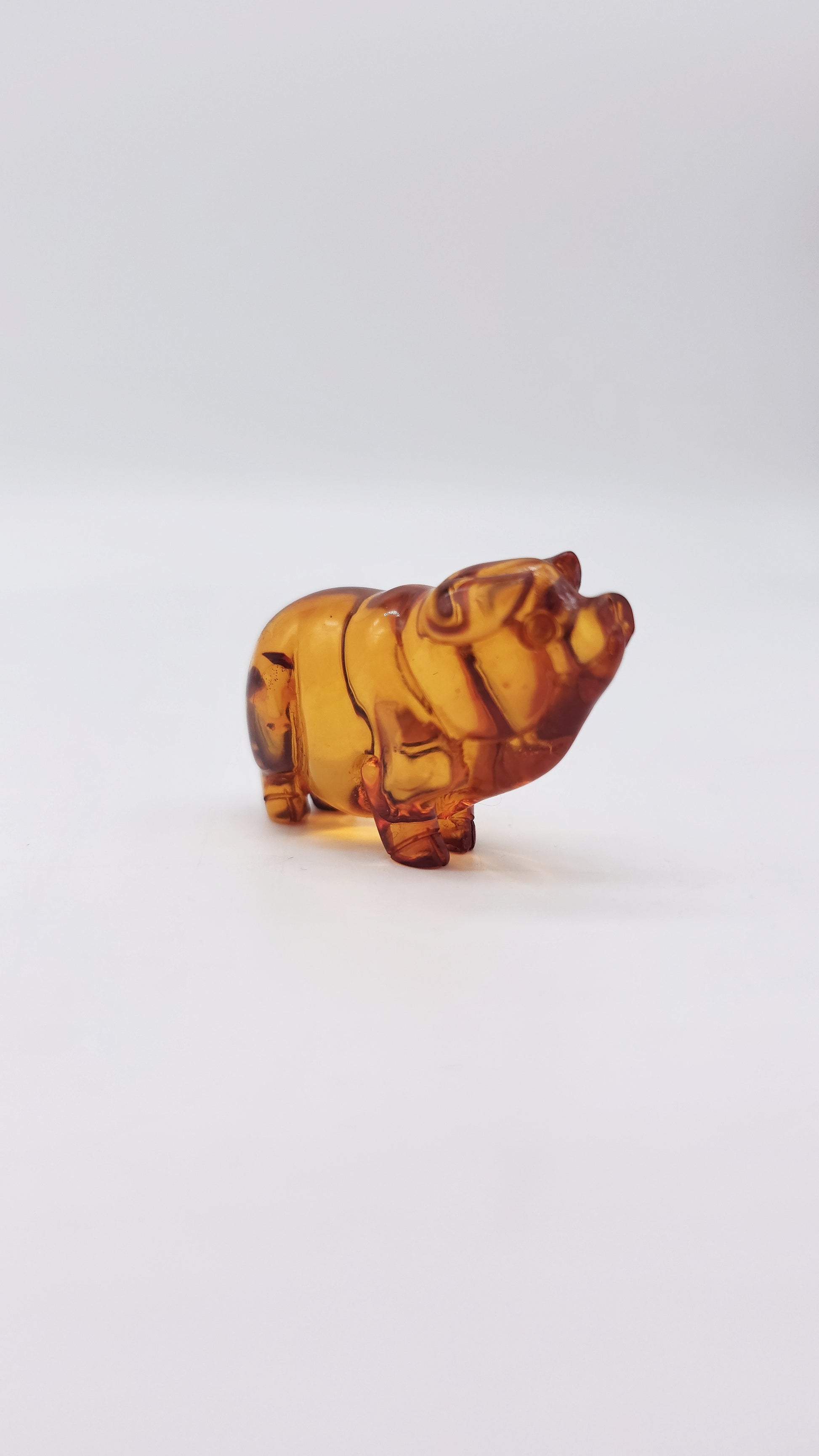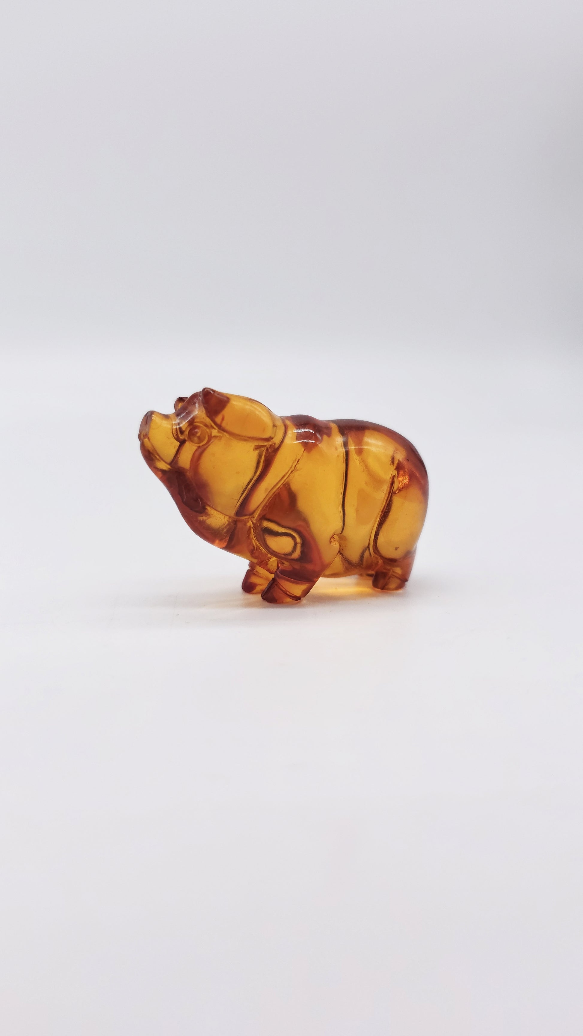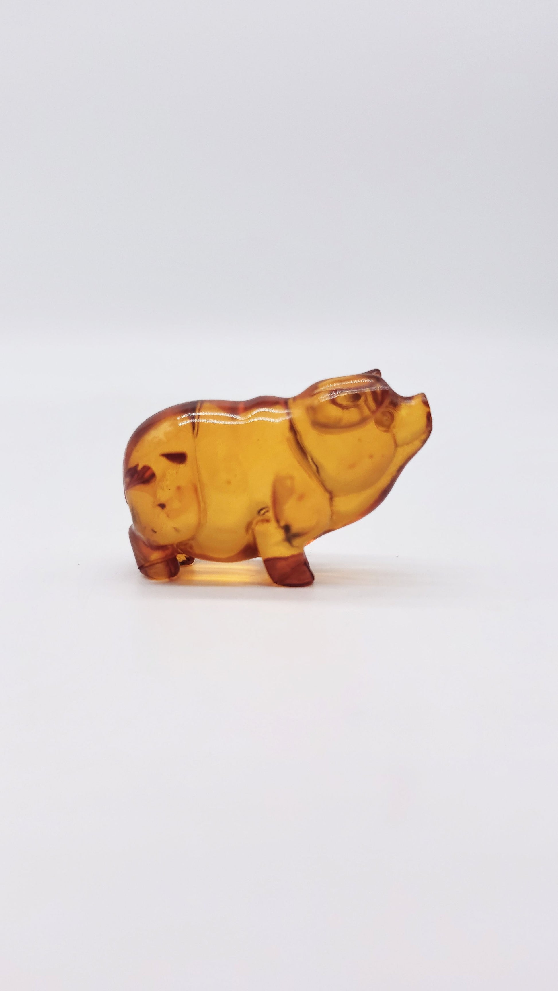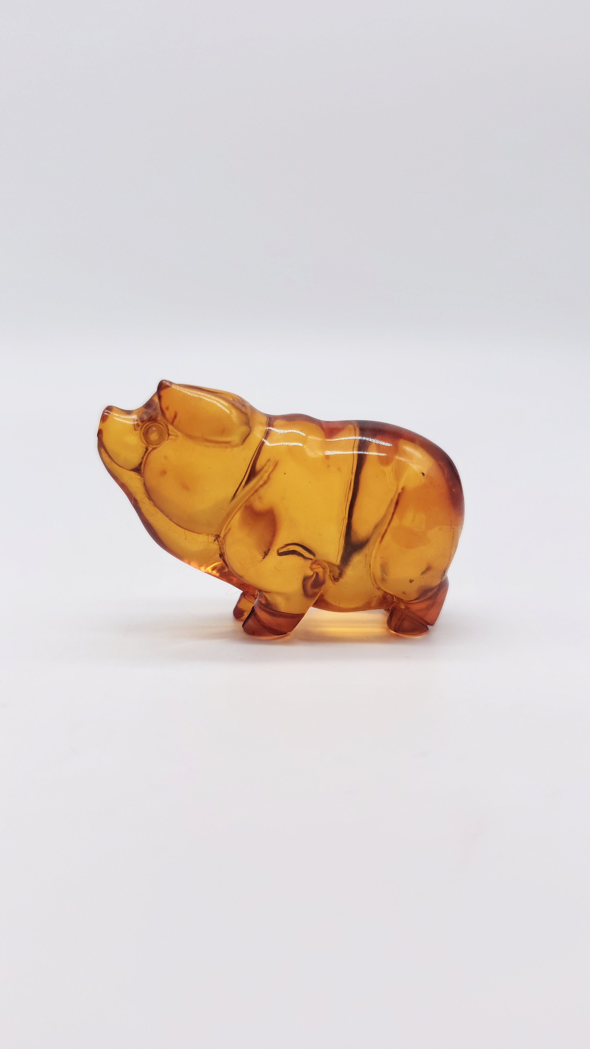 This hand-crafted amber figurine in the shape of a pig is a special work of art made from genuine Baltic amber . Measuring 5 cm x 2 cm x 3.5 cm and with a warm natural amber color, the pig symbolizes prosperity, luck and success . In many cultures, the pig stands for wealth, abundance and family happiness , which is why this figurine is considered a talisman for financial stability and success in life . This fine amber animal figurine is a wonderful gift for people who strive for material security, happiness and a fulfilling life . Perfect as a protective amulet, collector's item or decorative element , this figurine brings positive energy into your home. Order your hand-carved amber figurine pig now and secure a powerful symbol of prosperity and luck.