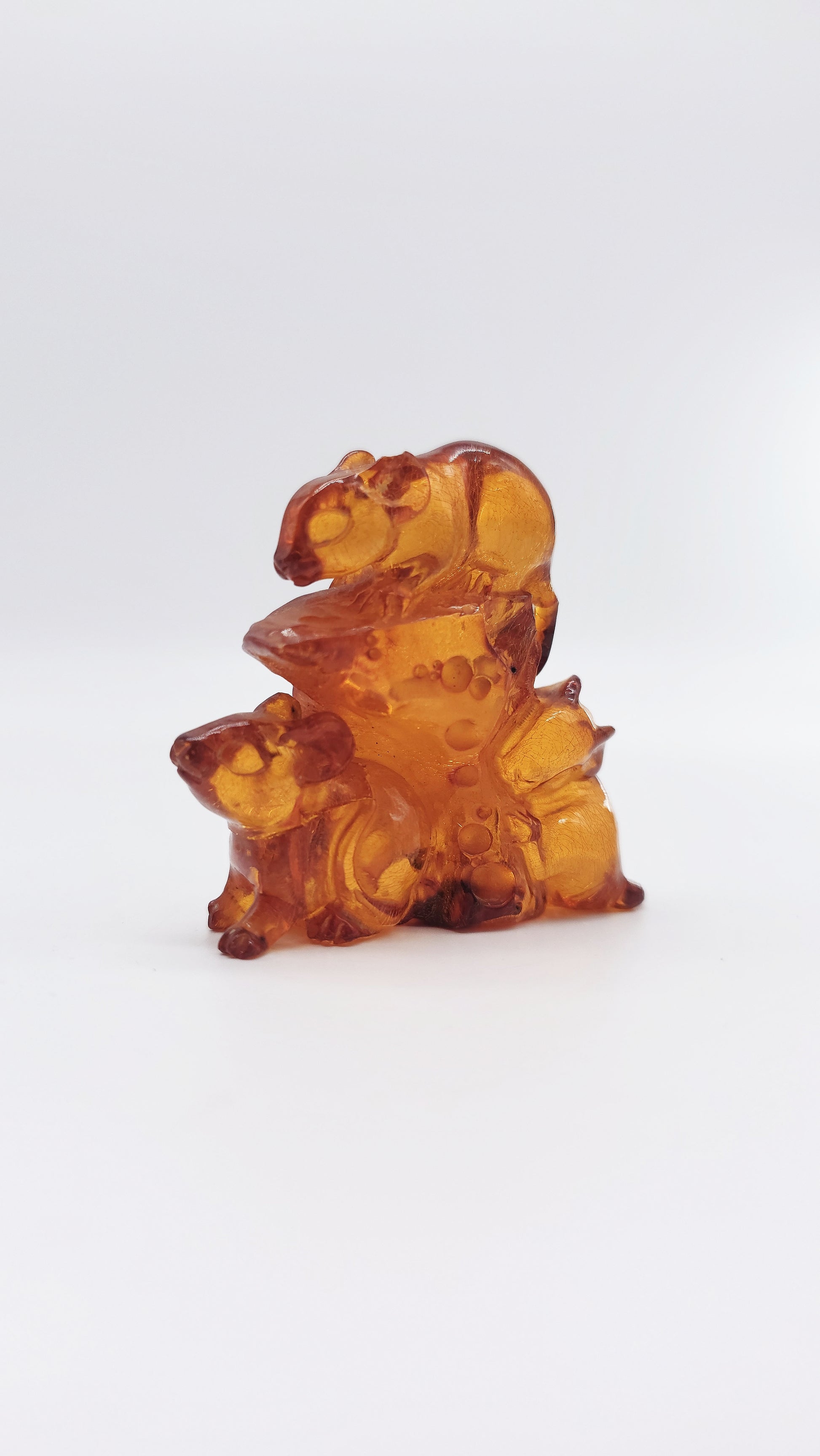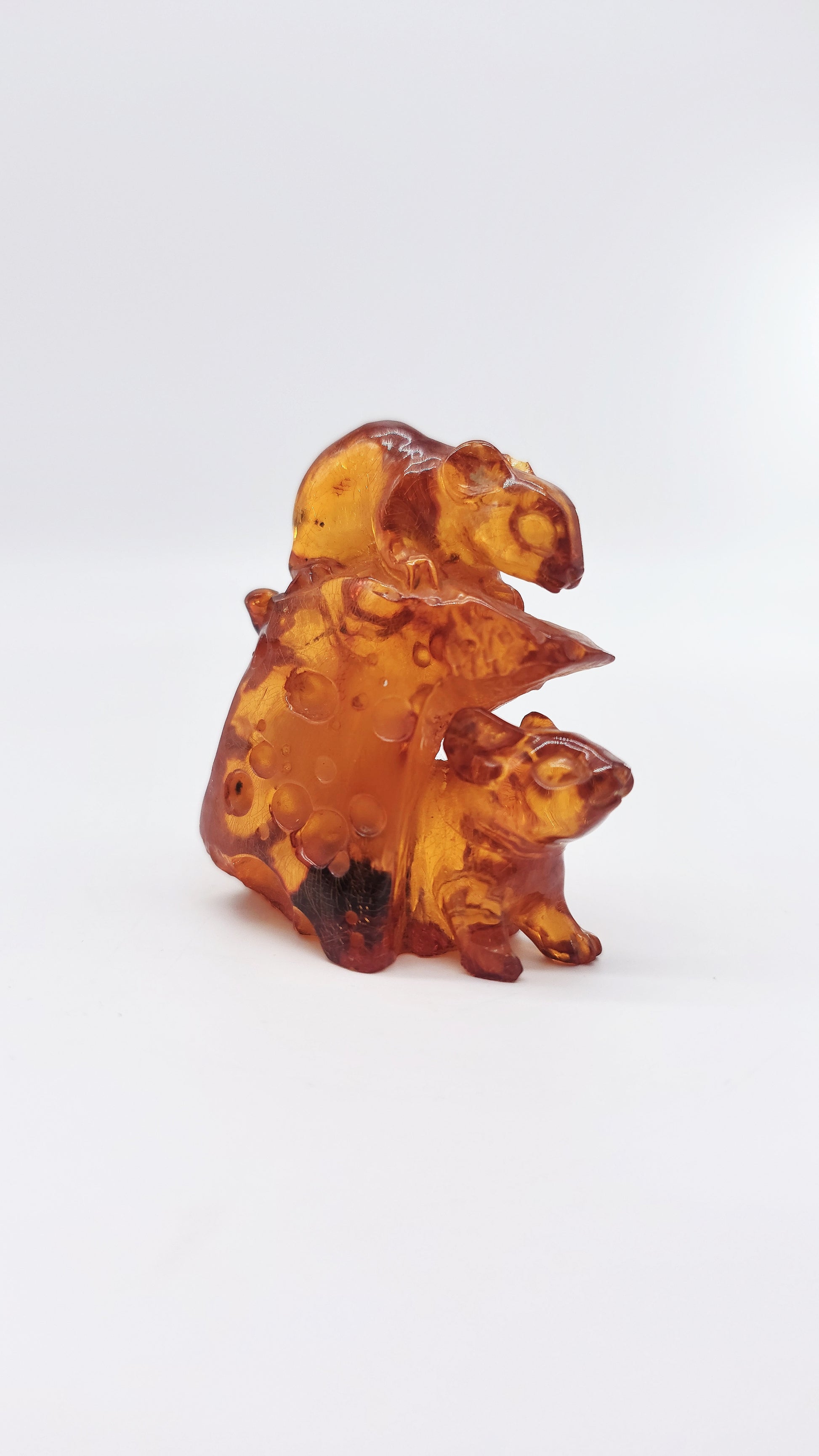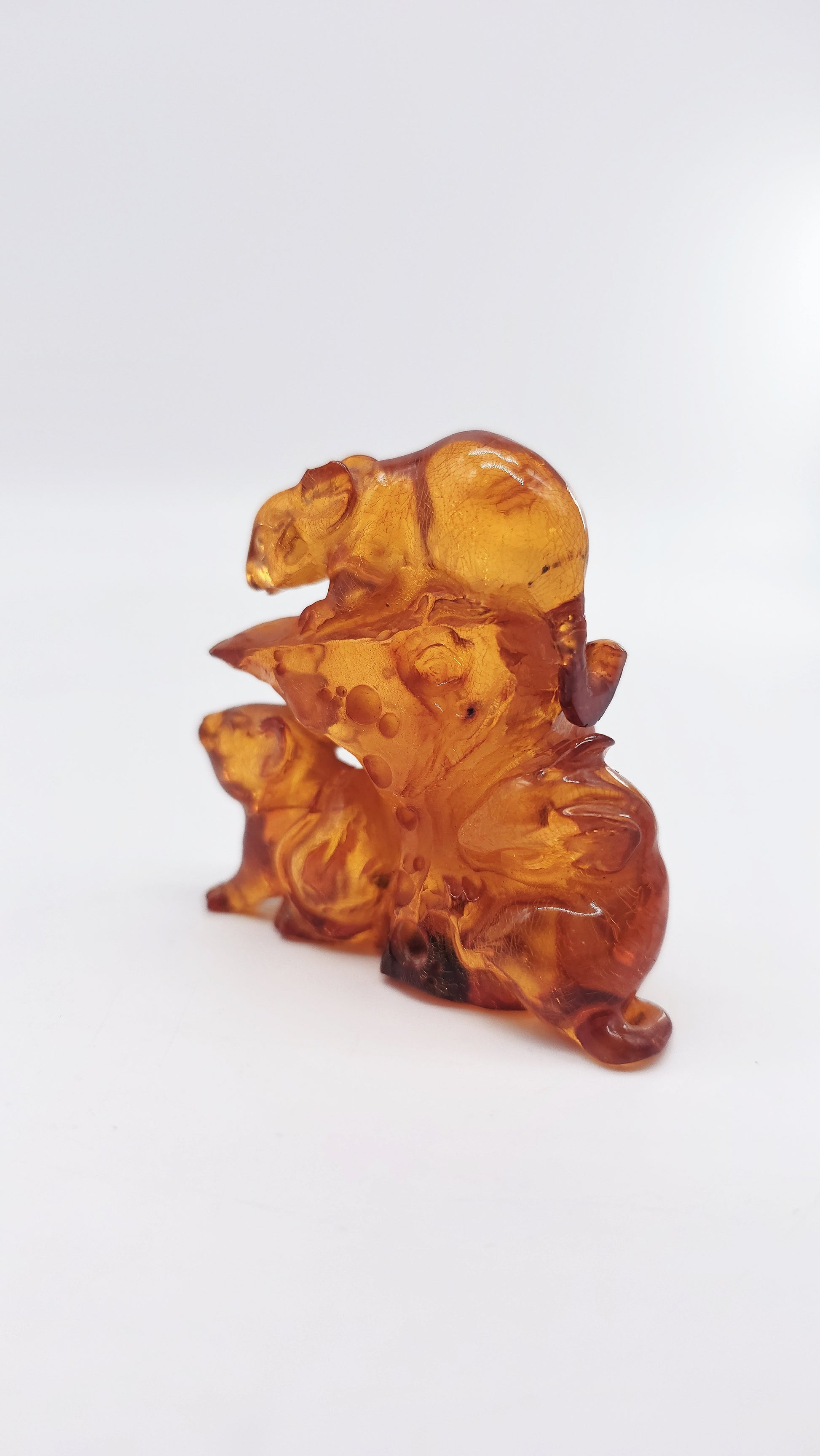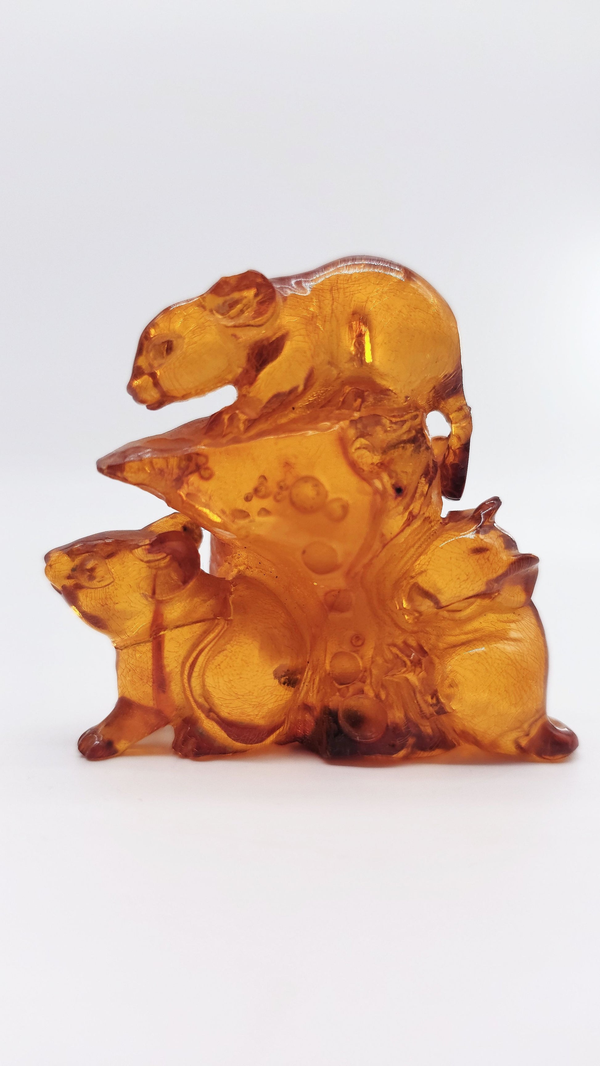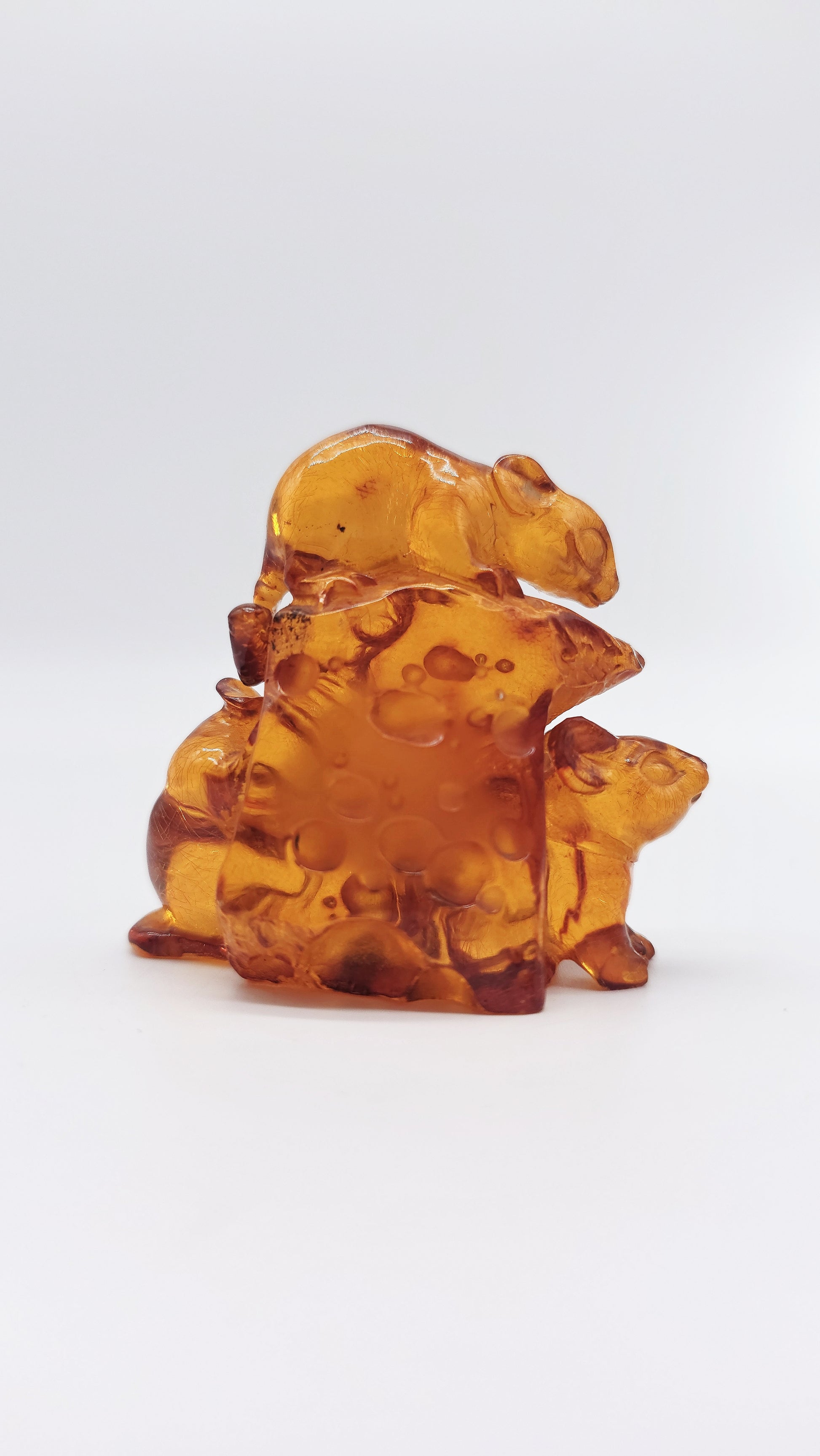This handcrafted amber figurine featuring three mice on a piece of cheese is a unique work of art made from genuine Baltic amber . The delicate depiction symbolizes wisdom, skill, and wealth , while the cheese stands for abundance and success . Measuring 5.5 cm x 5.5 cm x 2.5 cm, this figurine is perfect as a lucky charm, collector's item, or stylish decoration . In many cultures, mice are symbols of intelligence, adaptability, and teamwork —they always find a way to achieve their goals. An exceptional gift for businesspeople, strategists, and creative minds who are always looking to identify and capitalize on new opportunities.