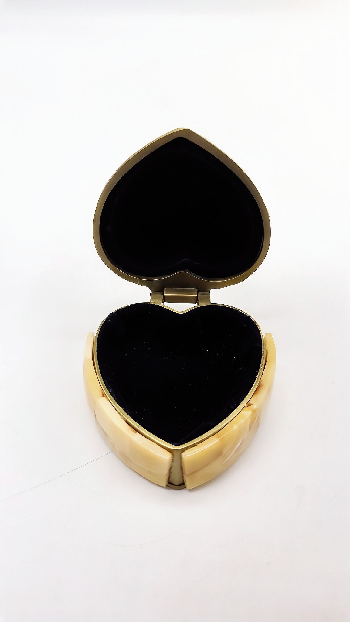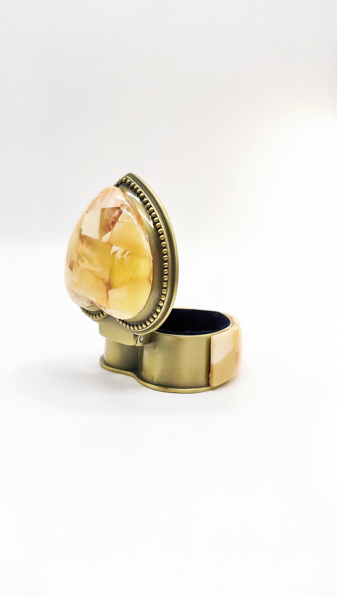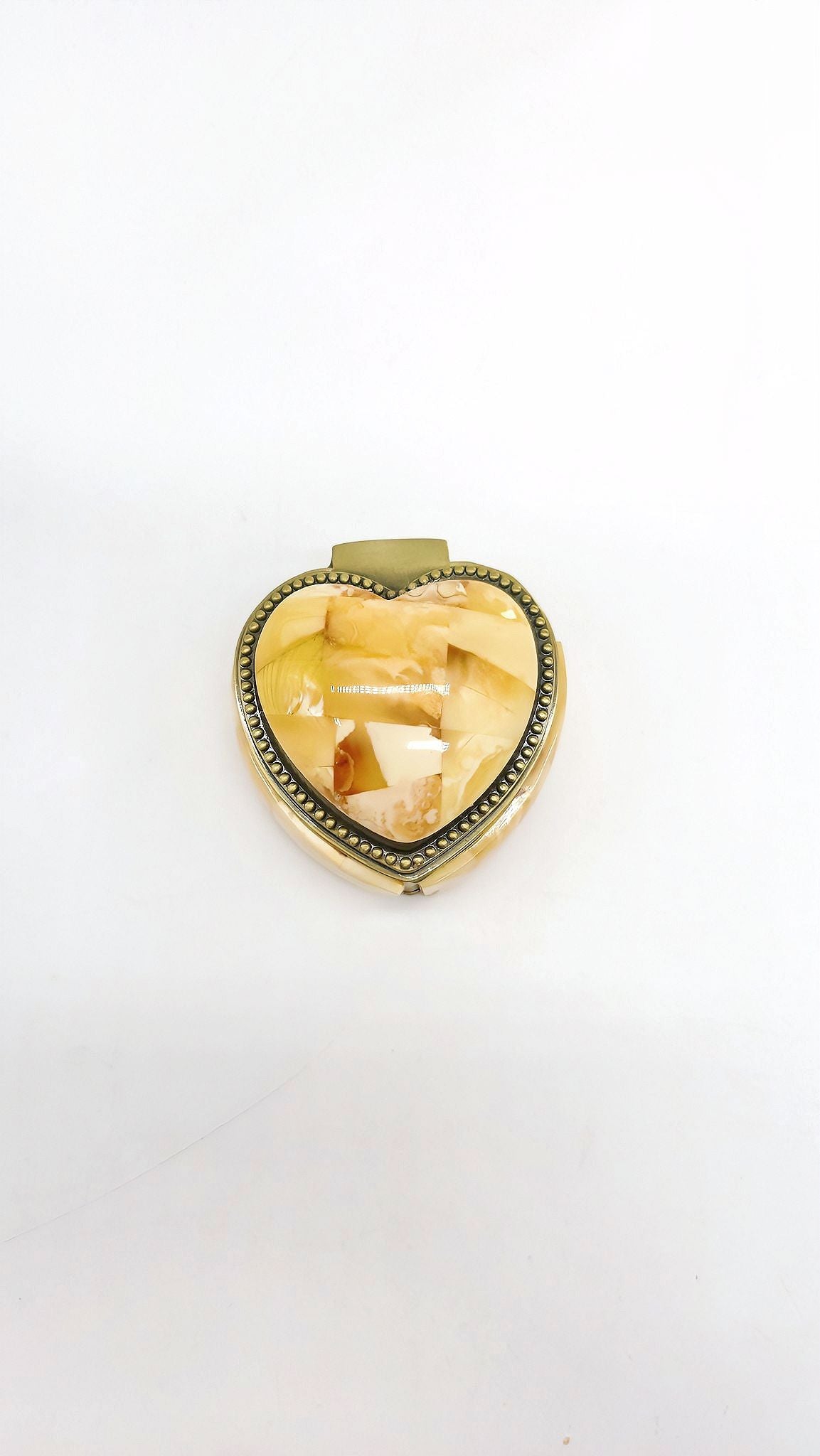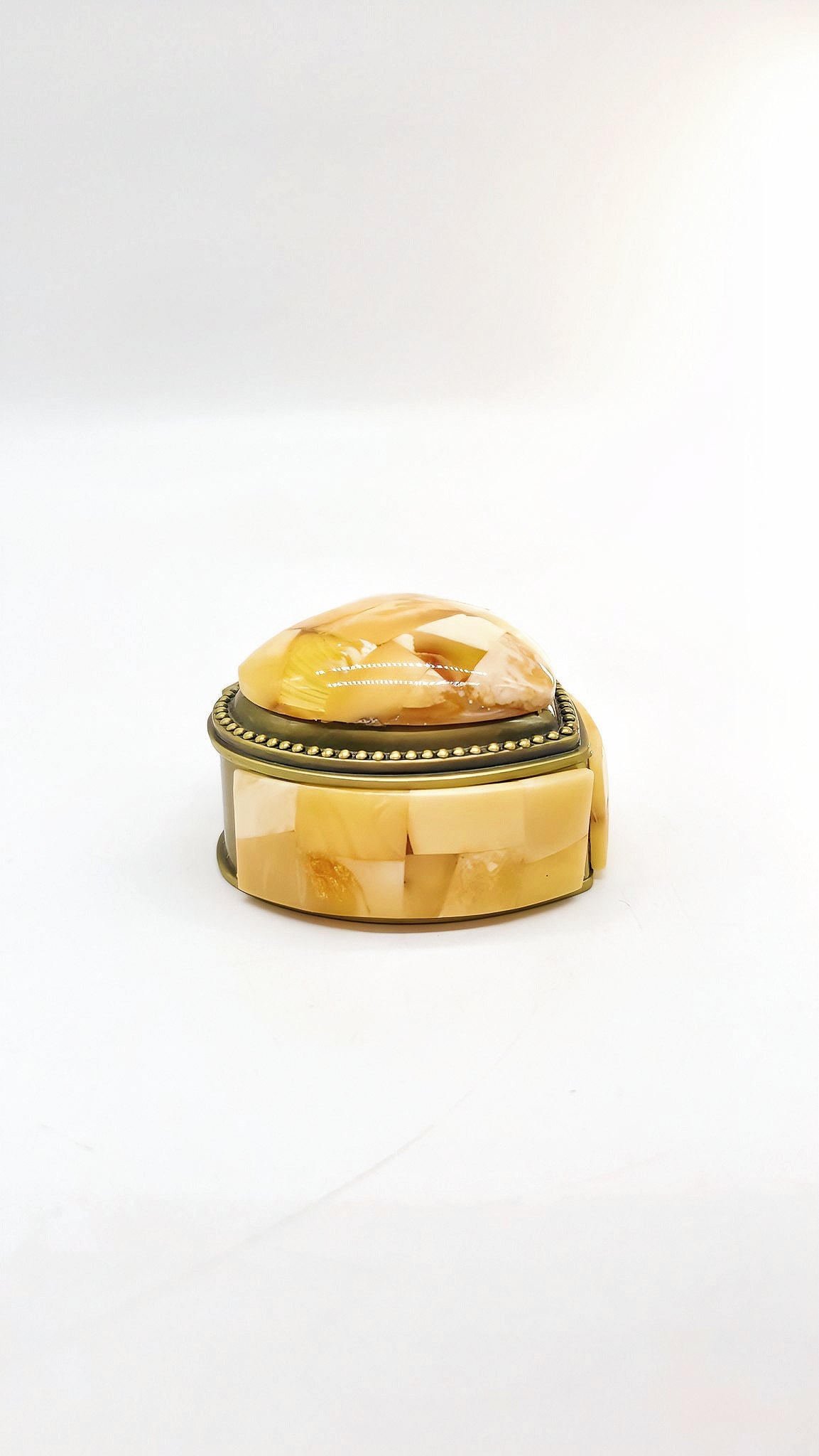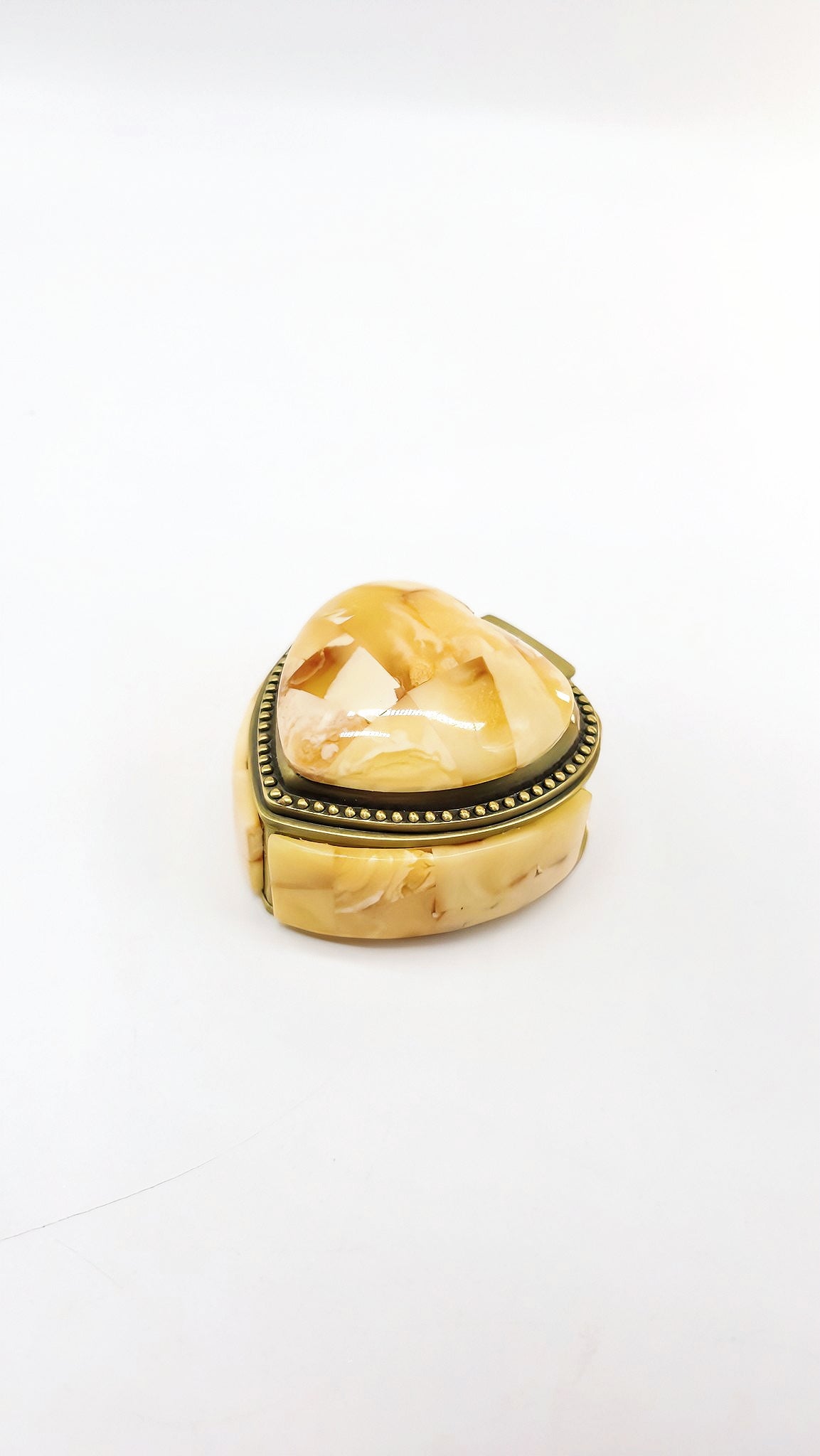 This high-quality jewelry box with genuine amber combines sophisticated design with functional elegance. The heart-shaped box is decorated with delicate amber inlays in a light gold tone , giving the jewelry box a warm, luxurious feel. Measuring 5.6 cm long, 5 cm wide, and 3.5 cm high, it offers ample space for rings, earrings, or other precious pieces of jewelry. The meticulous craftsmanship and high-quality workmanship make this jewelry box a stylish storage solution as well as a wonderful gift idea for lovers of exclusive accessories.