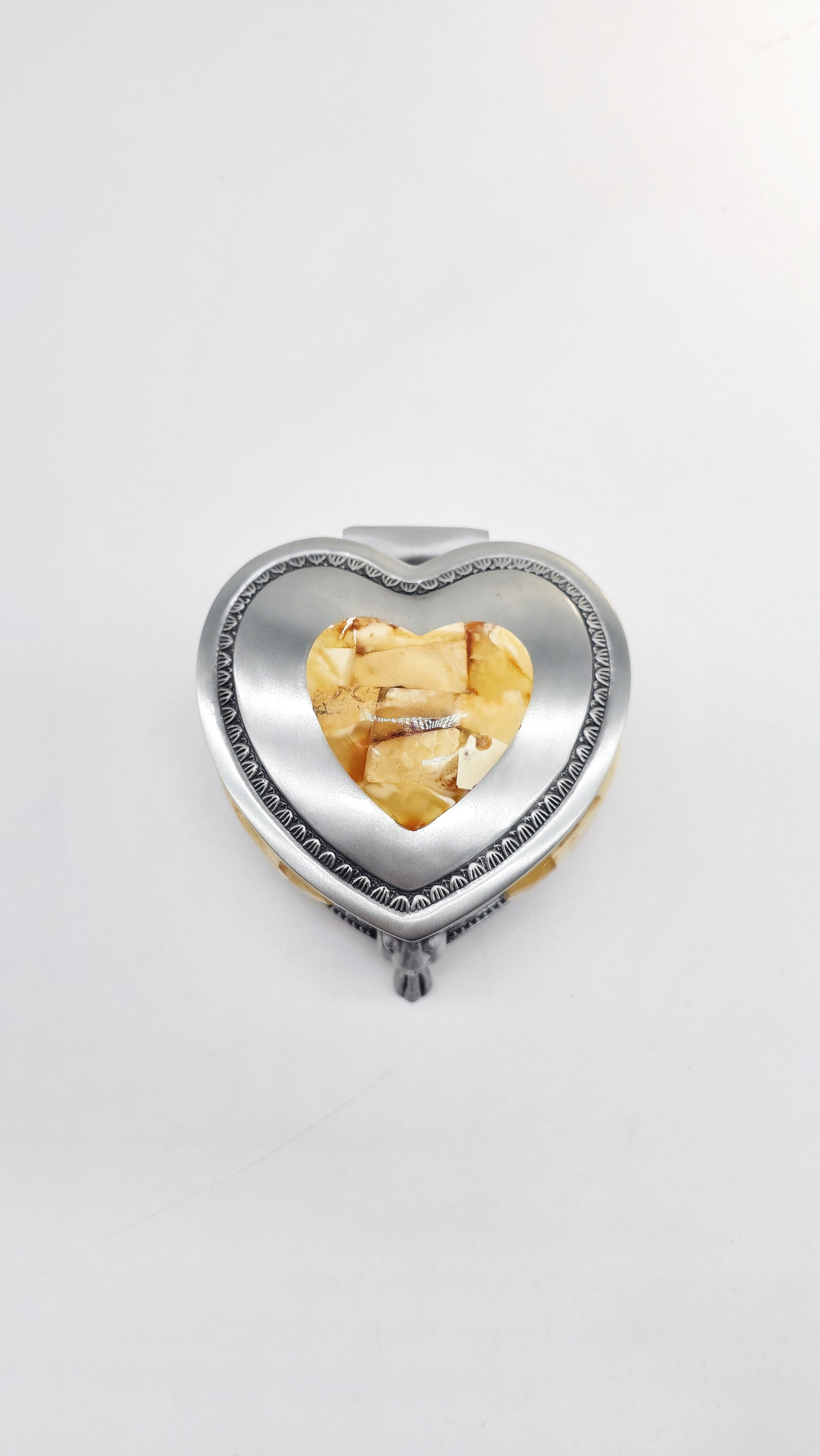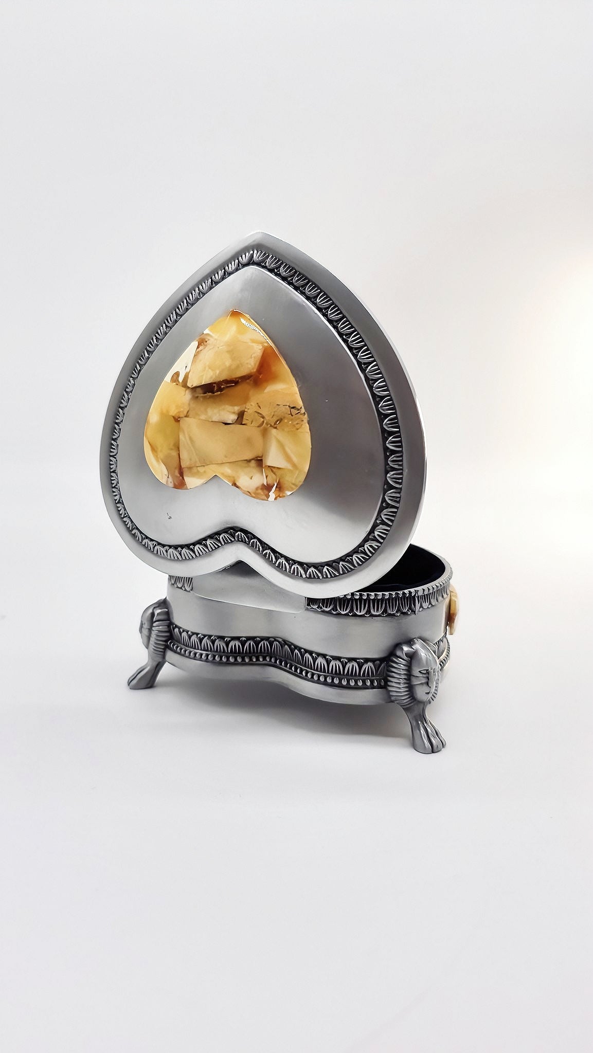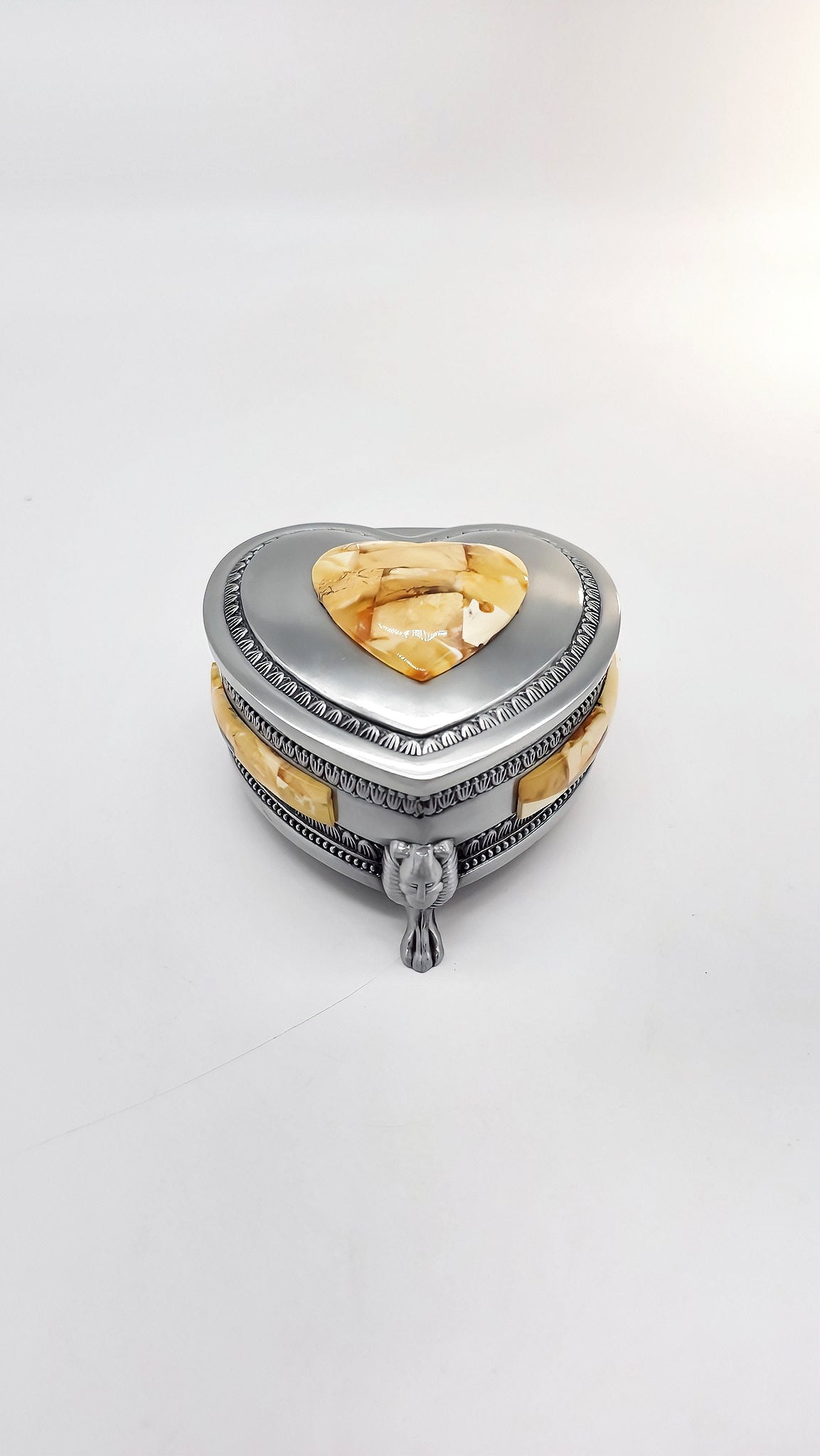 This high-quality jewelry box with genuine amber is a unique piece of jewelry and an elegant decorative element. The heart-shaped box is decorated with beautiful orange-yellow amber inlays and refined with detailed silver ornaments. It features a spacious main compartment for the safe storage of jewelry and combines functionality with luxurious design. Measuring 9 cm long, 8.5 cm wide, and 5.5 cm high, it offers ample space for valuable accessories. Perfect as a stylish gift or for lovers of fine jewelry storage.