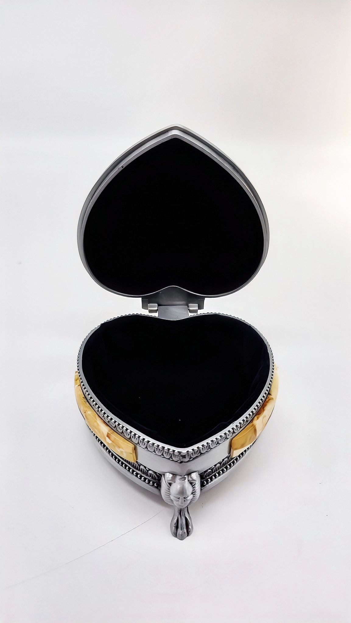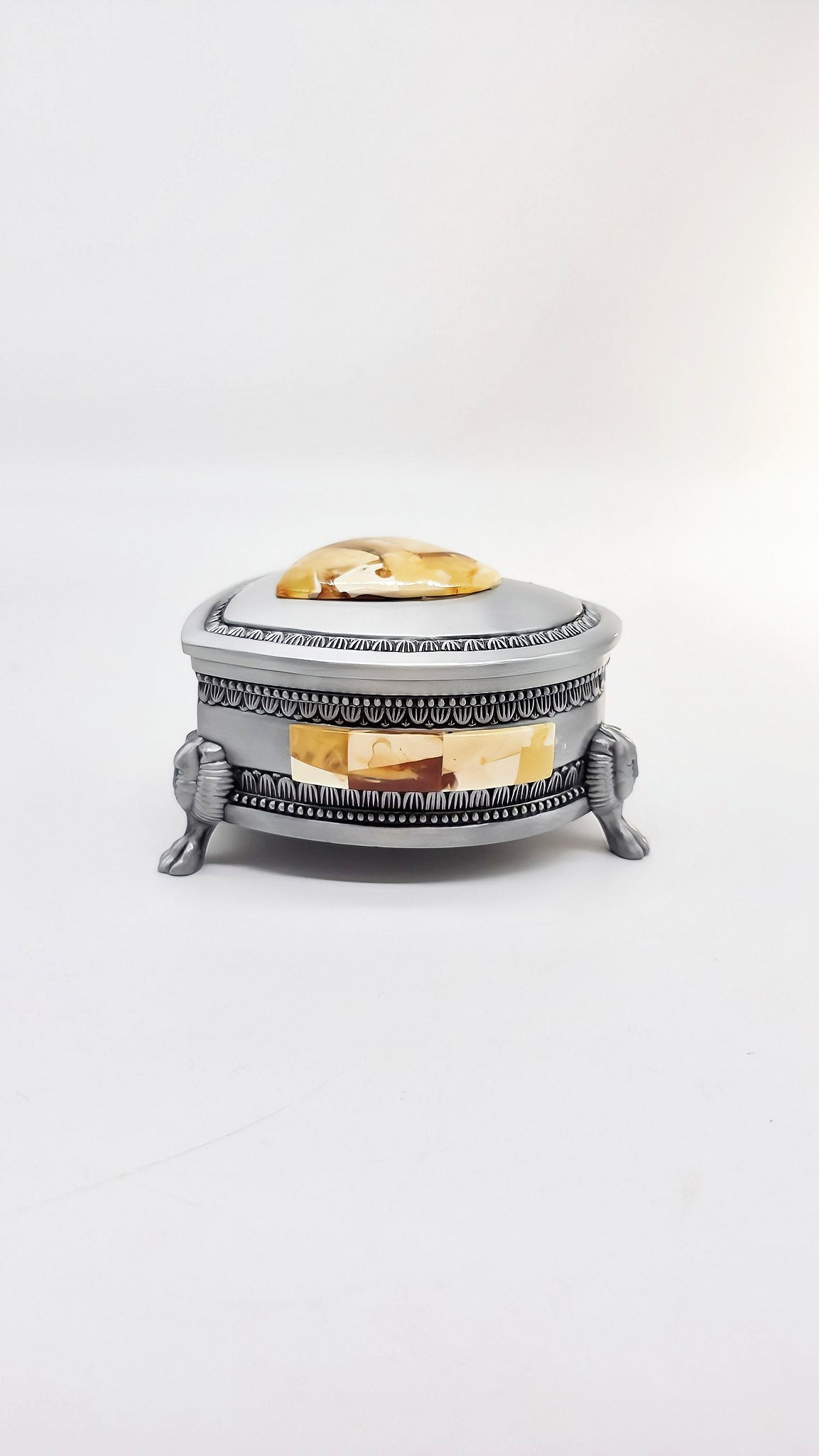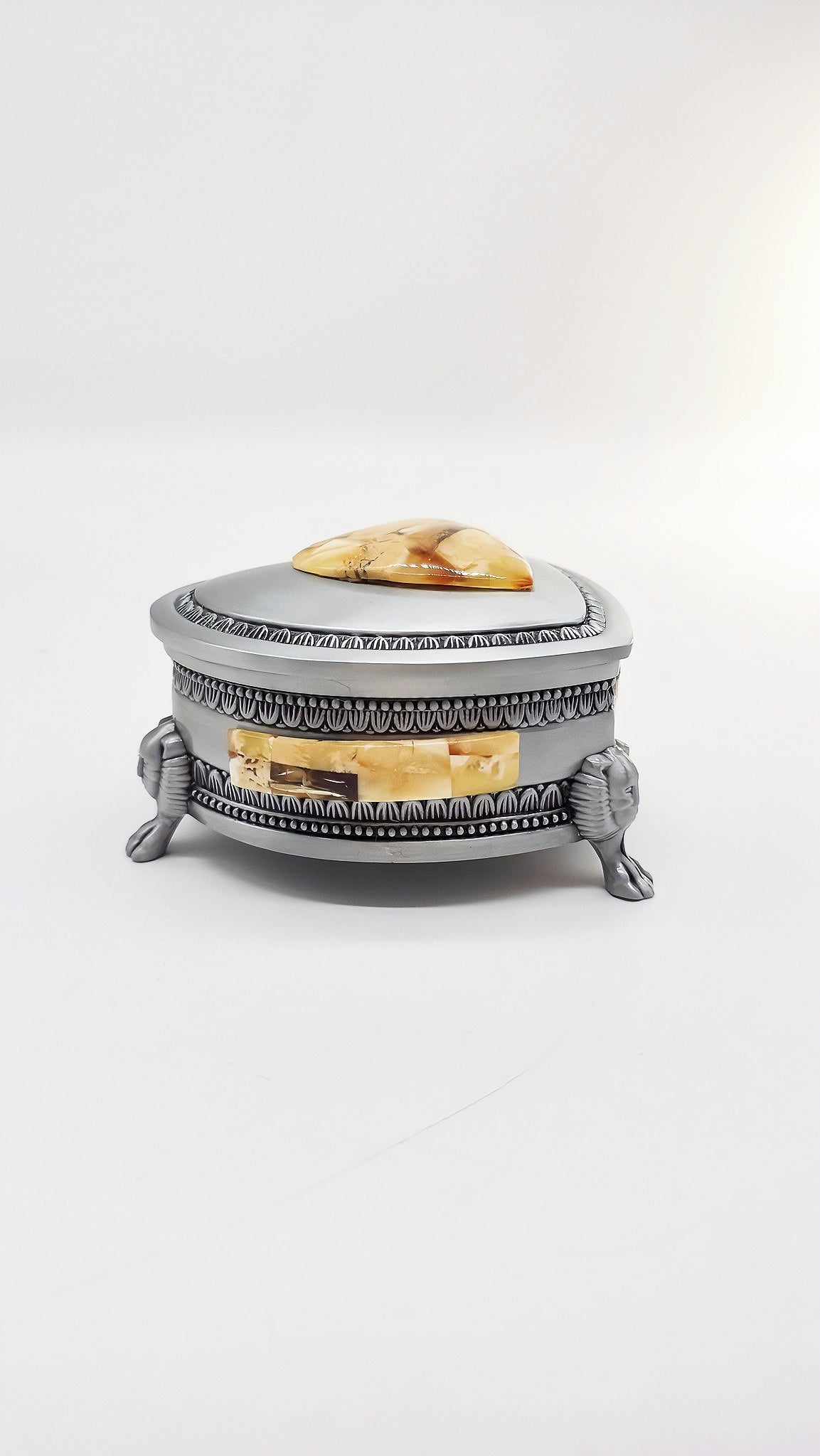 This high-quality jewelry box with genuine amber is a unique piece of jewelry and an elegant decorative element. The heart-shaped box is decorated with beautiful orange-yellow amber inlays and refined with detailed silver ornaments. It features a spacious main compartment for the safe storage of jewelry and combines functionality with luxurious design. Measuring 9 cm long, 8.5 cm wide, and 5.5 cm high, it offers ample space for valuable accessories. Perfect as a stylish gift or for lovers of fine jewelry storage.