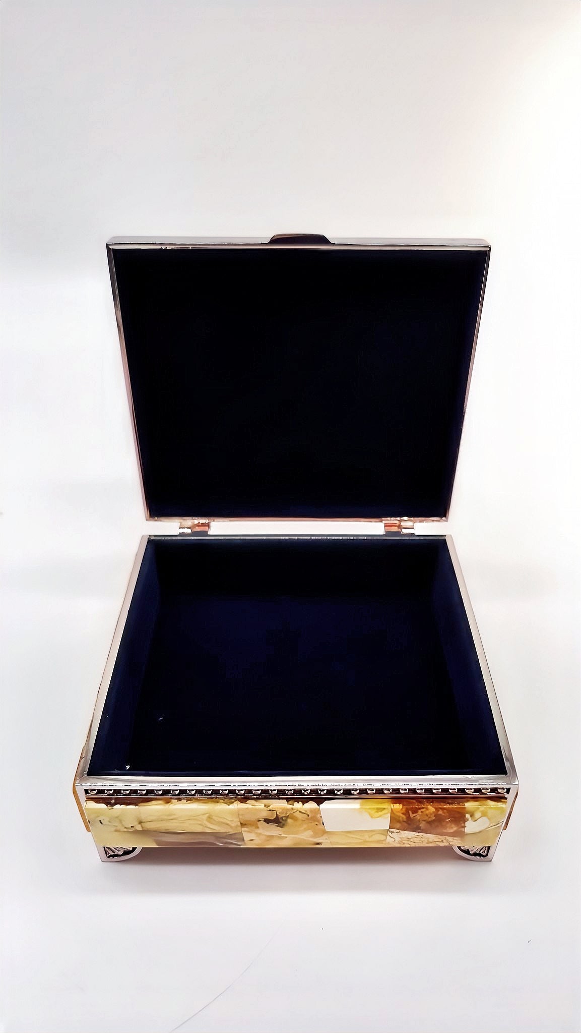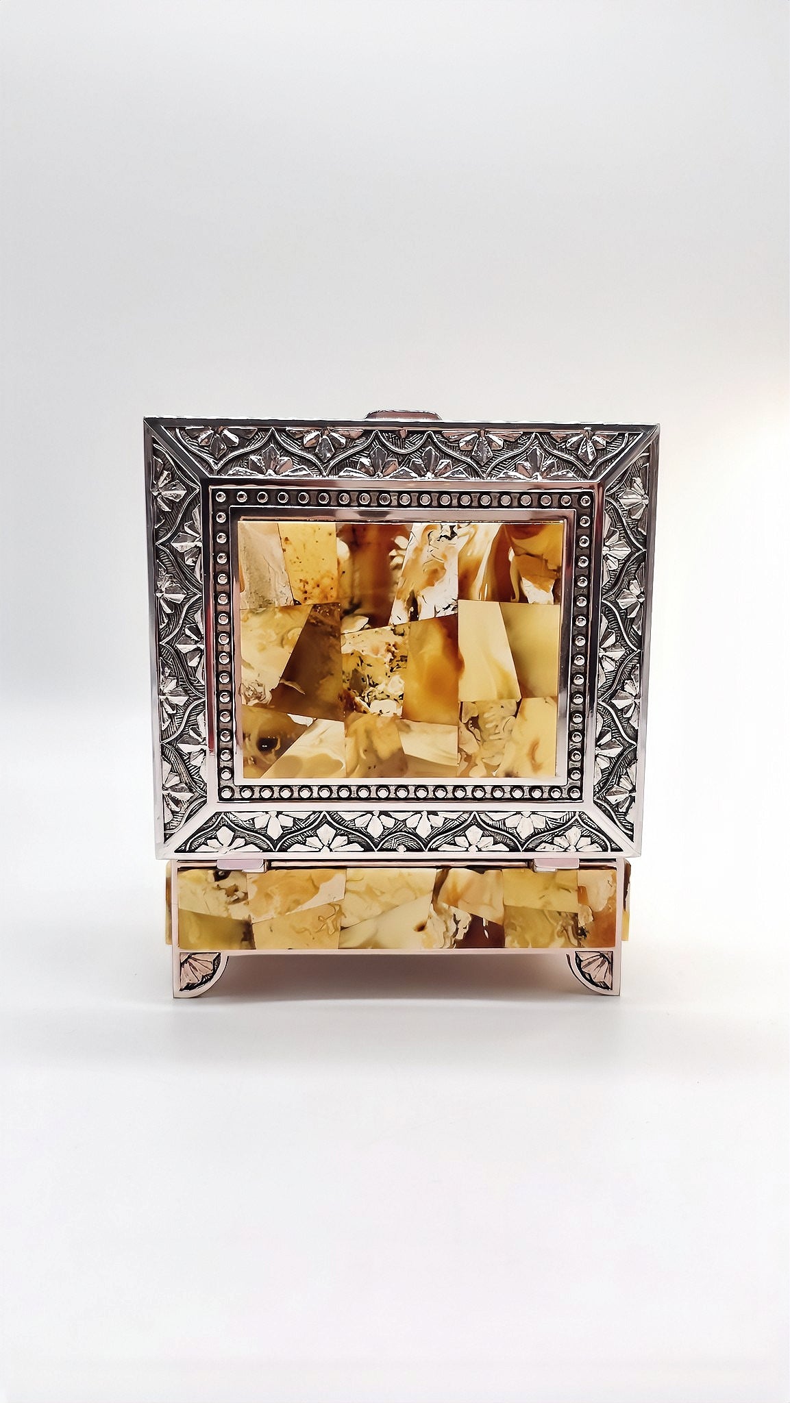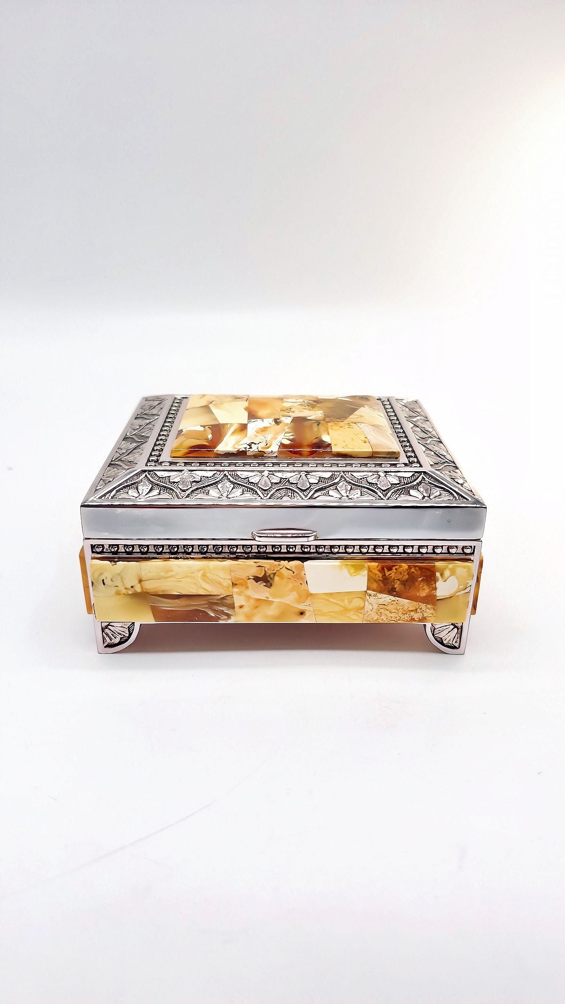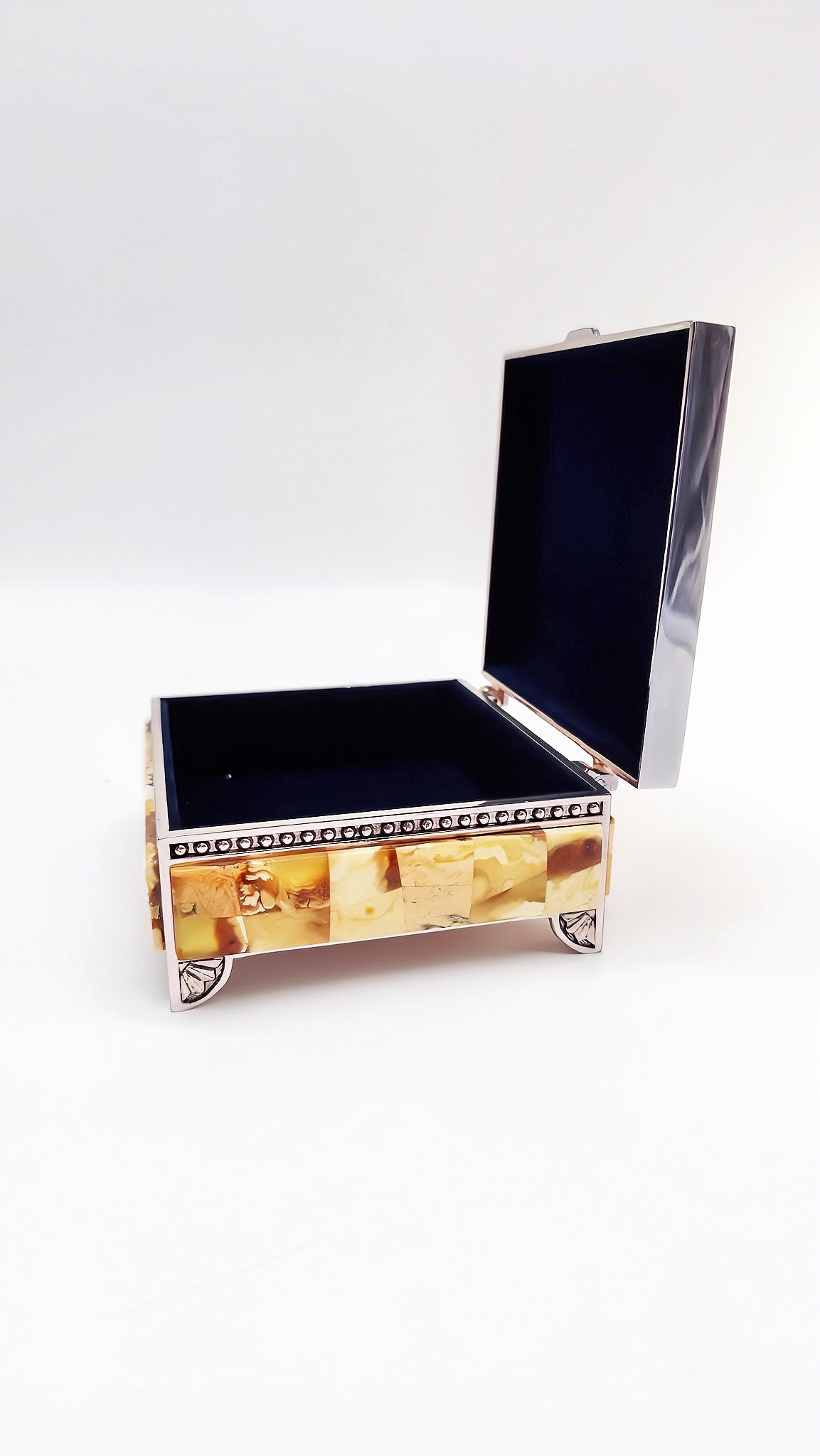 This high-quality jewelry box with genuine amber is a luxurious storage piece for precious jewelry. The light gold-tone amber inlays give it an elegant and sophisticated look. The artistic decoration with finely crafted silver details makes this jewelry box a unique work of art. Measuring 9 cm long, 11 cm wide, and 4.5 cm high, it offers ample space for rings, bracelets, or necklaces. The handcrafted design and spacious interior compartment make it the perfect choice for jewelry lovers or as a stylish gift for special occasions.