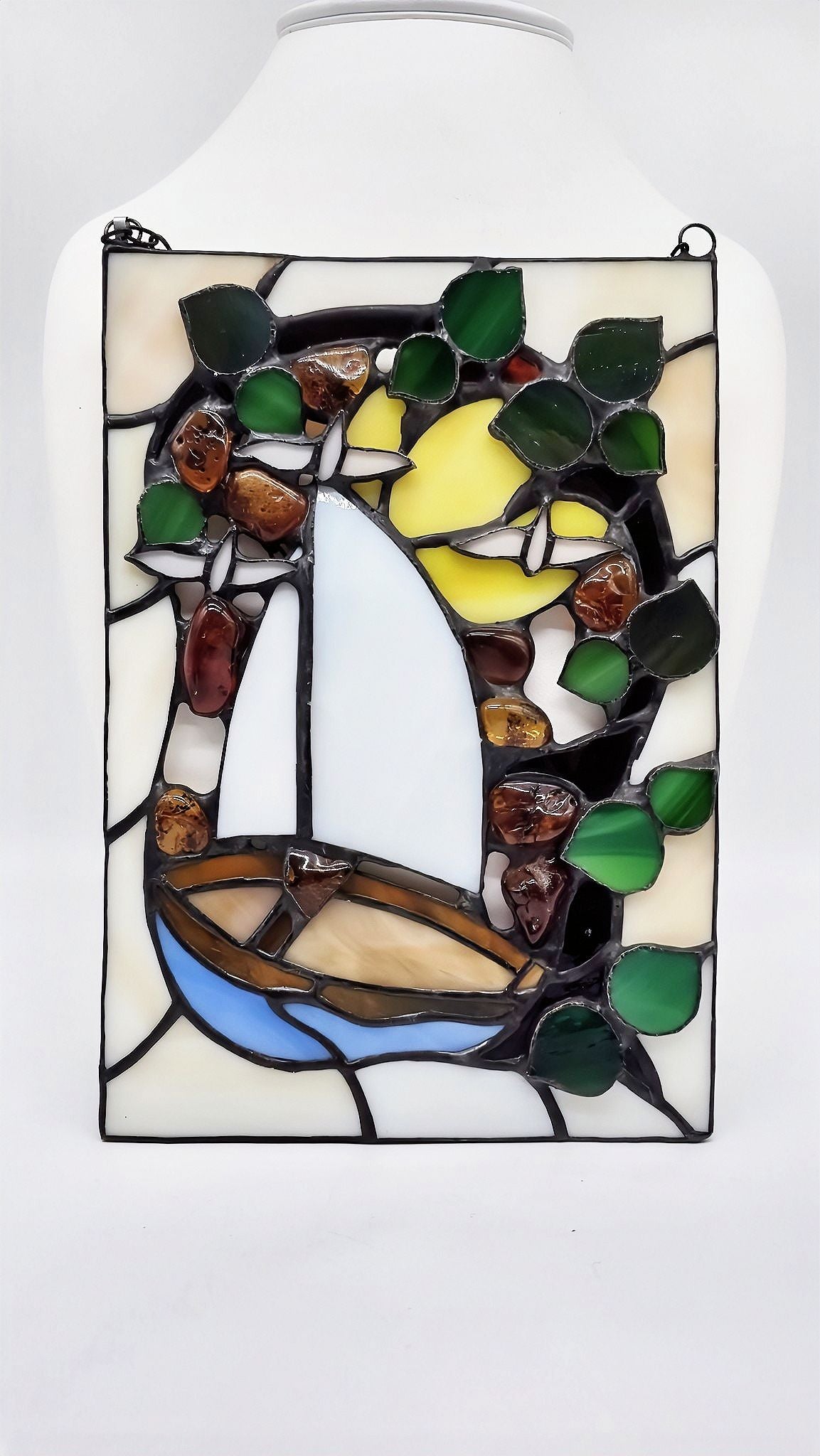 This handcrafted amber Vitral sailing ship is an artistic wall decoration for lovers of nautical style . The combination of genuine natural amber, glass, and a metal frame makes each piece unique .