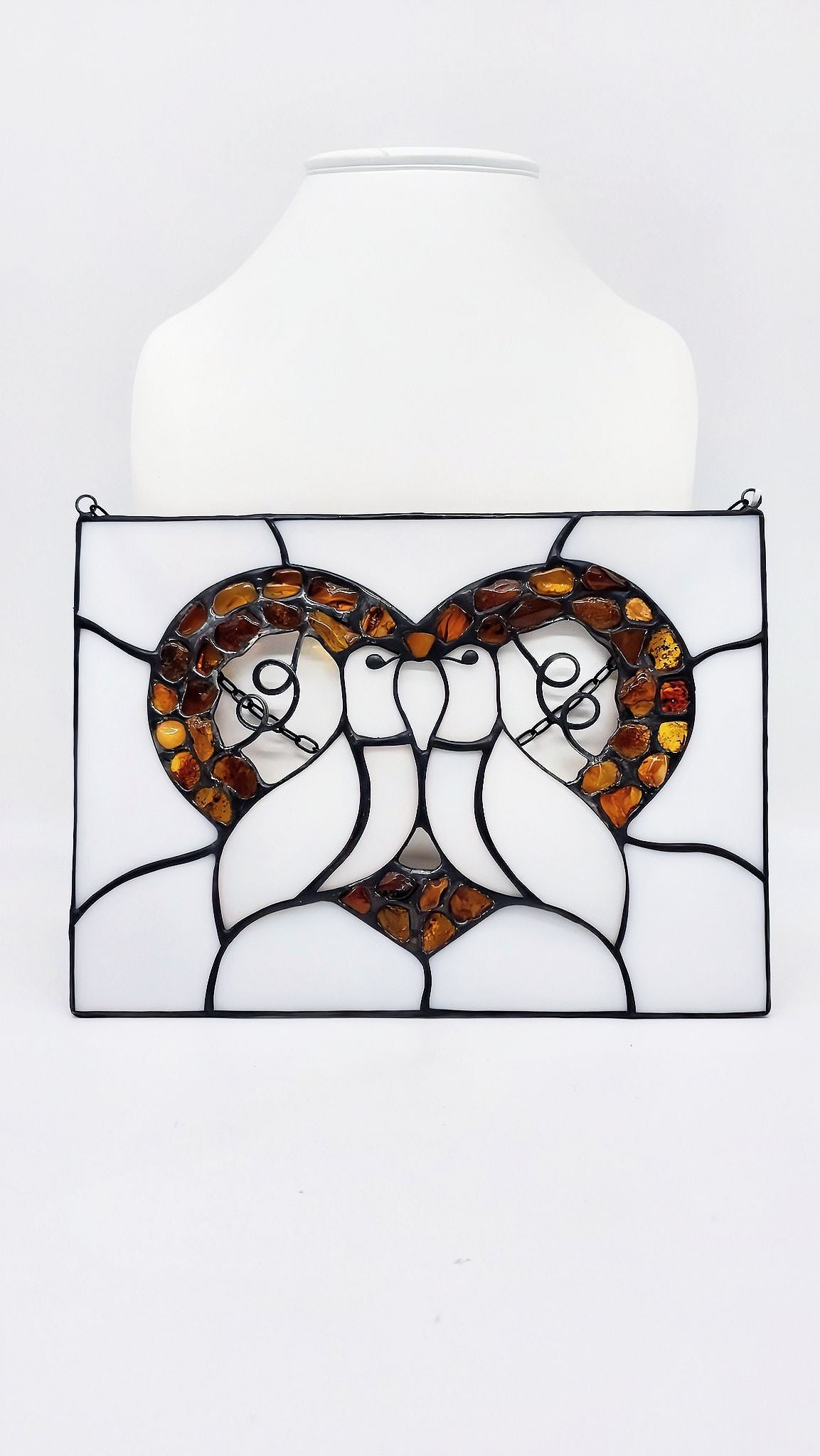 This handcrafted amber vitral wall decoration features two lovingly crafted doves with a heart made of genuine natural amber —a symbol of love, harmony, and prosperity . Perfect as a romantic decoration for your home or as a special wedding gift .