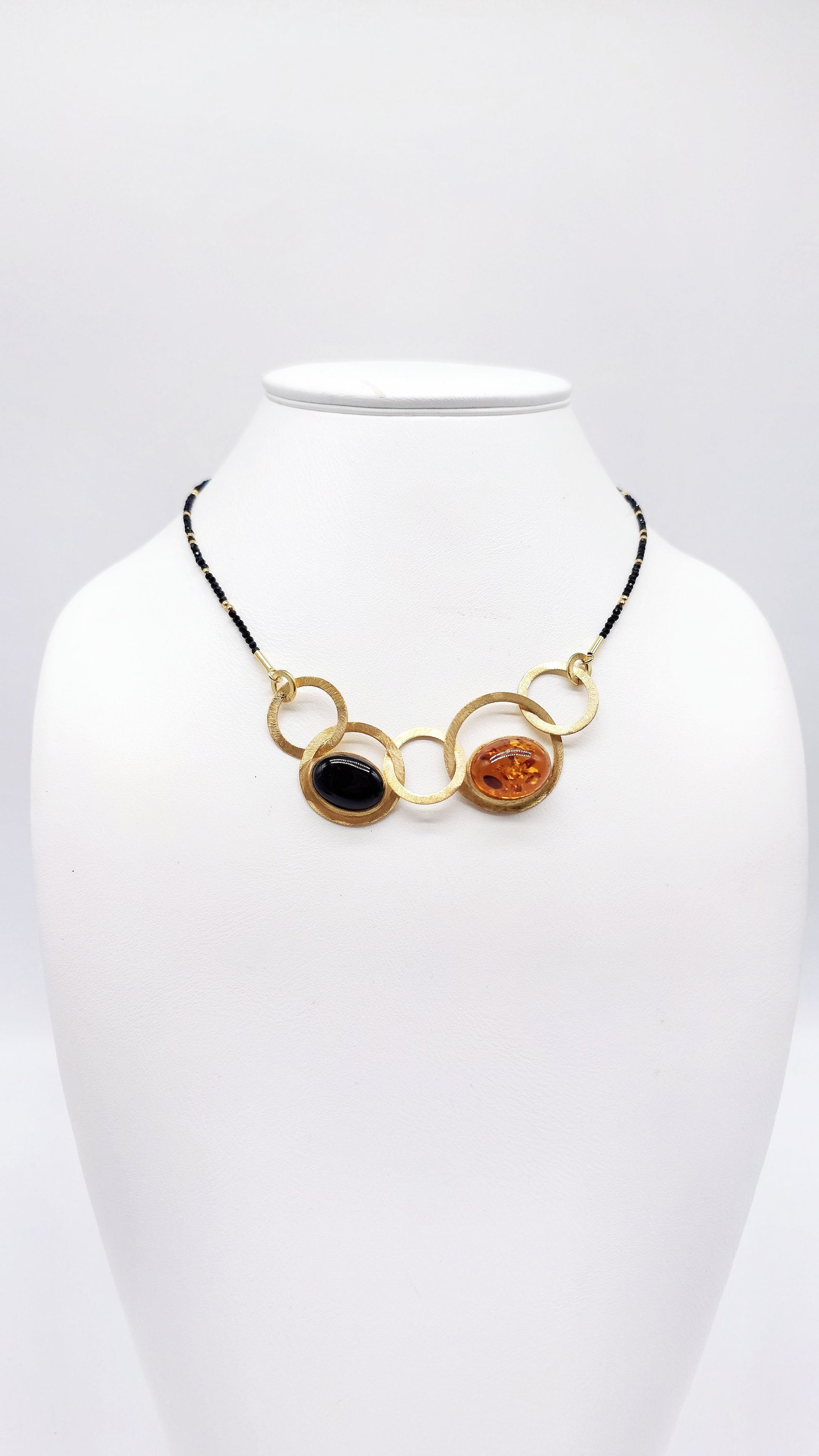 This gold-plated necklace with genuine amber and onyx is an expressive piece of jewelry that combines elegance and naturalness in an artistic design. The circles of gold-plated 925 sterling silver perfectly showcase the two precious natural stones. Amber symbolizes warmth, energy, and protection, while the deep black onyx represents inner strength and harmony.