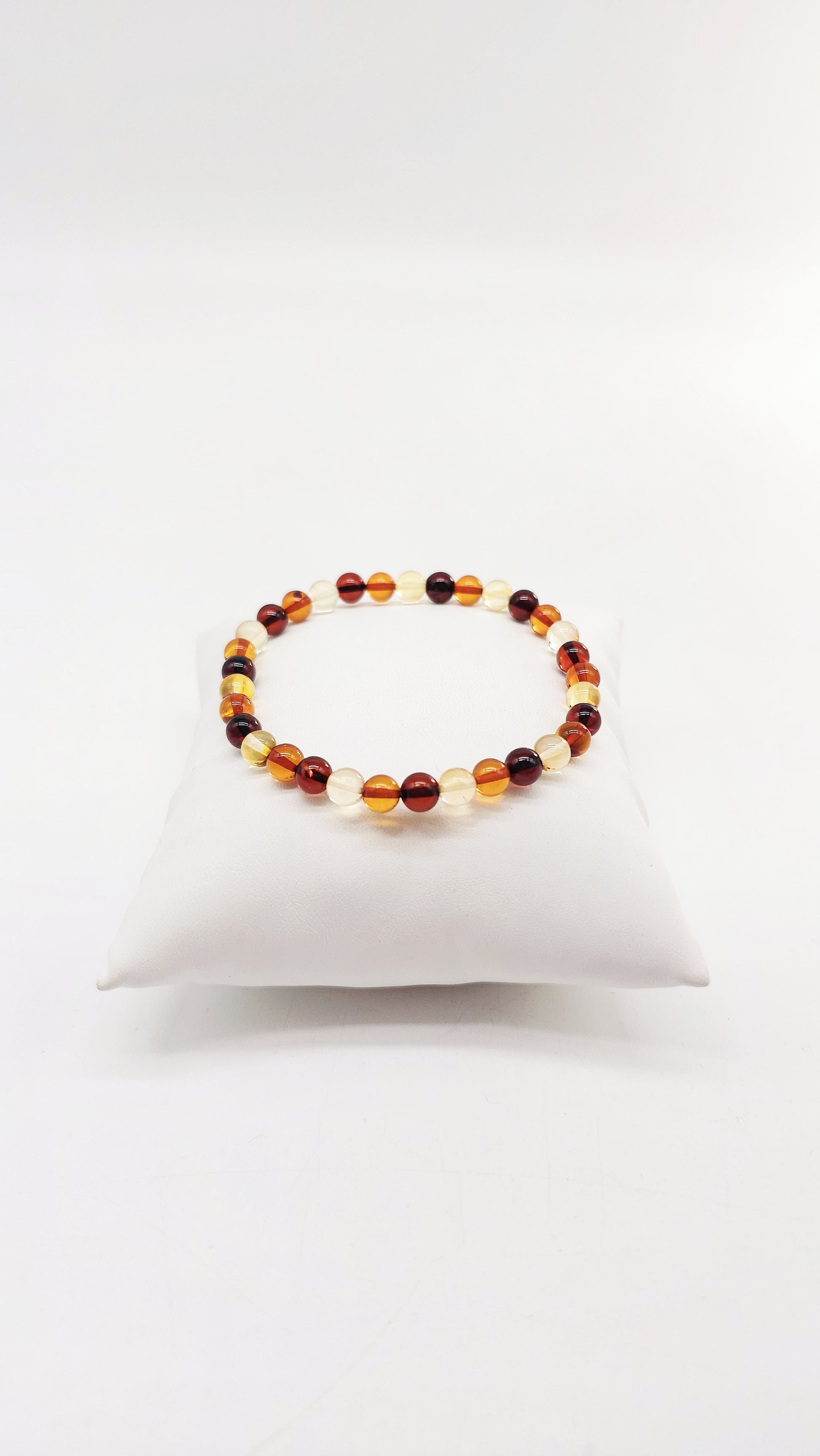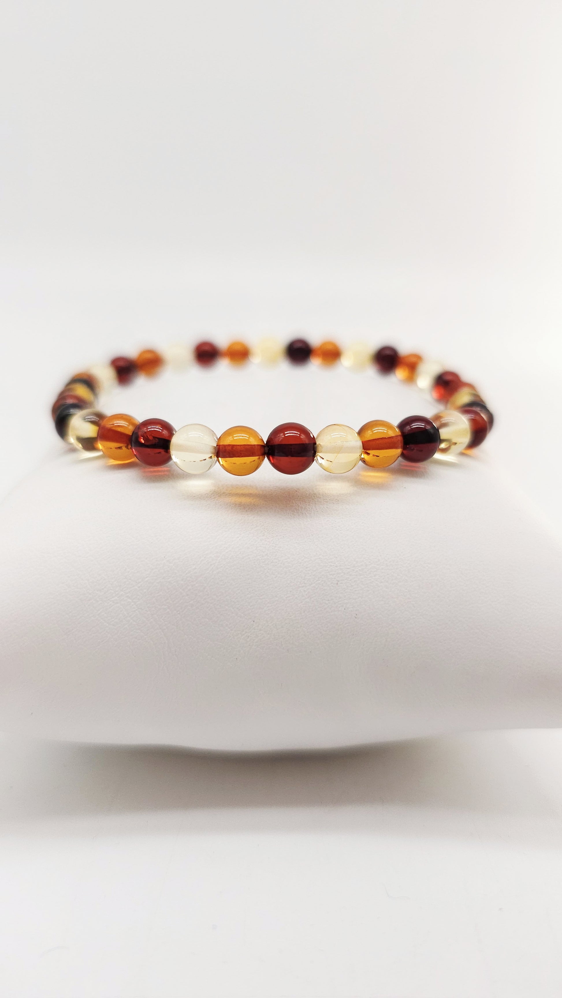 This stylish bracelet made of genuine natural amber captivates with its harmonious combination of light, cognac-colored, and dark brown amber beads —each bead unique. Thanks to the elastic band, the bracelet is easy to put on and take off and adapts flexibly to any wrist size .