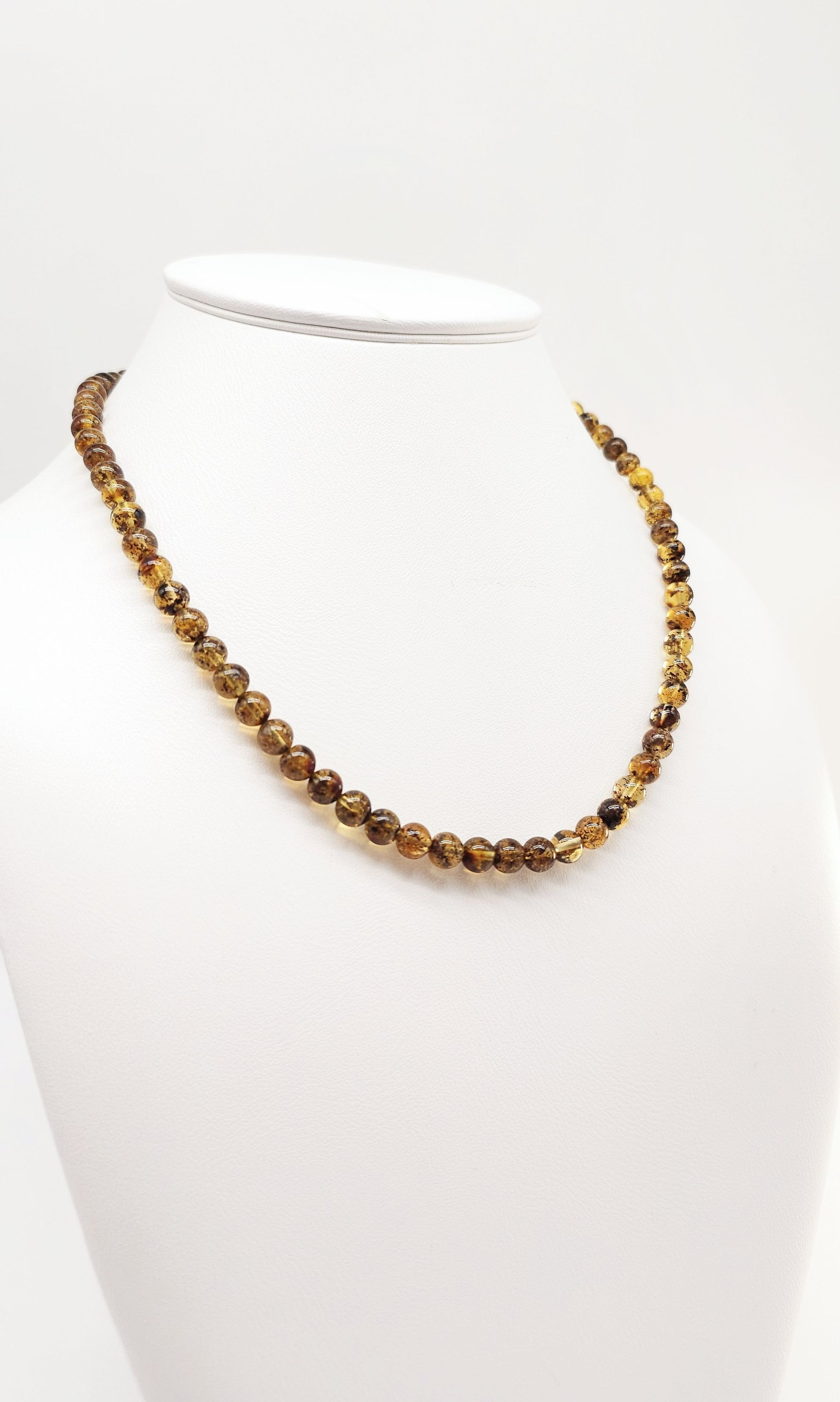 This extraordinary amber necklace made of genuine natural amber captivates with its rare greenish-brown color palette, brought to life by the light's reflections. The finely cut beads, measuring approximately 0.6 cm in diameter, lend the necklace an elegant structure. Its understated appearance makes it an ideal everyday companion and a stylish accessory for special occasions.