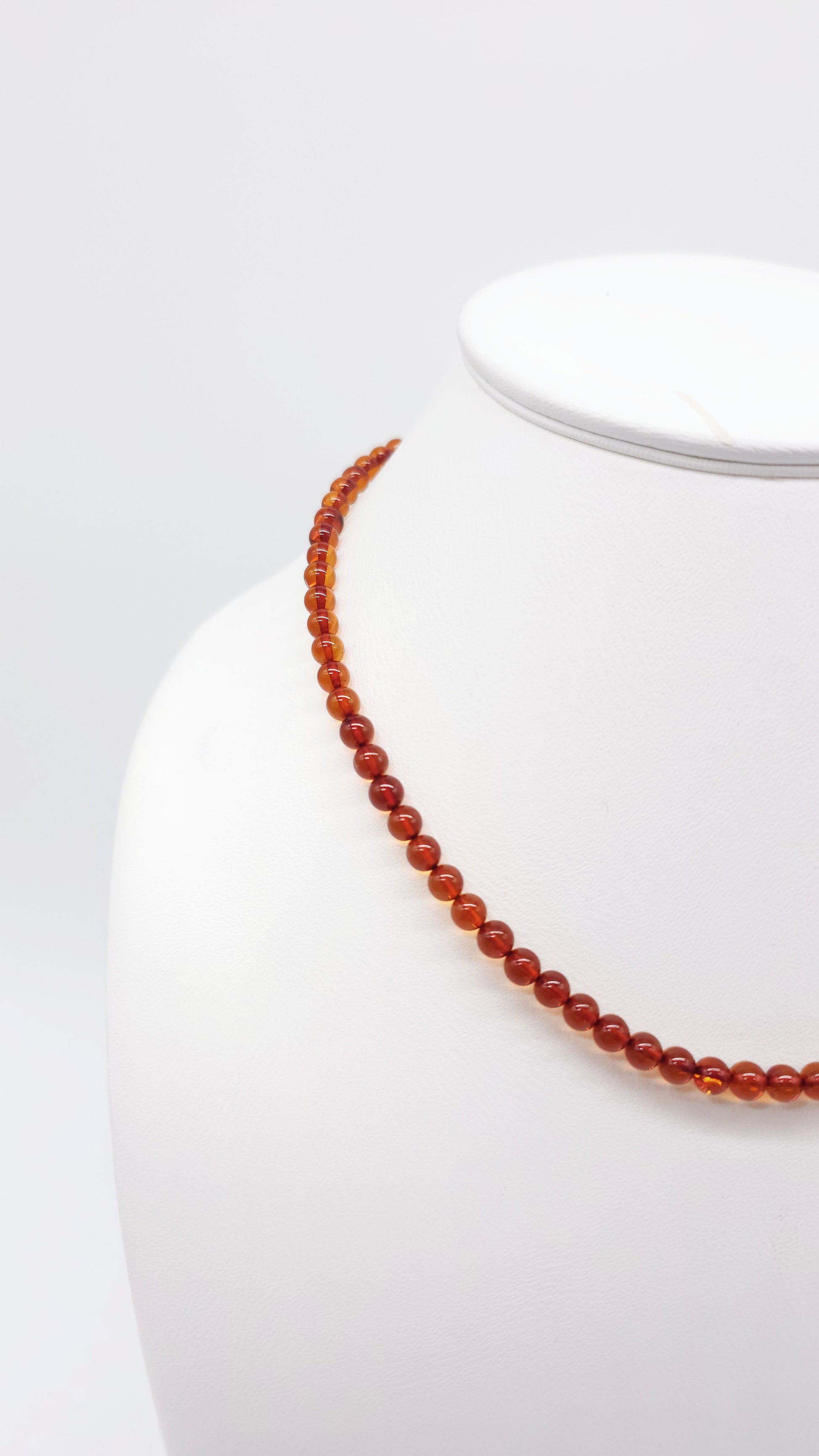 This elegant amber necklace is a true gem for lovers of natural materials. The evenly cut, round amber beads captivate with their deep, warm orange hue and vibrant interplay of colors that gently shimmer with every movement .