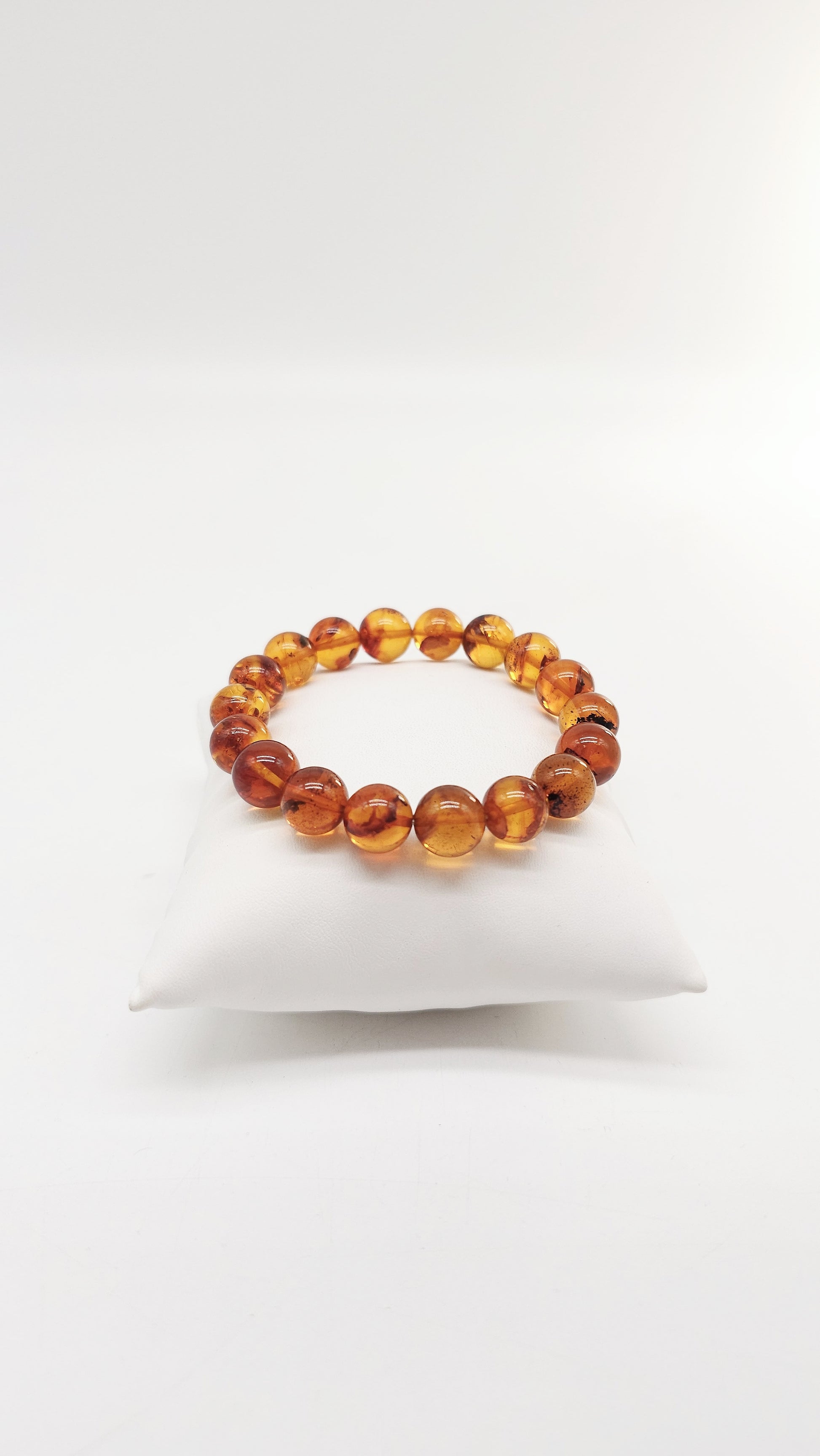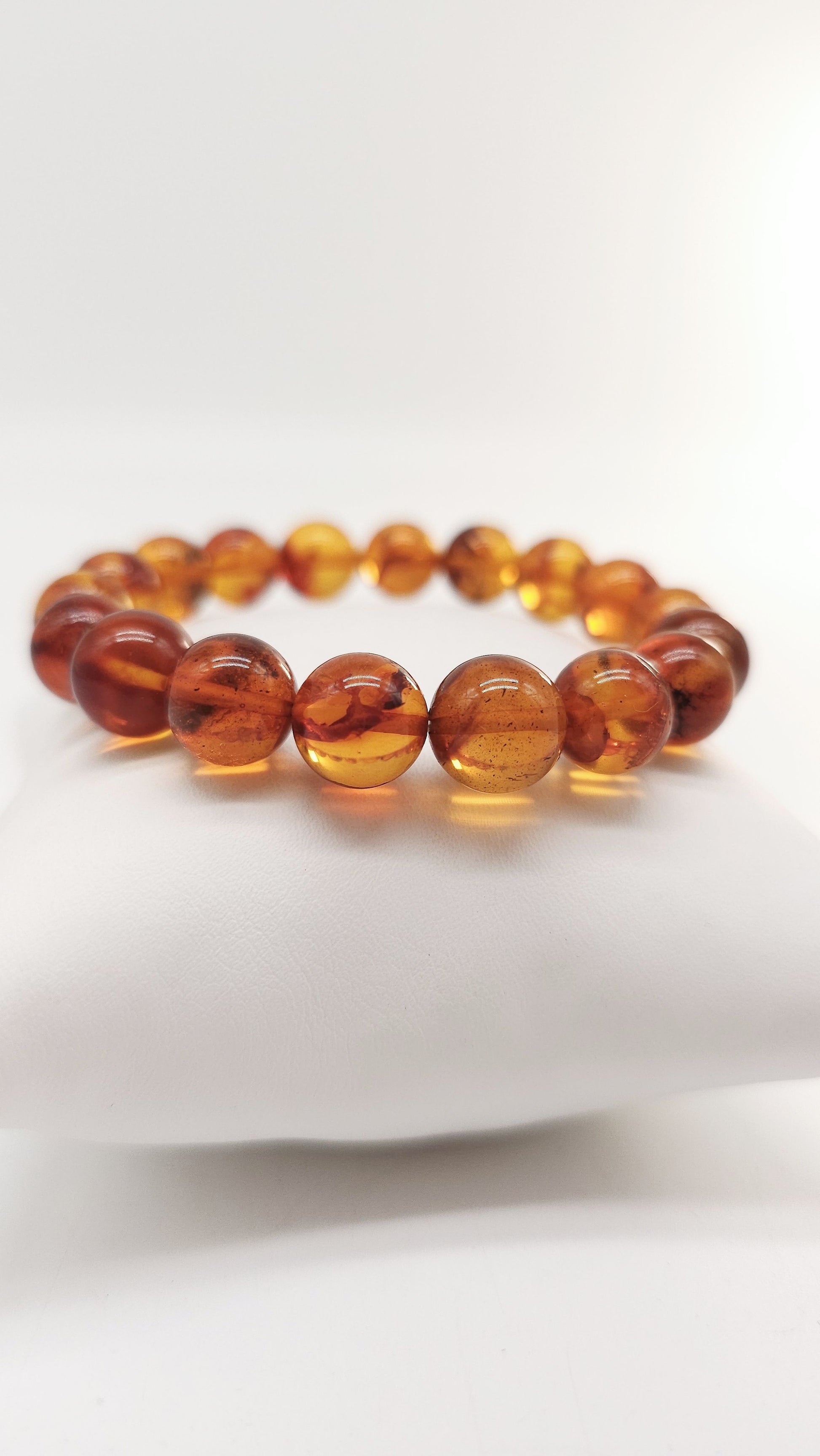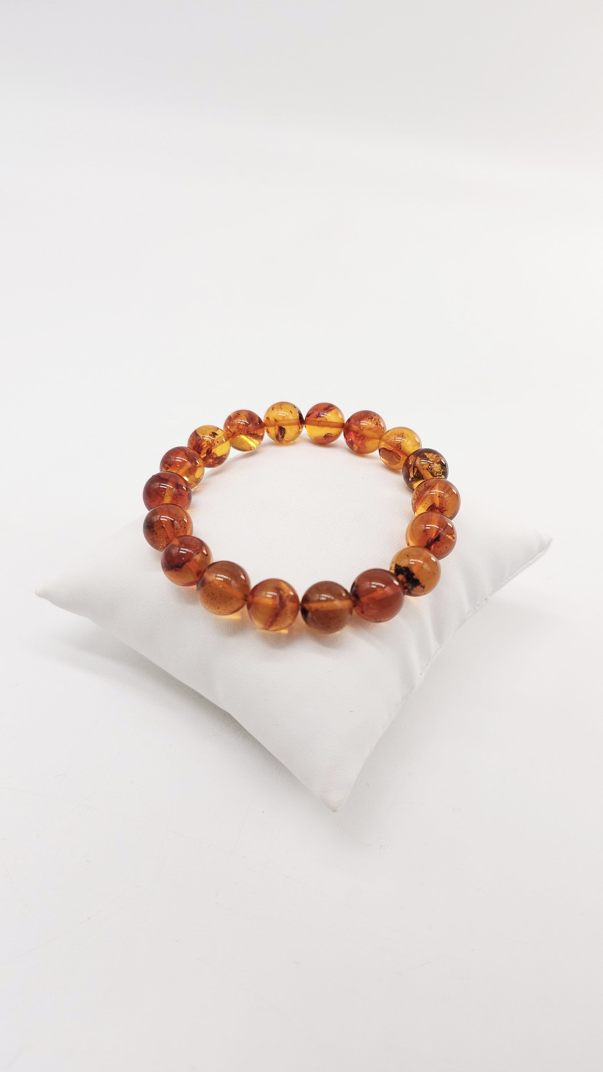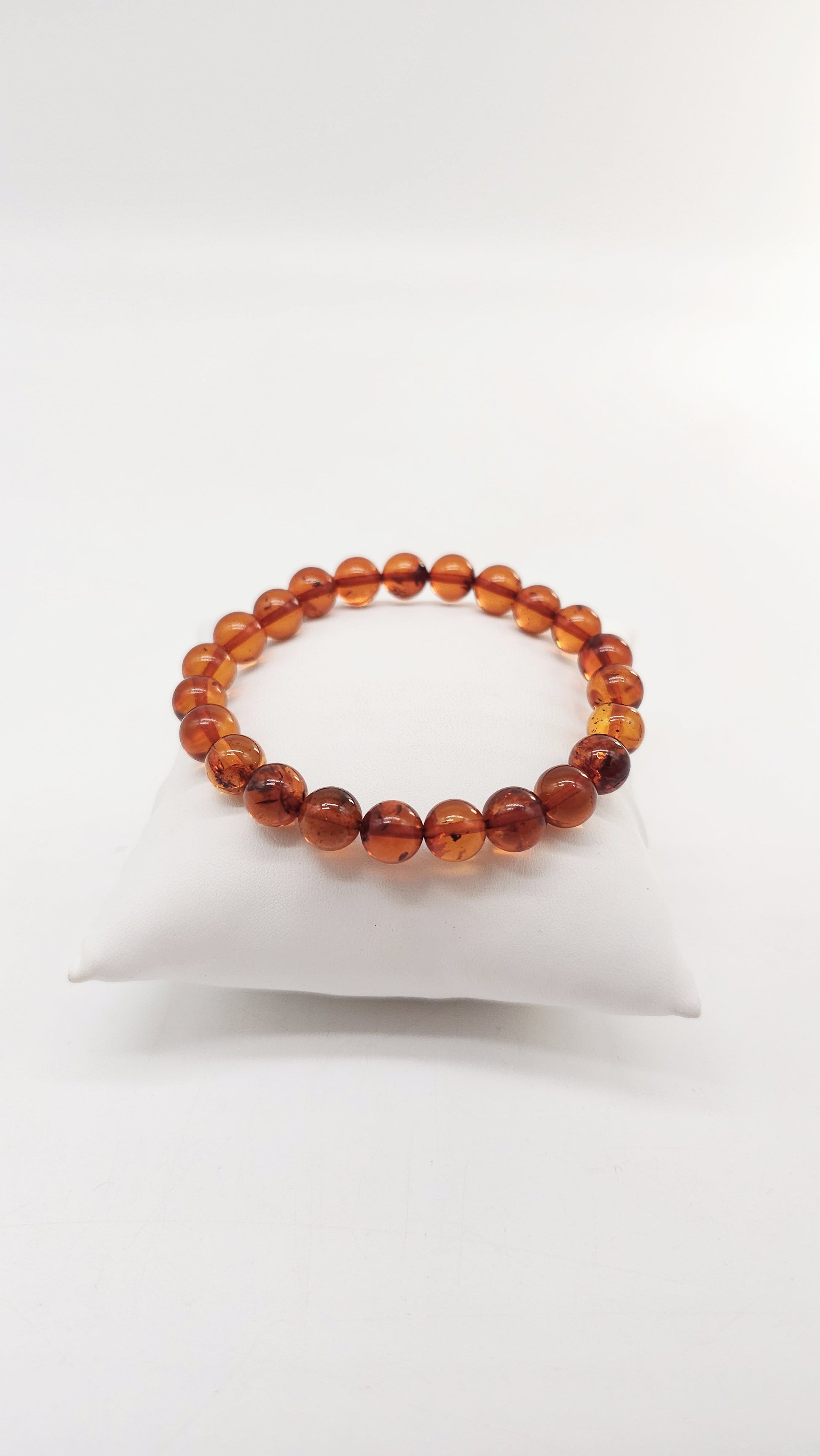 This amber bracelet is an elegant classic that combines natural charm with practicality for everyday wear. Crafted from polished amber beads in warm honey tones, it brings light and warmth to any wrist. The beads are strung on a special elastic band, allowing it to flexibly adjust to fit almost any hand size – without a clasp.