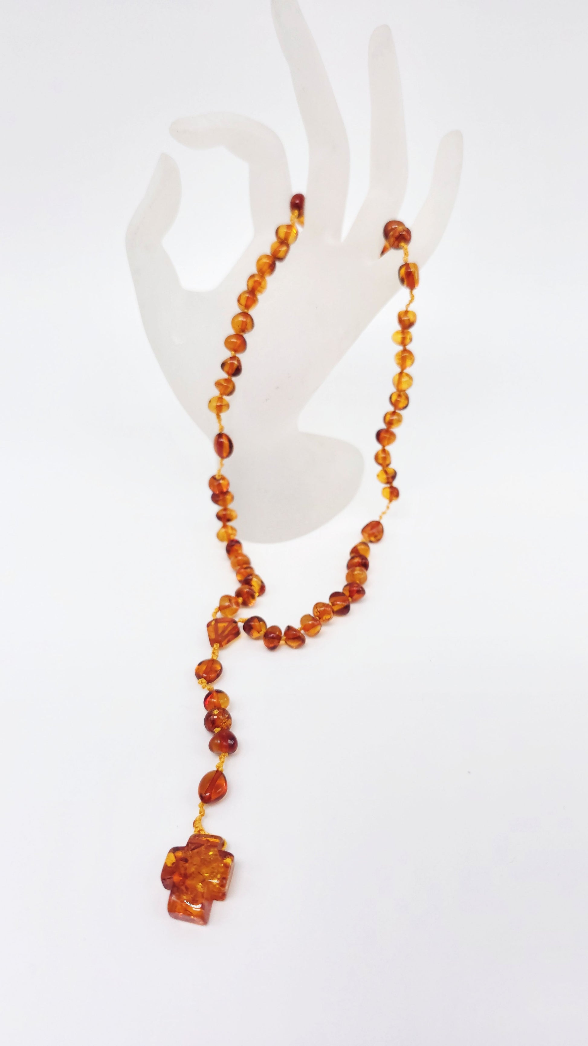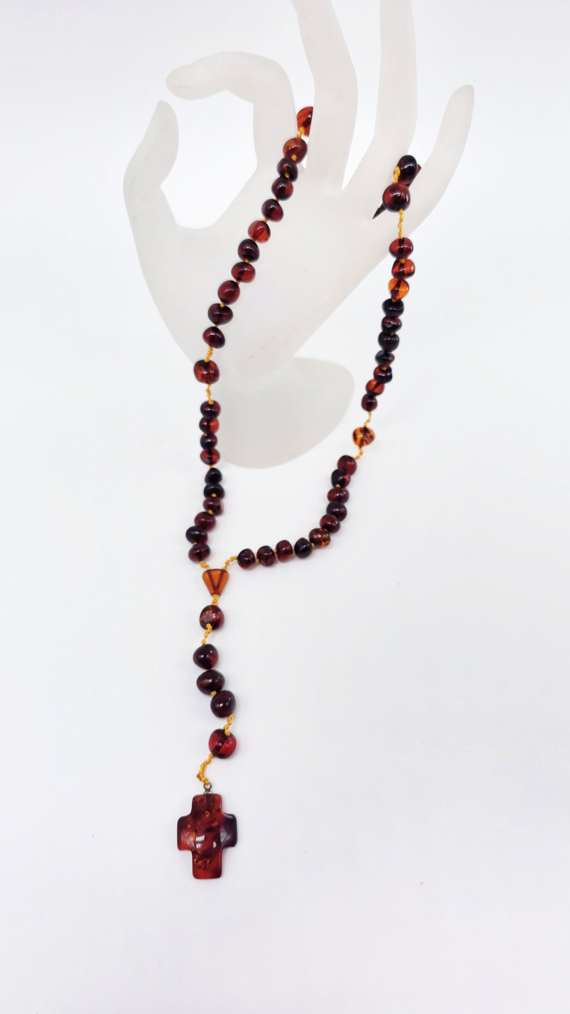 The amber beads range in color from sunny honey to deep cognac , with each stone unique due to its inclusions . The cross is crafted from a solid piece of amber — unique in shape and structure. The prayer beads are comfortable to hold and are suitable for personal prayer , as well as a meaningful gift for communion or confirmation , or for devout collectors.