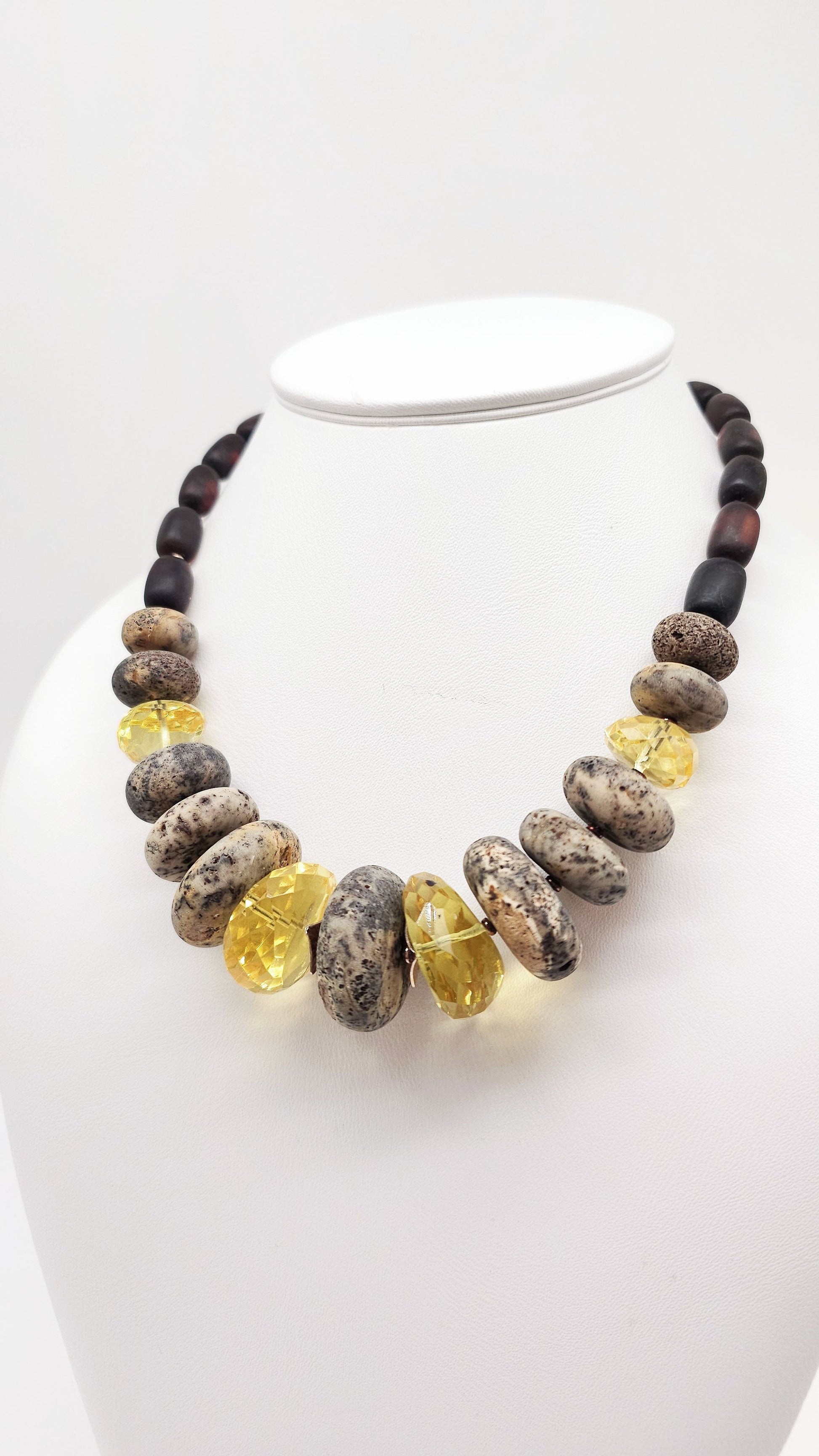This unique necklace is an expression of natural elegance and powerful aesthetics. An exclusive combination of faceted, honey-colored amber and striking natural stones gives the necklace its distinctive look. The materials harmonize perfectly in their color scheme – from deep brown to beige to bright yellow. The solid appearance with an interplay of smooth and textured surfaces ensures an impressive appearance.