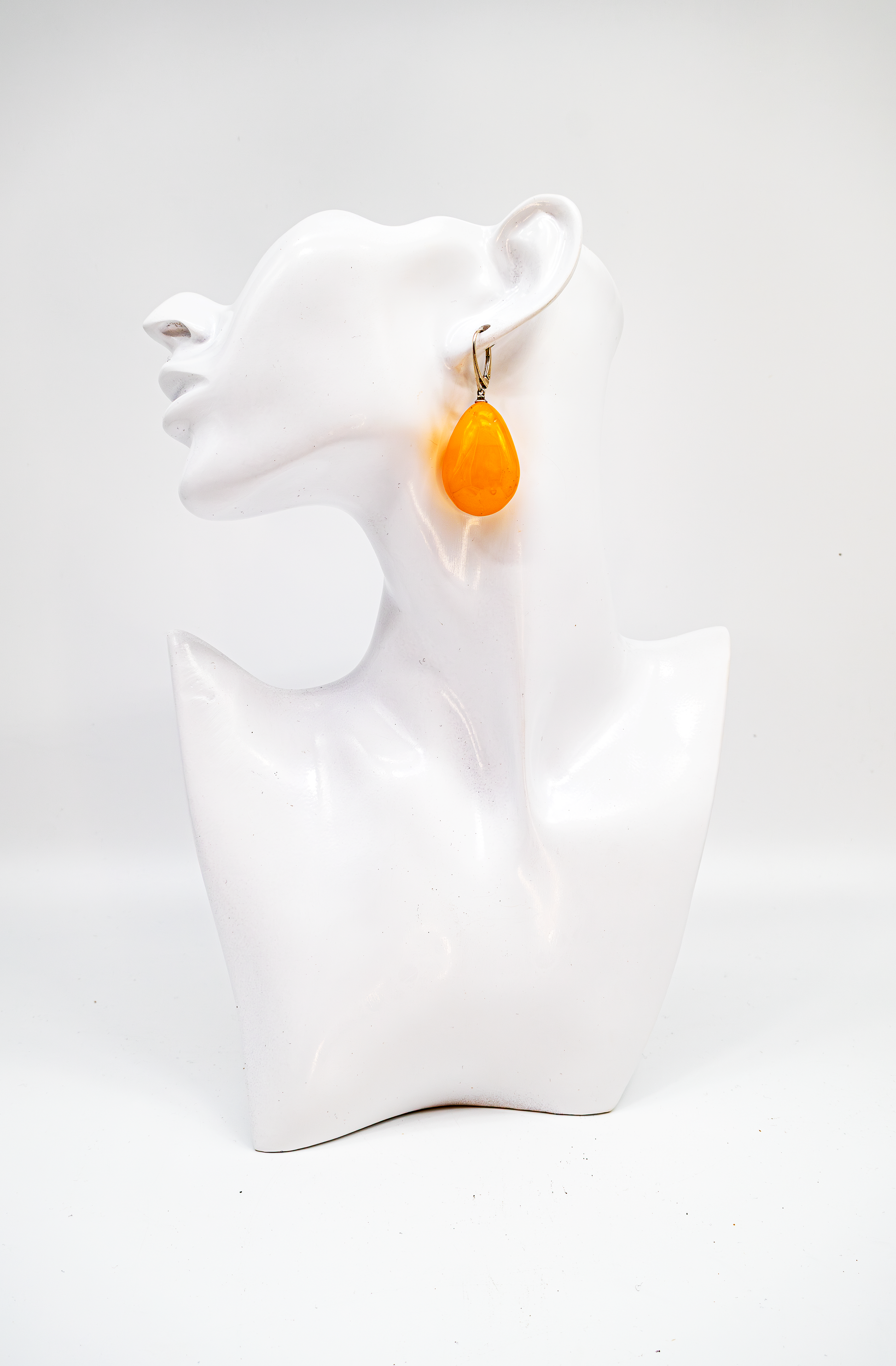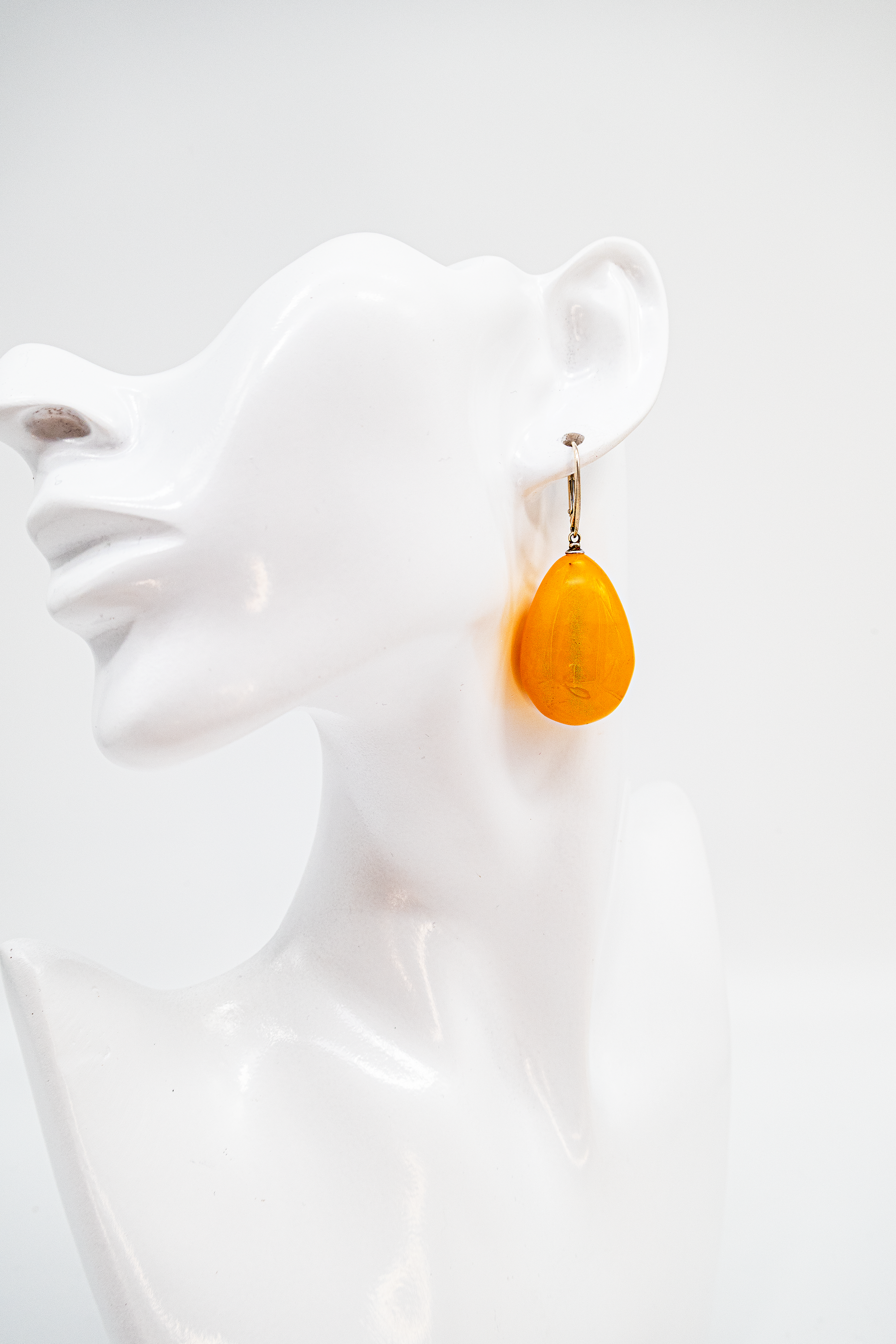 These amber earrings crafted from solid 925 sterling silver combine natural elegance with timeless beauty. The drop-shaped, bright orange amber is held in a simple silver setting, creating a particularly sophisticated look. Measuring approximately 5 cm long and 2 cm wide, the earrings are striking yet unobtrusive—an ideal companion for special occasions as well as for everyday wear. Each piece is handcrafted and unique , distinguished by the individual cut and natural grain of the amber. This exclusive pair of earrings also makes an excellent gift for women —whether for your partner, sister, or a dear friend.
