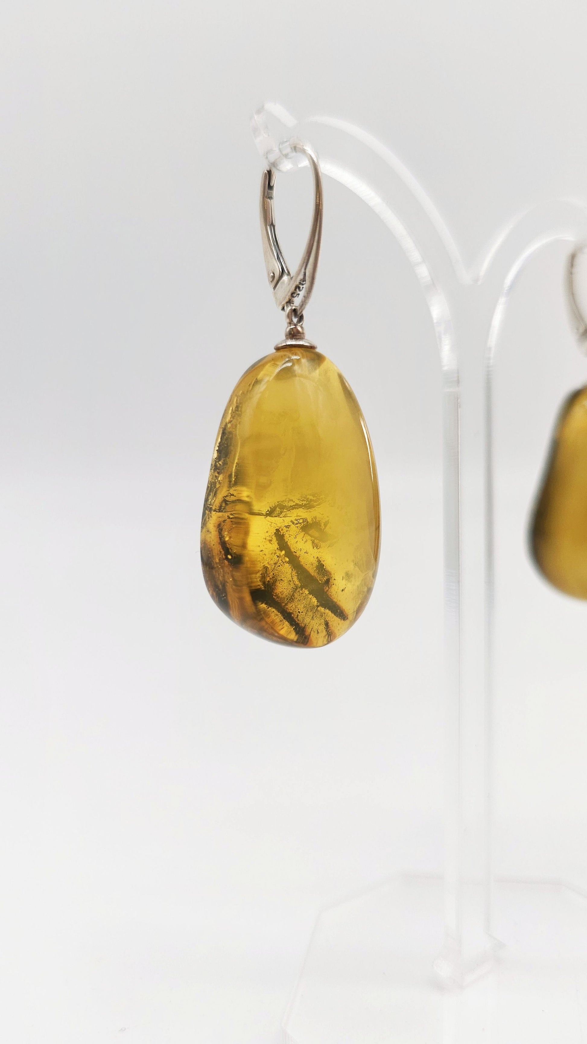 These handmade earrings made of genuine Baltic amber impress with their feminine, drop-shaped form and their exceptional greenish hue with organic inclusions. Measuring approximately 5 × 1.8 cm, they are a stylish eye-catcher—at the same time elegant and pleasantly light to wear.