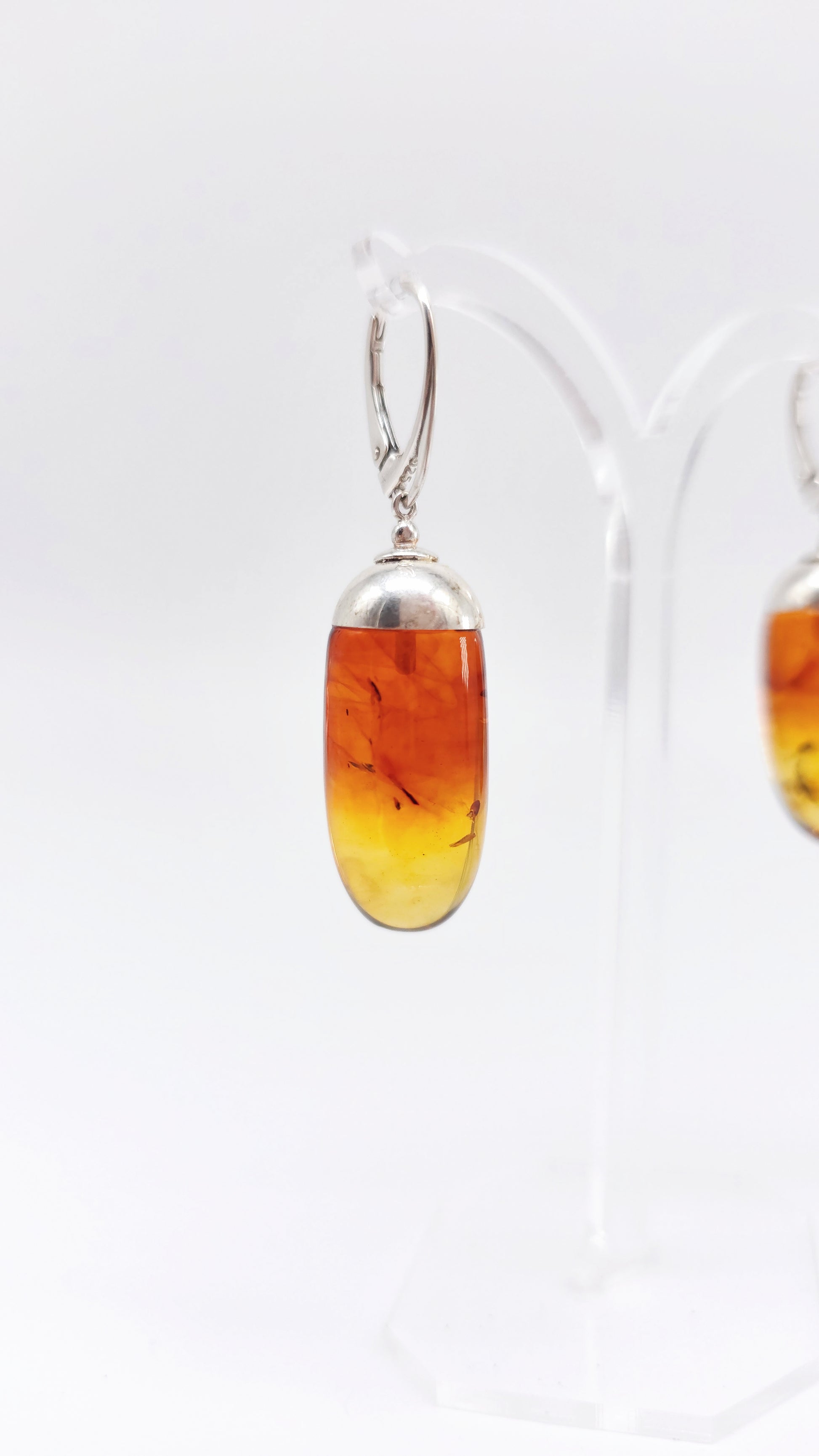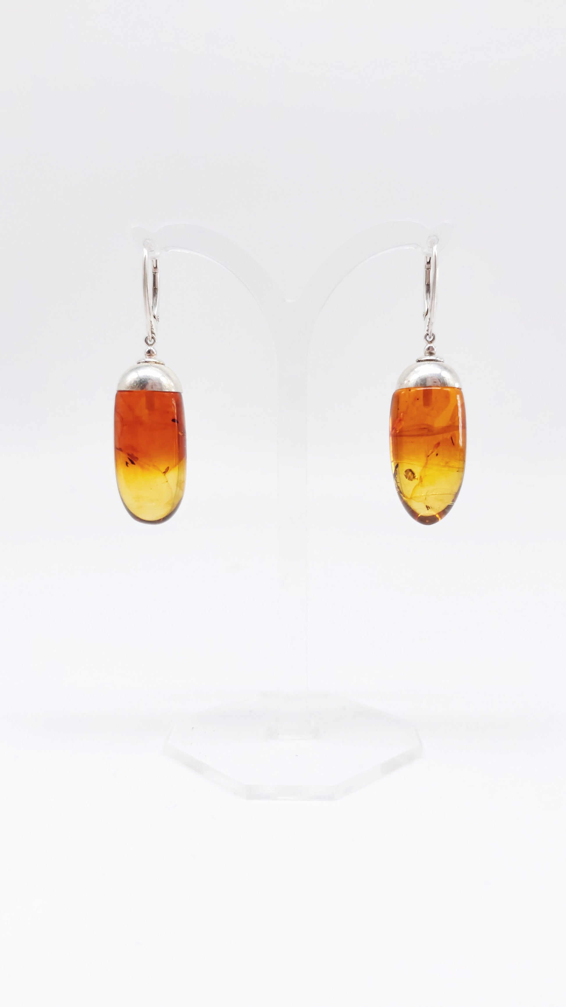 These exclusive earrings are truly one-of-a-kind pieces—artfully handcrafted and enhanced with oval-cut amber. The warm color of the amber adds a sophisticated yet natural touch to any outfit. The elegant silver finish combined with the long, drop-shaped design makes this piece a true eye-catcher.