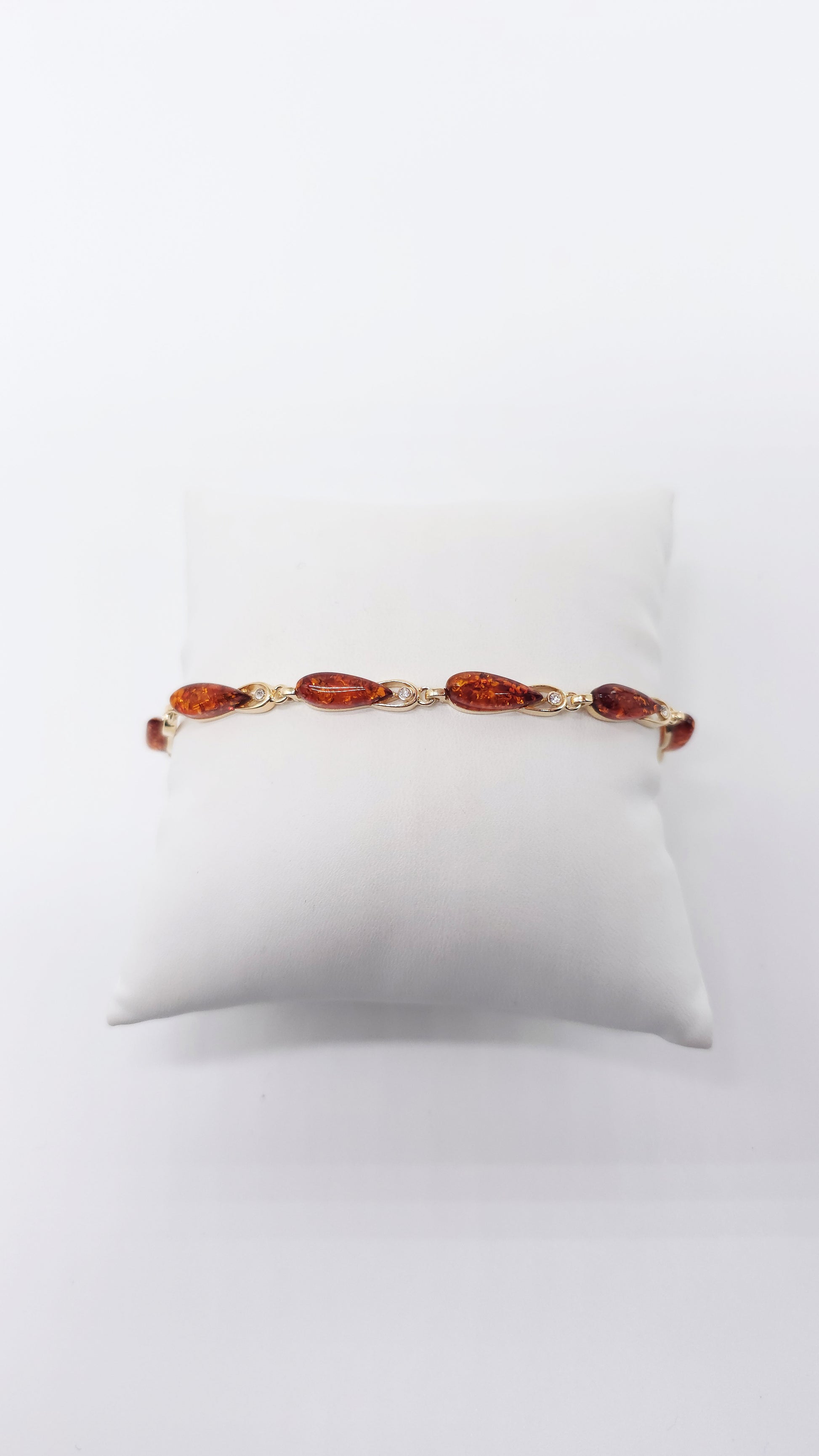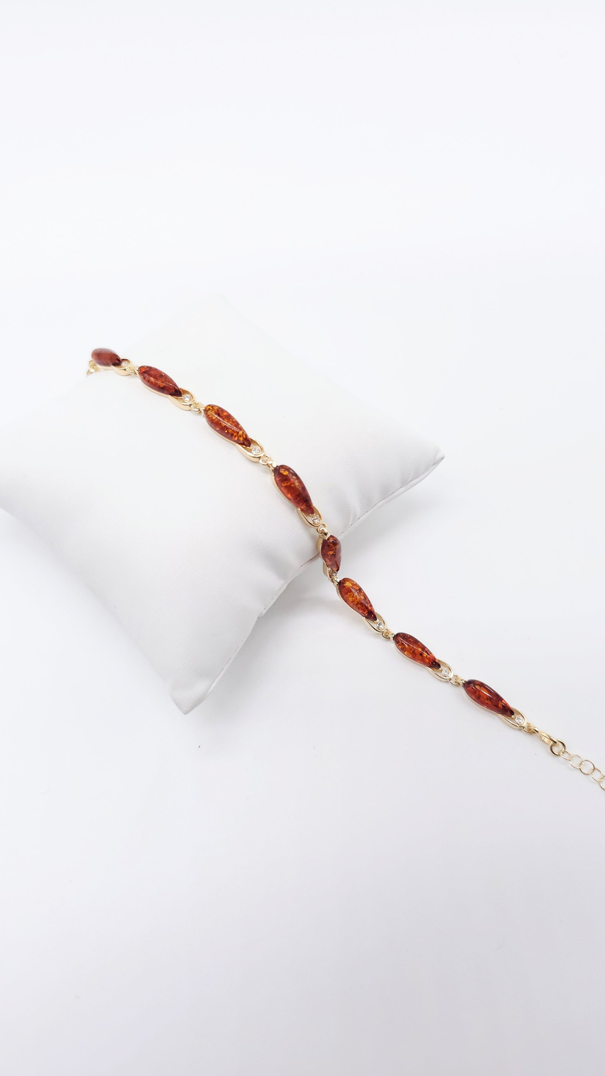 This handcrafted bracelet made of genuine natural amber impresses with its elegant teardrop shape and soft , golden sheen. Each amber stone has been carefully cut and displays a captivating interplay of warm orange and vibrant cognac. The 24-karat gold - plated setting on 925 sterling silver gives the bracelet a luxurious appeal without being overly pretentious .