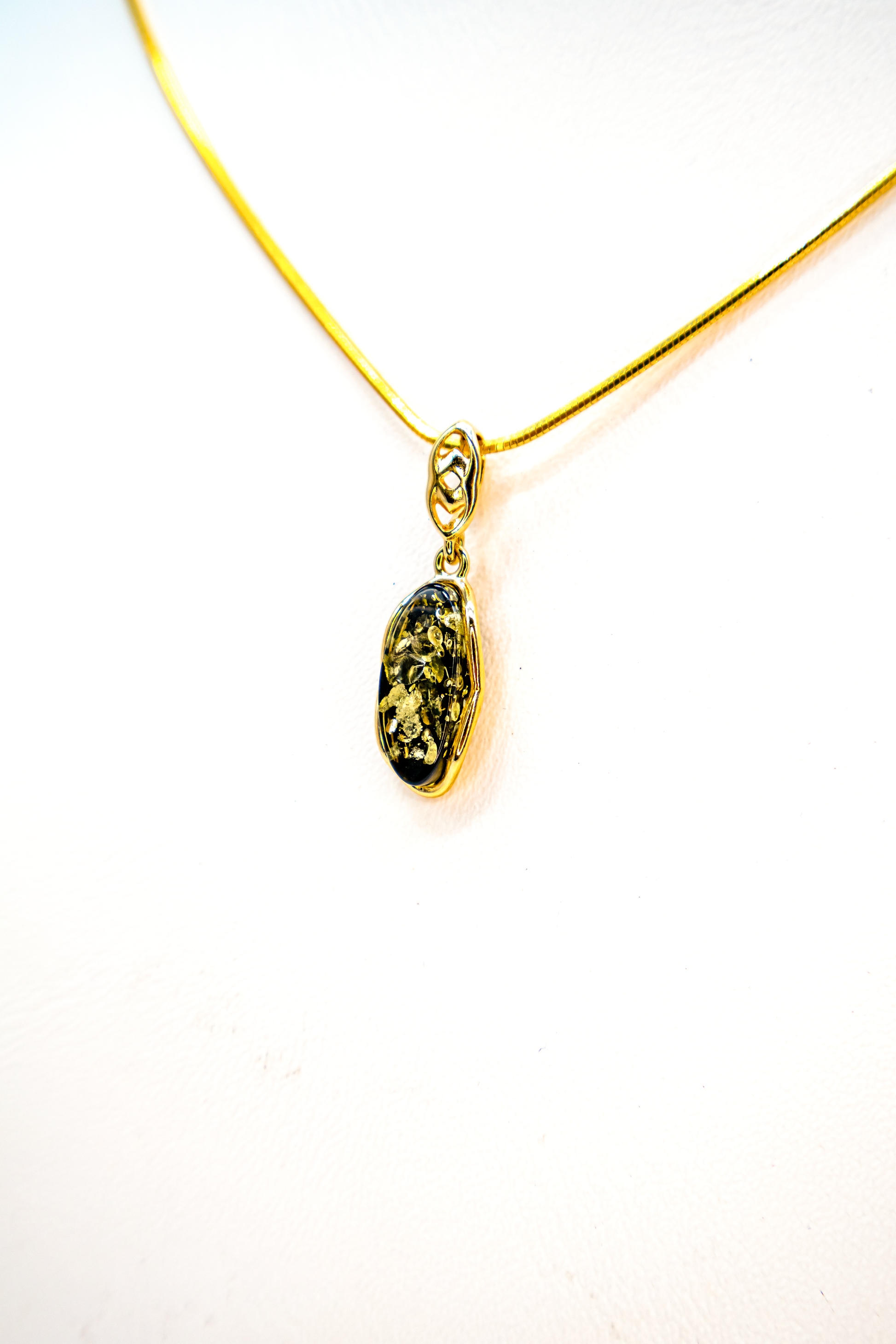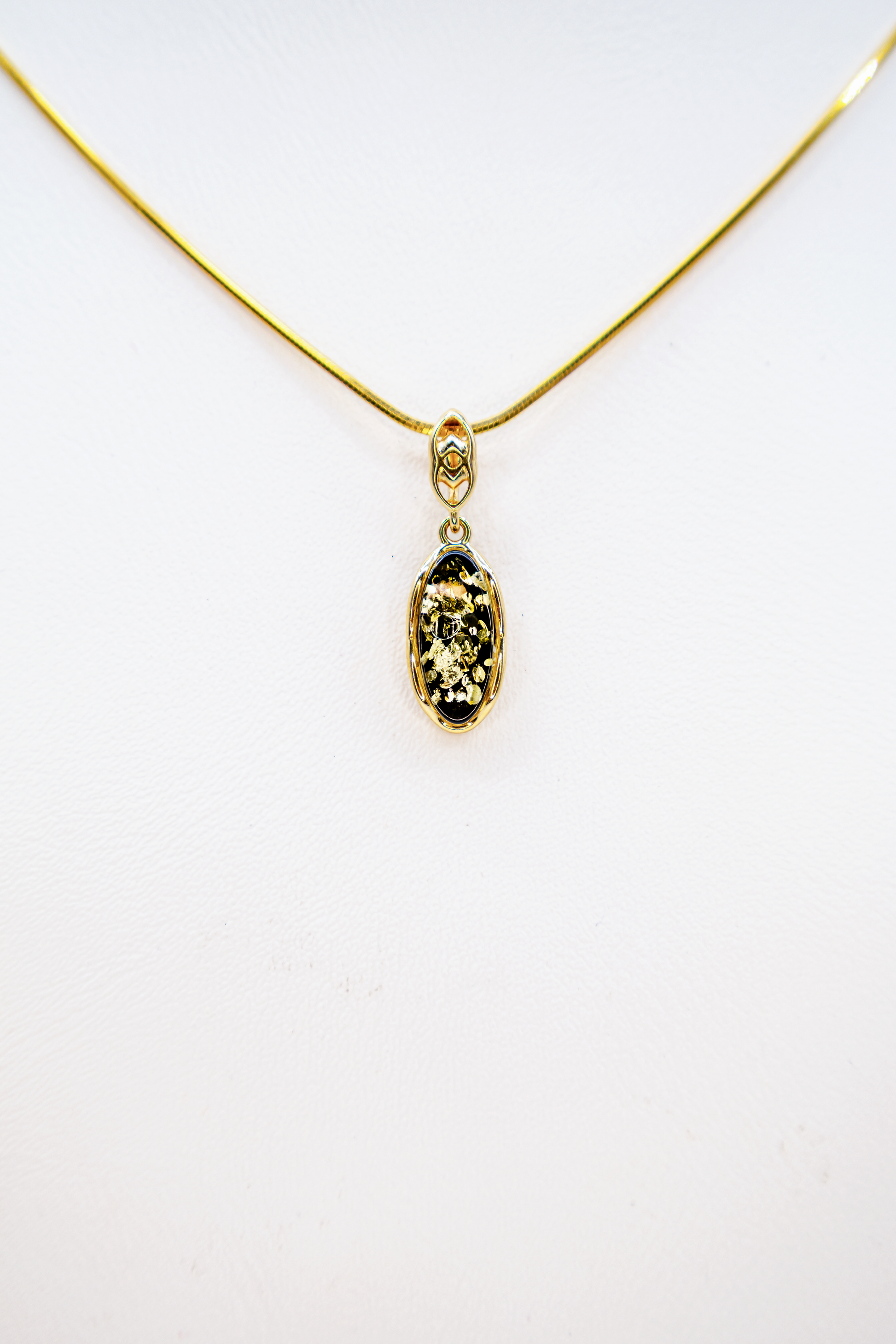 A stylish pendant that combines elegance and naturalness. Crafted from gold-plated silver and set with genuine amber in a greenish-gold hue, this piece of jewelry exudes a special depth and uniqueness. Measuring 2.8 cm x 0.8 cm, the pendant is understated yet strikingly elegant. Each piece is handcrafted and truly unique—perfect for women who appreciate something special. Whether as a gift for your wife, sister, or girlfriend, this pendant is a timeless choice that will bring long-lasting joy.
