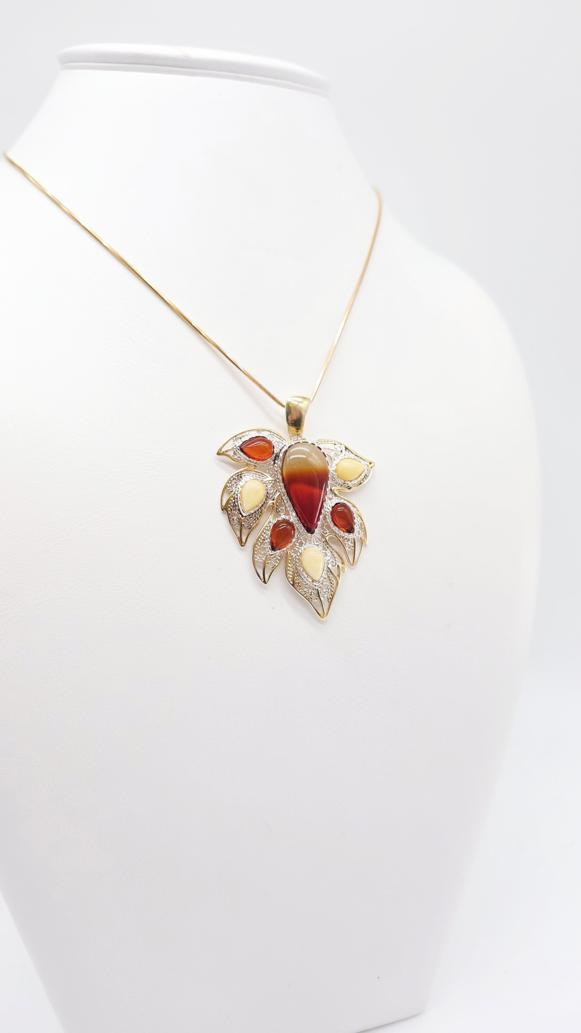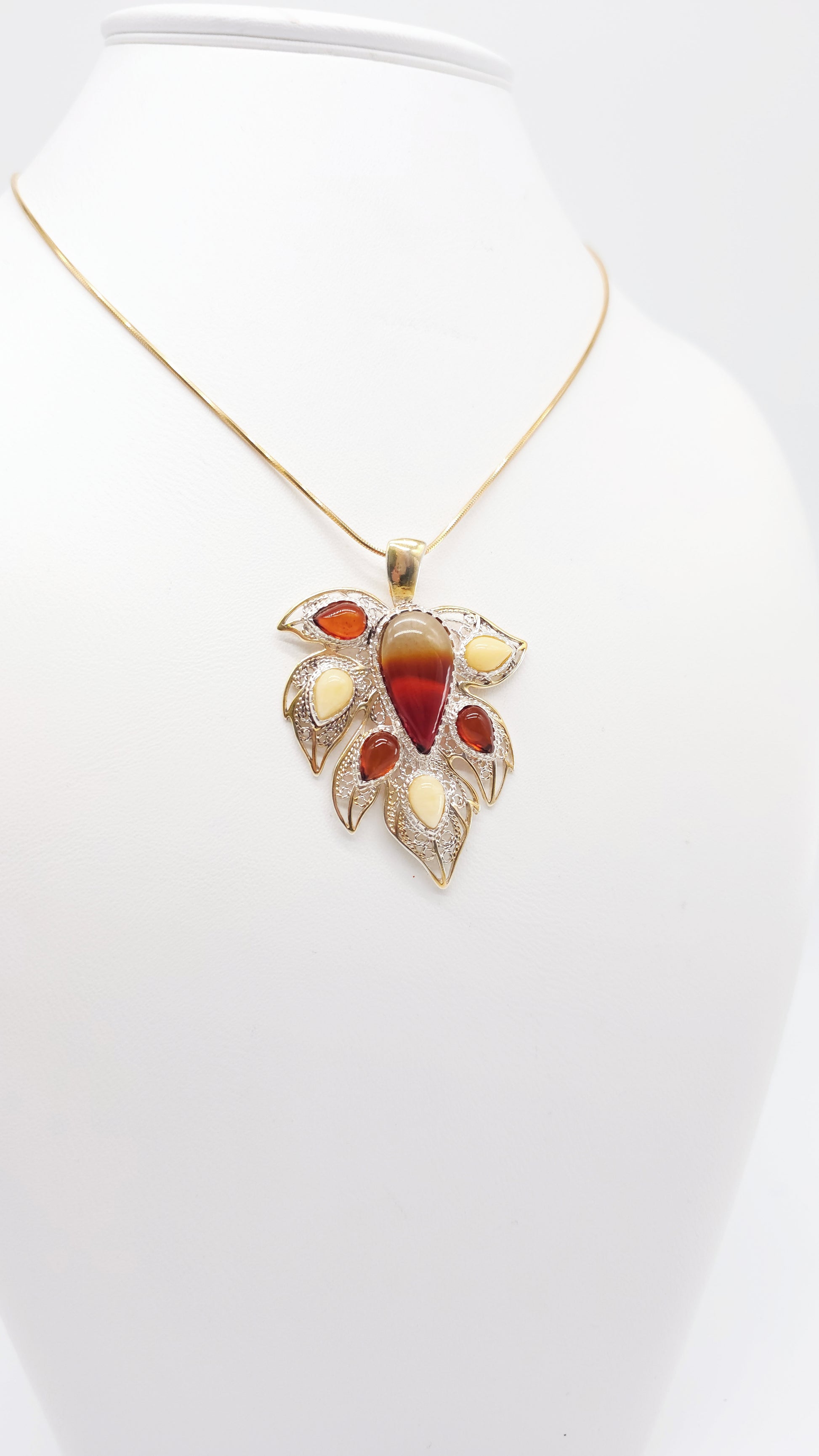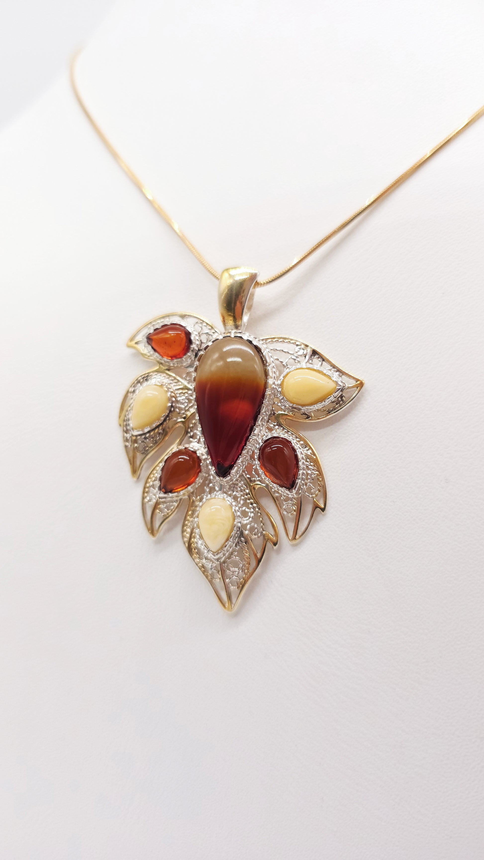 Discover a truly unique piece of jewelry: This elaborately crafted amber pendant in an artistic leaf shape captivates with its extraordinary design and the warm color palette of genuine amber. Each piece is handcrafted and unique—ideal for those who appreciate something special. The pendant is made of high-quality 925 sterling silver, plated with 24-karat gold. Two color variations are available—both with harmonious amber tones ranging from cognac to honey to milky white. A stylish gift for special people or a real eye-catcher for your own jewelry collection.