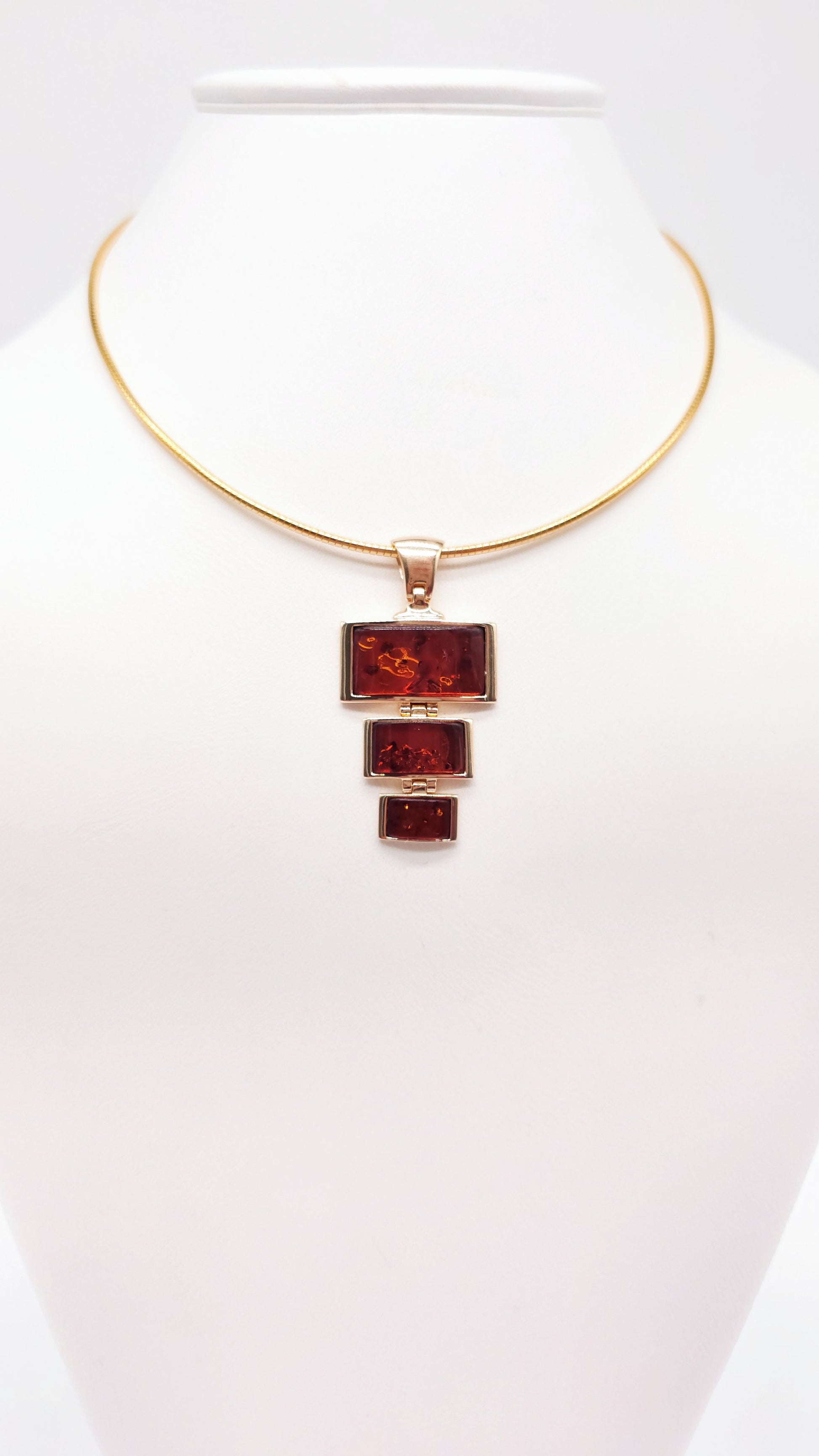 This extraordinary amber pendant captivates with its architectural design and the intense luster of the fiery orange natural amber. Three rectangular amber segments in descending size are artfully connected and set in gold-plated 925 sterling silver. Each stone is unique, with unique inclusions and vibrant color intensity. Amber traditionally represents joie de vivre, warmth, and creativity. The pendant is an excellent meaningful gift for women who appreciate special, high-quality jewelry—for birthdays, anniversaries, or as a unique personal statement. Measuring 5.5 x 2.8 cm, it is a striking eye-catcher that remains stylish and elegant.