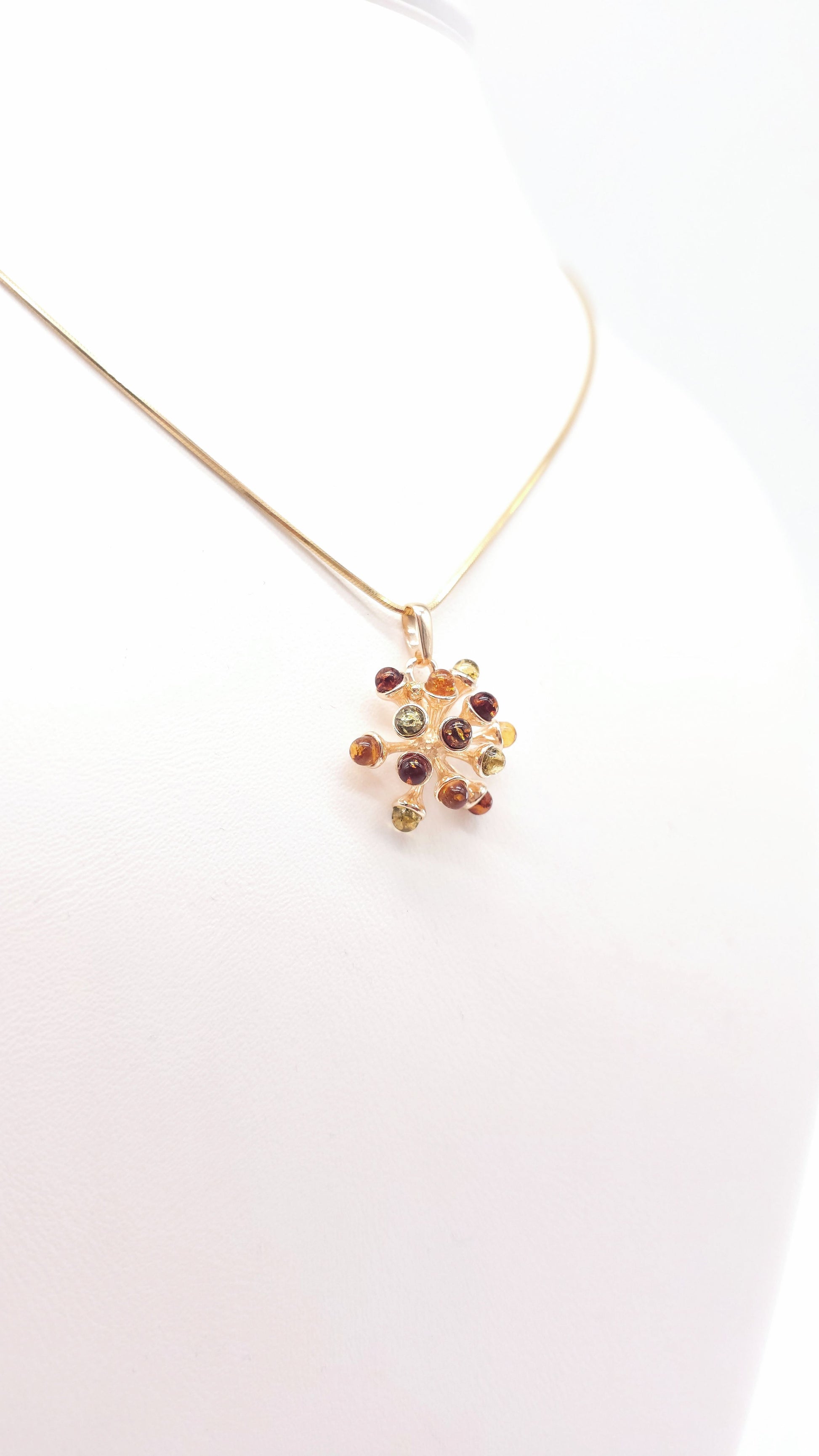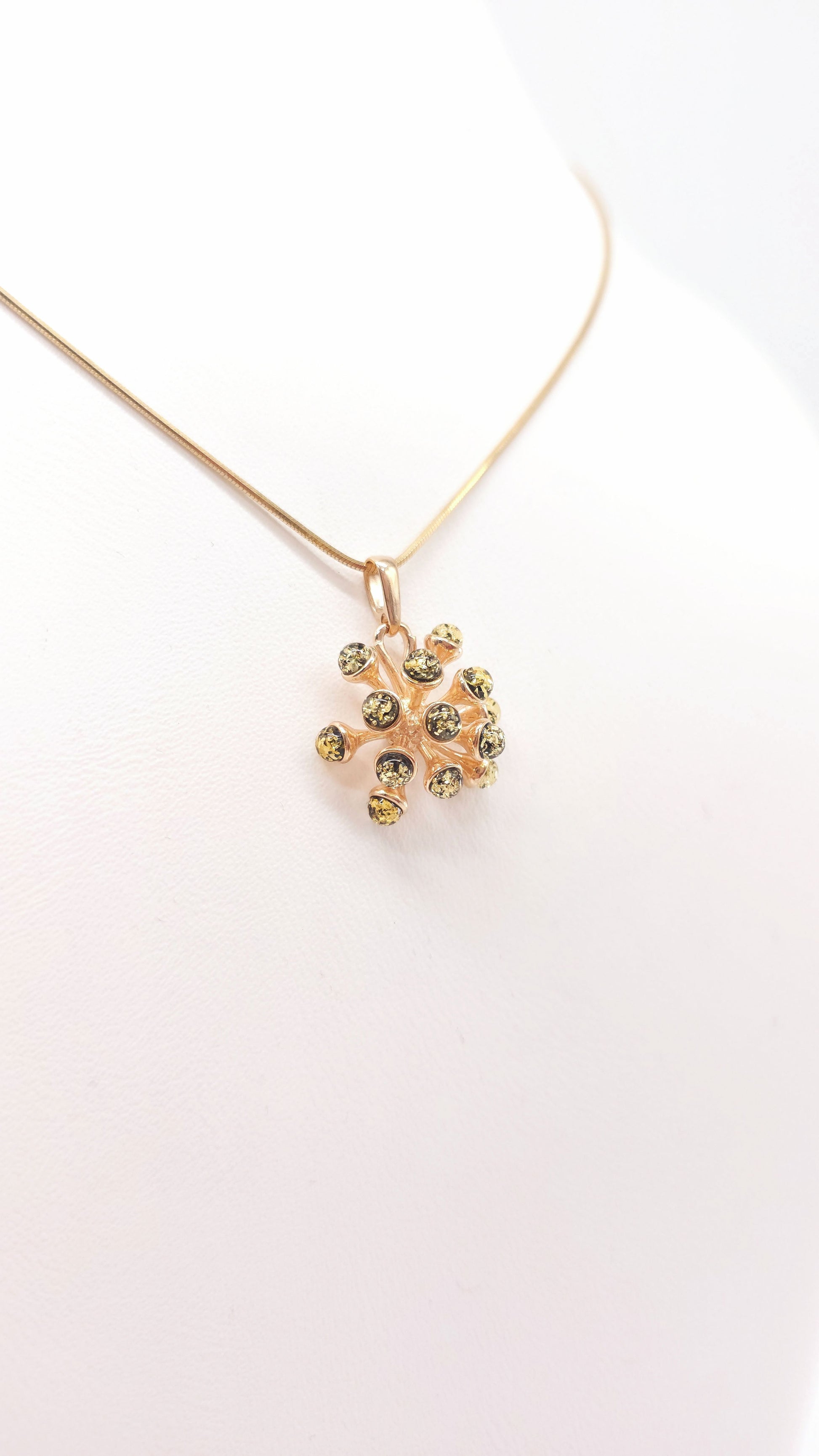 This elegant amber pendant captivates with its extraordinary design—a harmonious interplay of eleven small amber spheres in a modern, geometric, floral arrangement. The intensely shimmering green and gold inclusions create a vibrant play of colors that make the pendant a true eye-catcher.