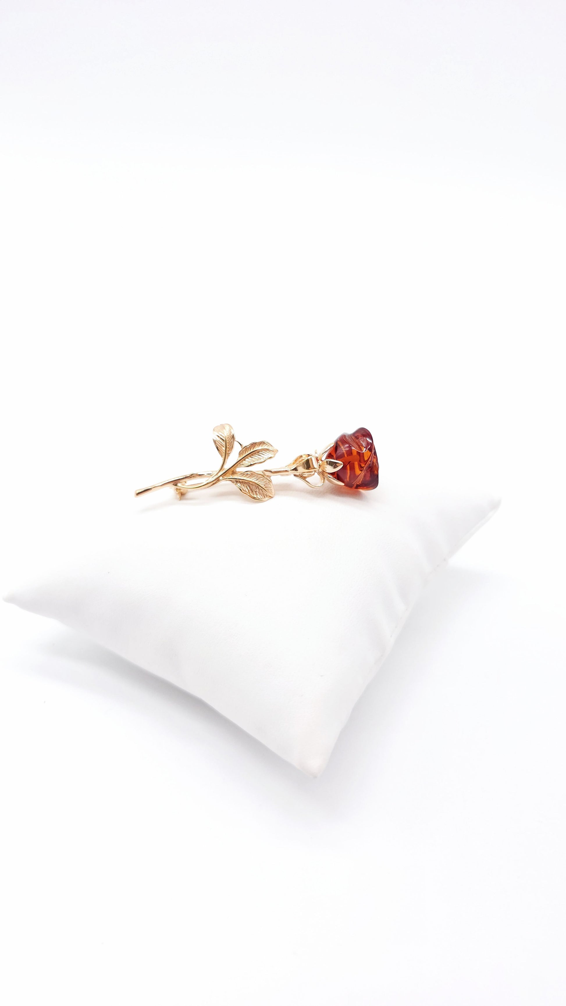 This elegant gold-plated rose-shaped brooch combines timeless elegance with romantic charm. The highlight is the intricately detailed rose blossom made of genuine amber, whose natural grain and color make each brooch unique .
