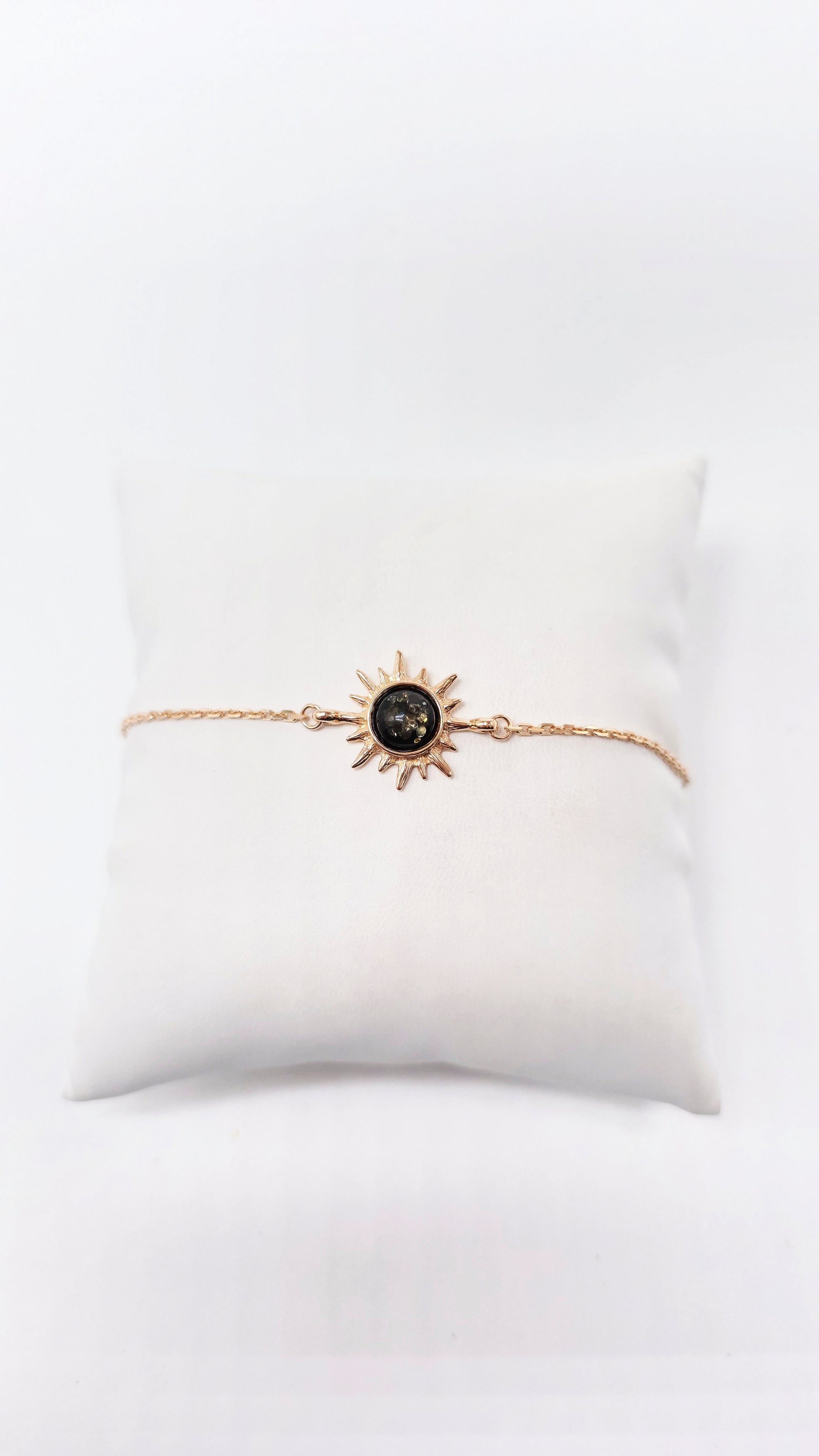 This wonderfully delicate bracelet with a sun motif brings light and warmth to your wrist. At its center shines a genuine, intensely luminous natural amber stone, set in gold-plated 925 sterling silver. The delicate chain with a lobster clasp ensures a secure and comfortable fit , while the symbol of the sun represents joie de vivre, strength , and warmth .