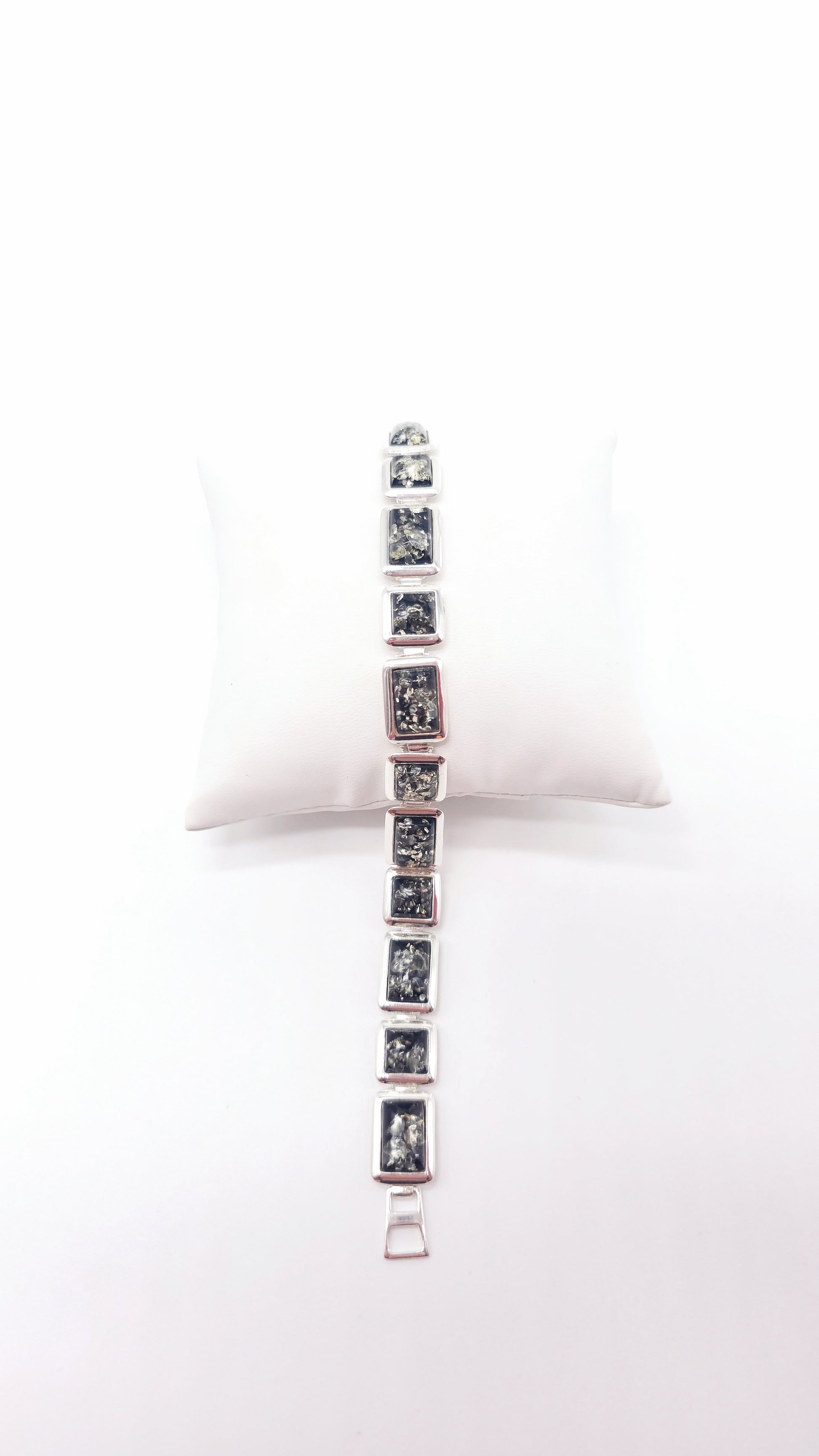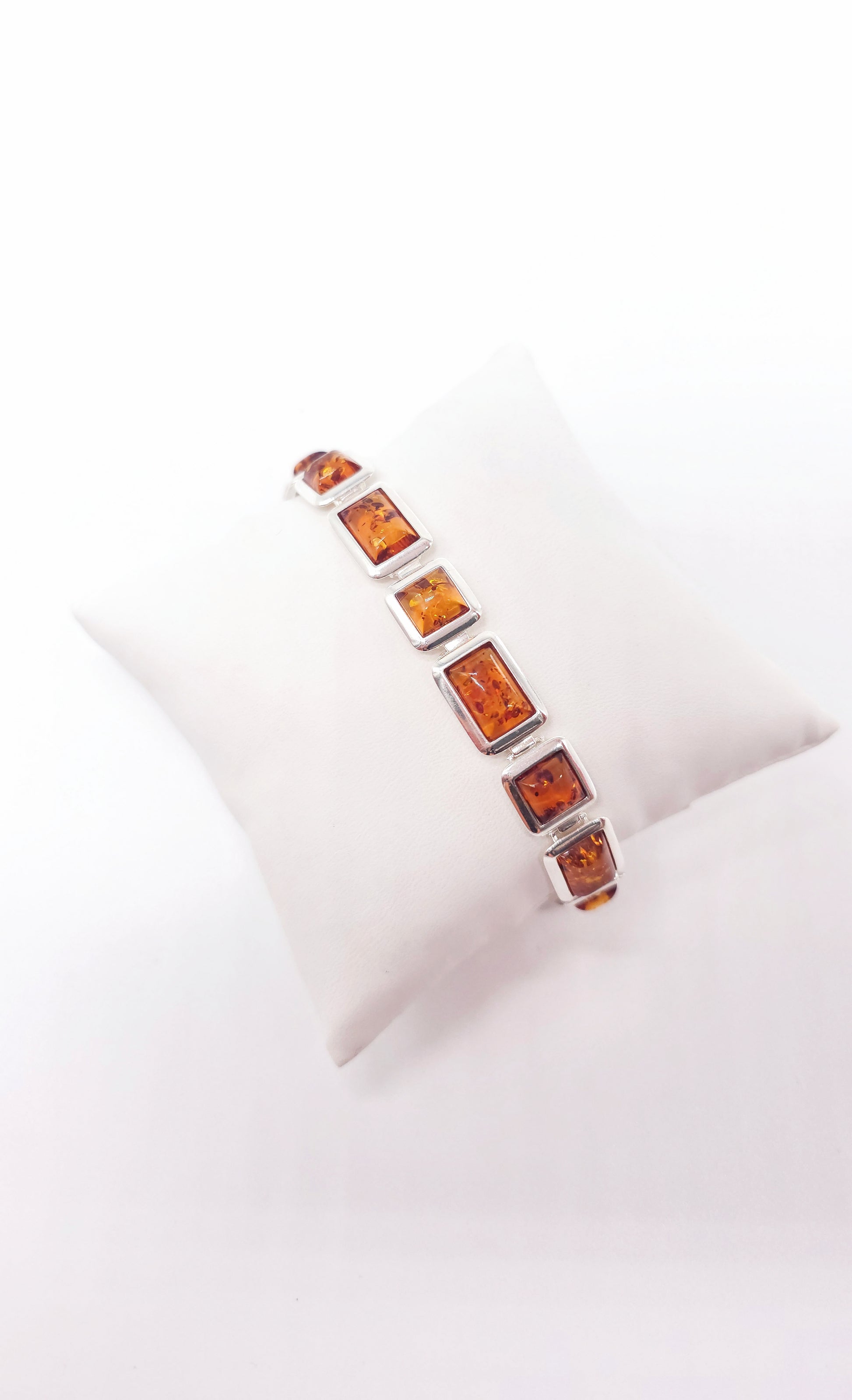 This handmade silver bracelet captivates with its clean lines and high-quality rectangular amber elements. Each natural stone is set in the finest 925 sterling silver and unfolds its full effect through the precise, polished surface.
