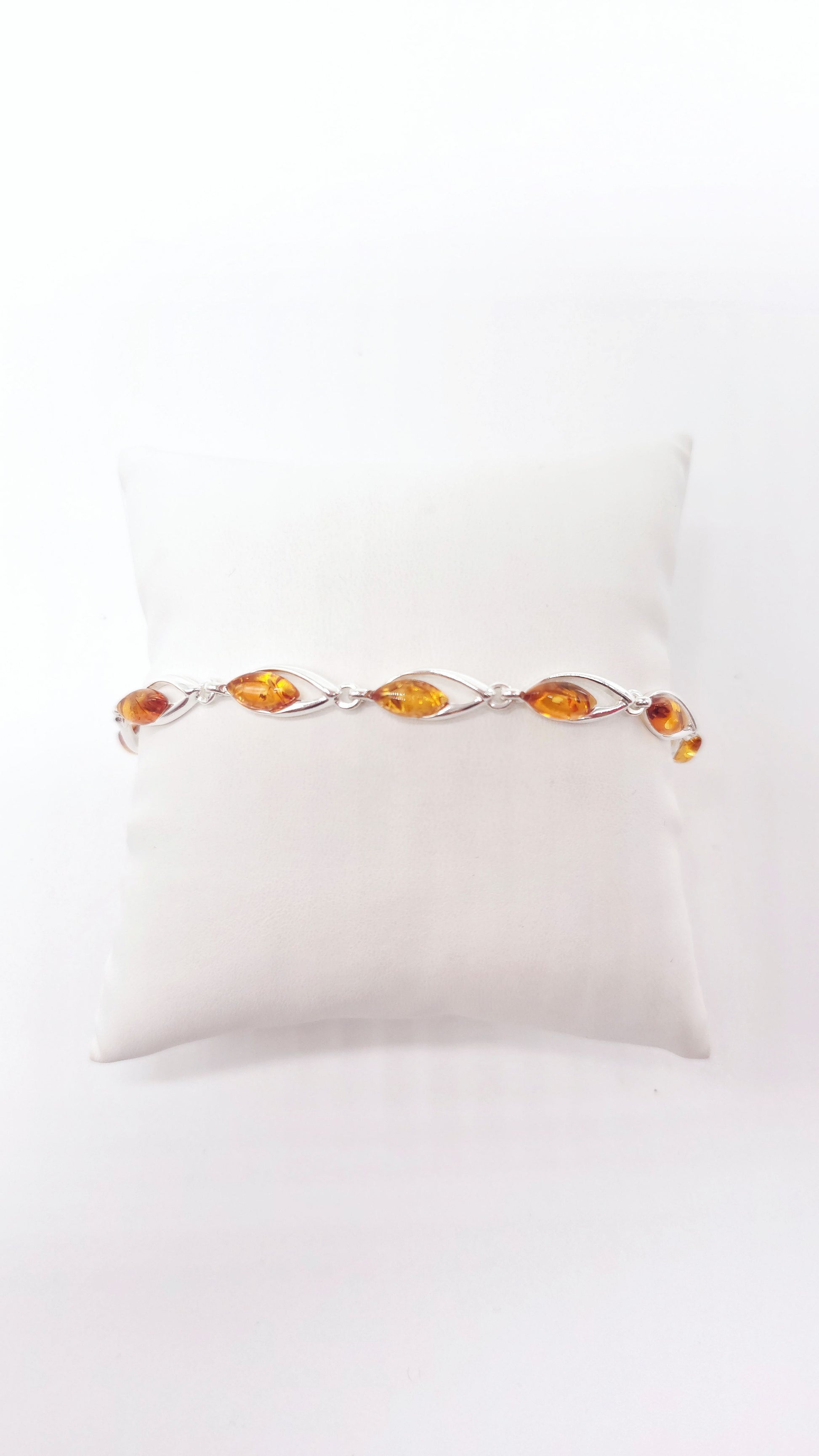 This delicate bracelet made of 925 sterling silver enchants with its delicate elegance and sophisticated design, featuring marquise-shaped settings in which high-quality, genuine natural amber sparkles. The warm amber tones harmonize perfectly with the cool silver, creating an expressive piece of jewelry that can be worn stylishly both everyday and on special occasions.