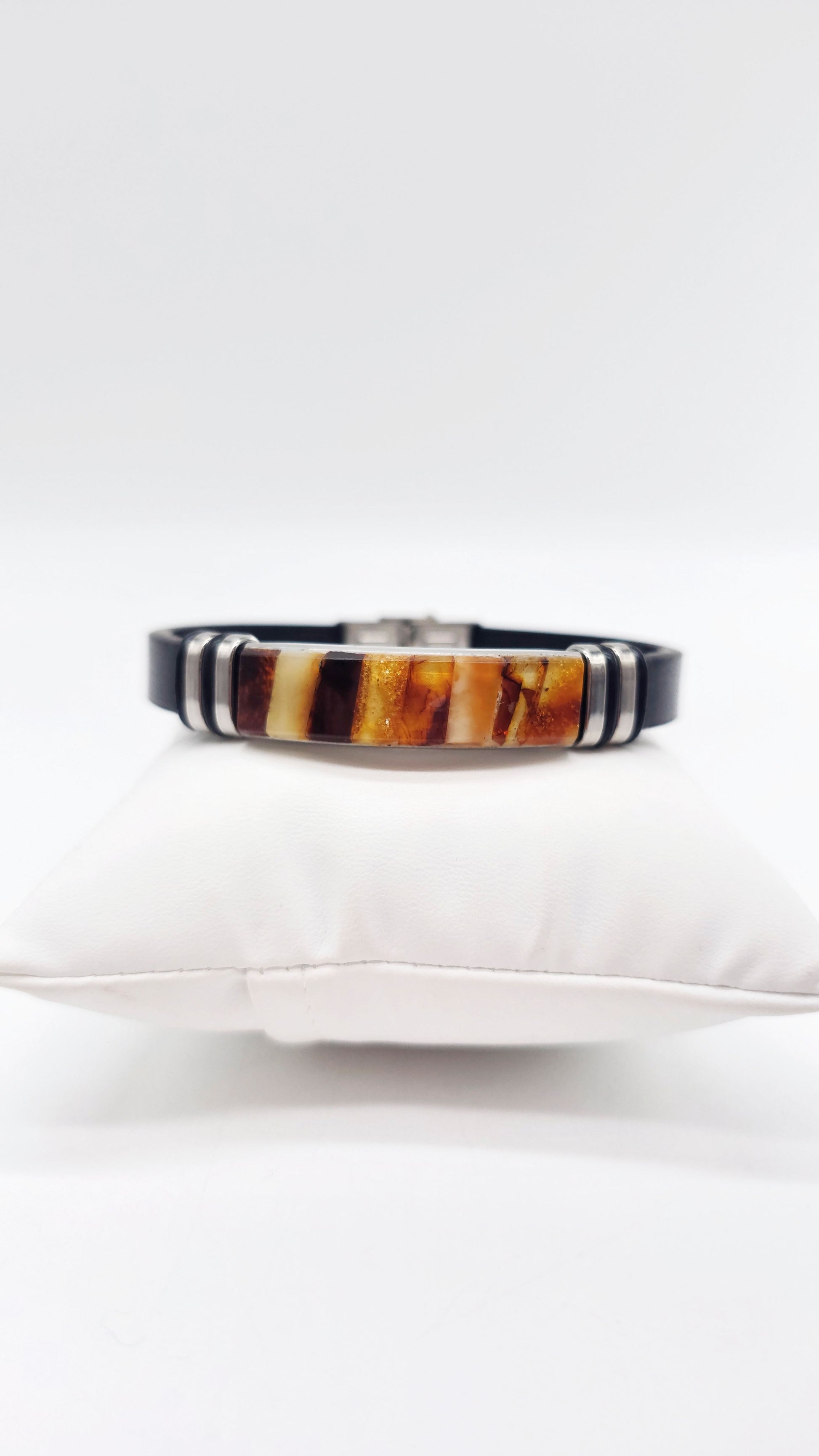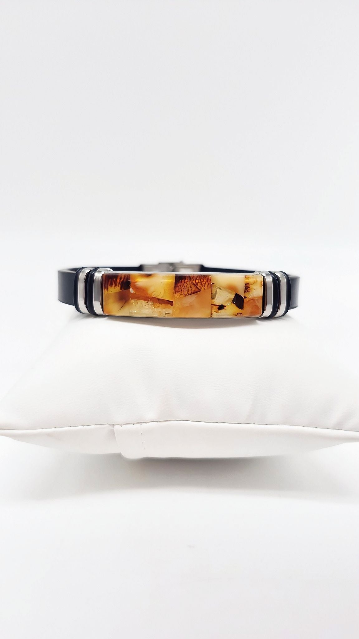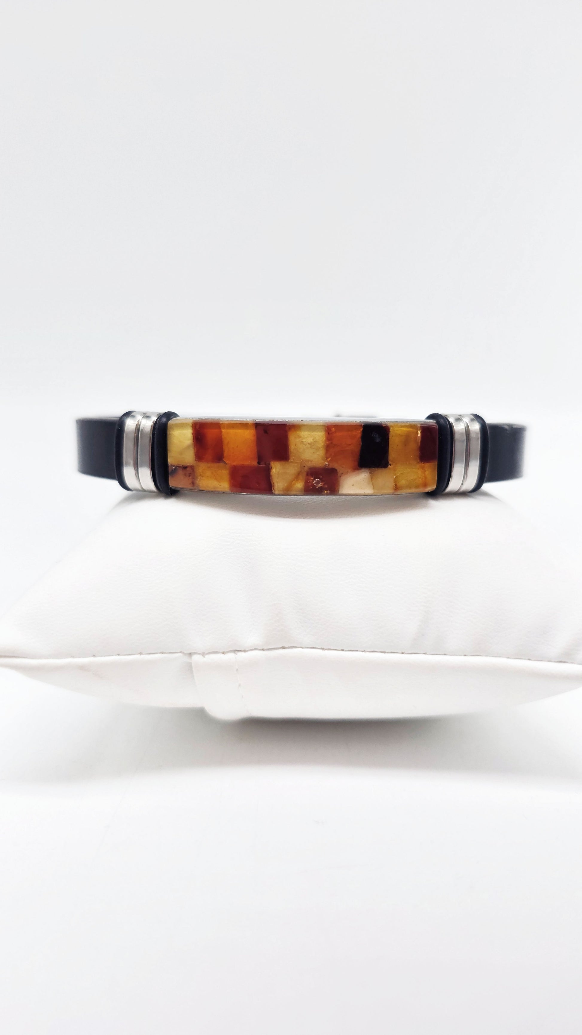 This elegant bracelet combines genuine natural amber with high-quality leather and stainless steel to create a modern accessory for men and women. Each amber piece has been carefully set by hand and impresses with its unique grain and variety of colors – from warm honey tones to dark cognac.