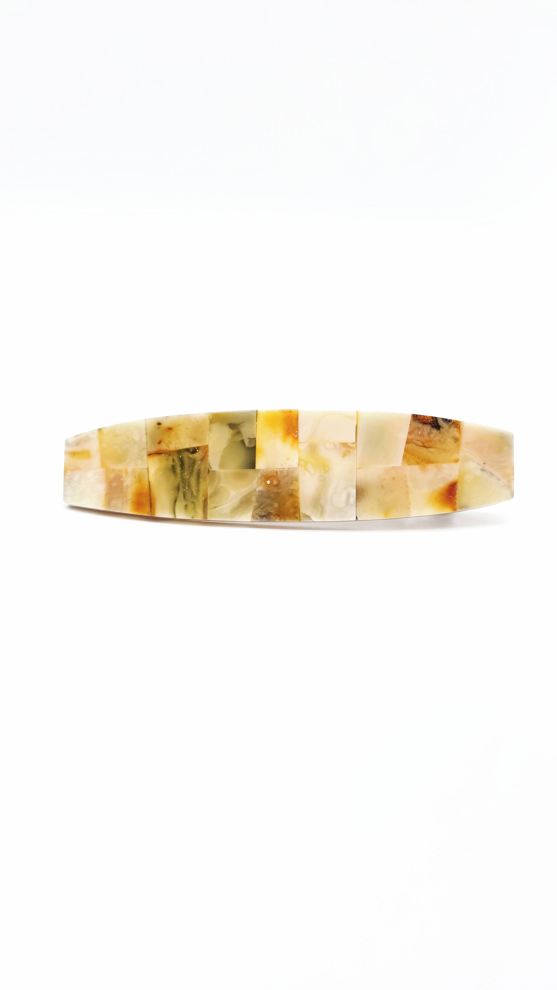 This elegant amber hair clip with an automatic closure combines stylish design with practical convenience. Crafted from genuine, light-colored natural amber, each hair clip is unique—the fine grain and warm coloring vary from piece to piece, making each one truly unique.