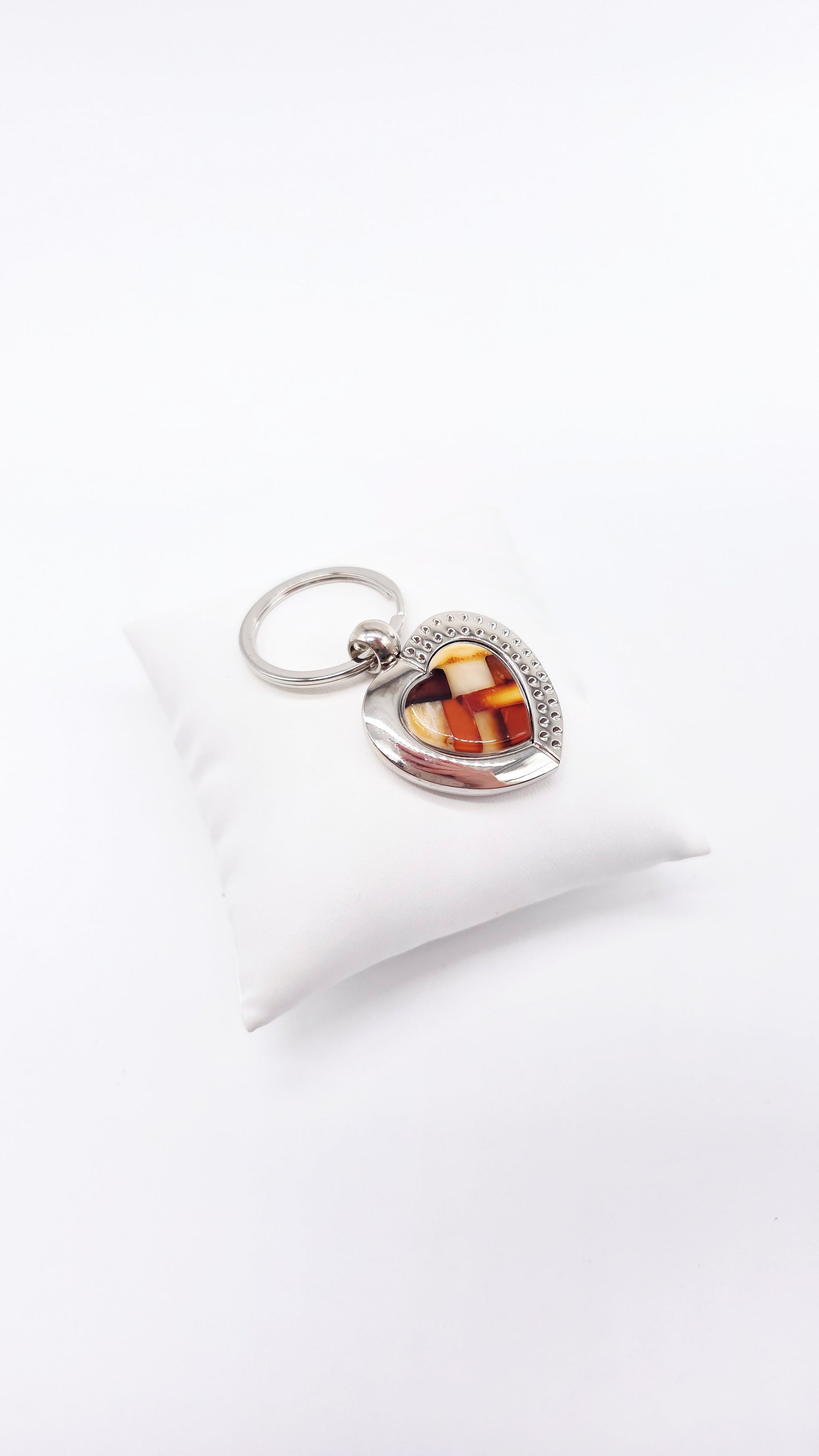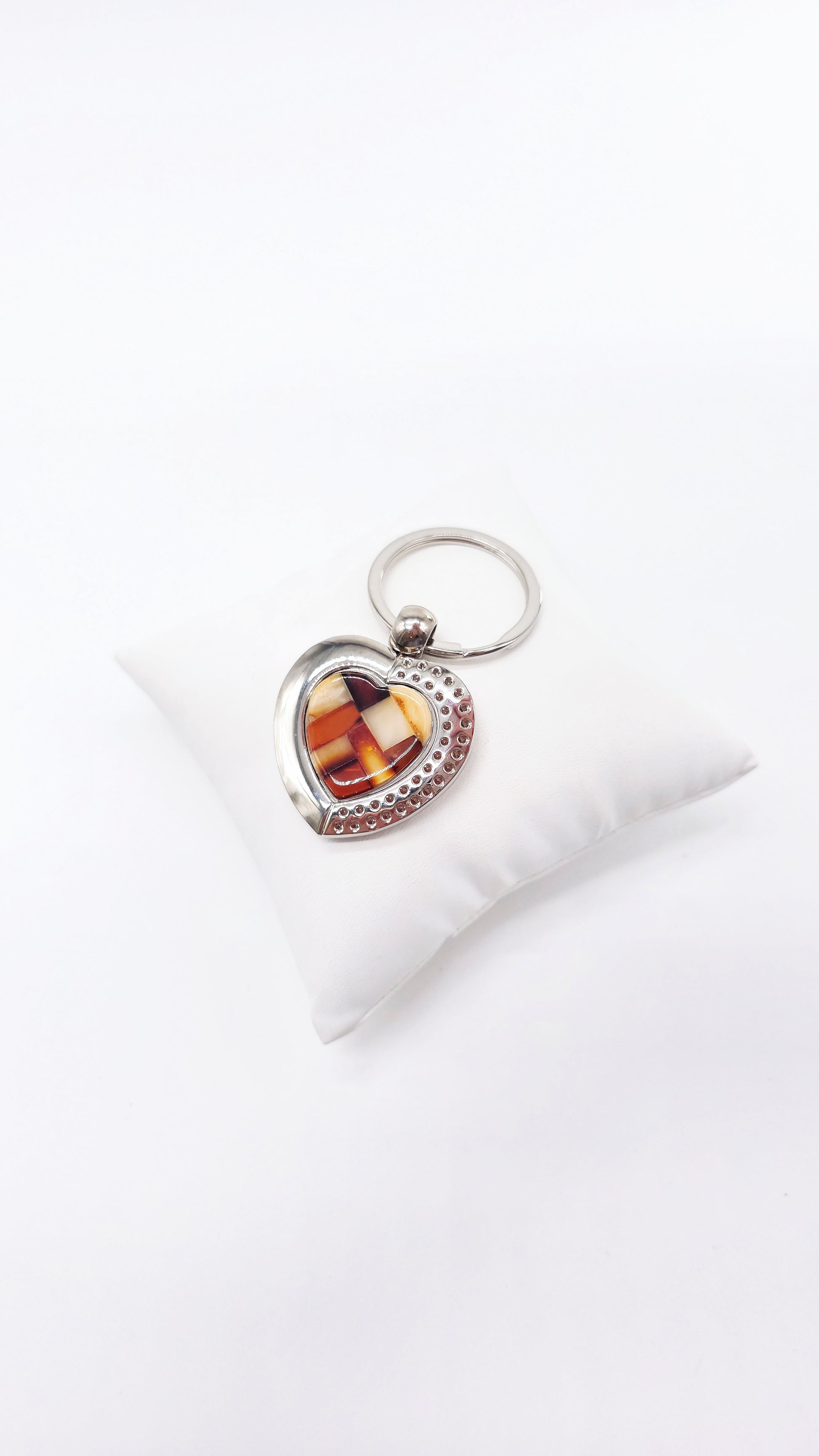 This beautiful heart-shaped keychain features an artfully crafted inlay of genuine amber . The warm, natural tones of the amber are lovingly arranged by hand to create an elegant mosaic pattern —each piece is truly unique!