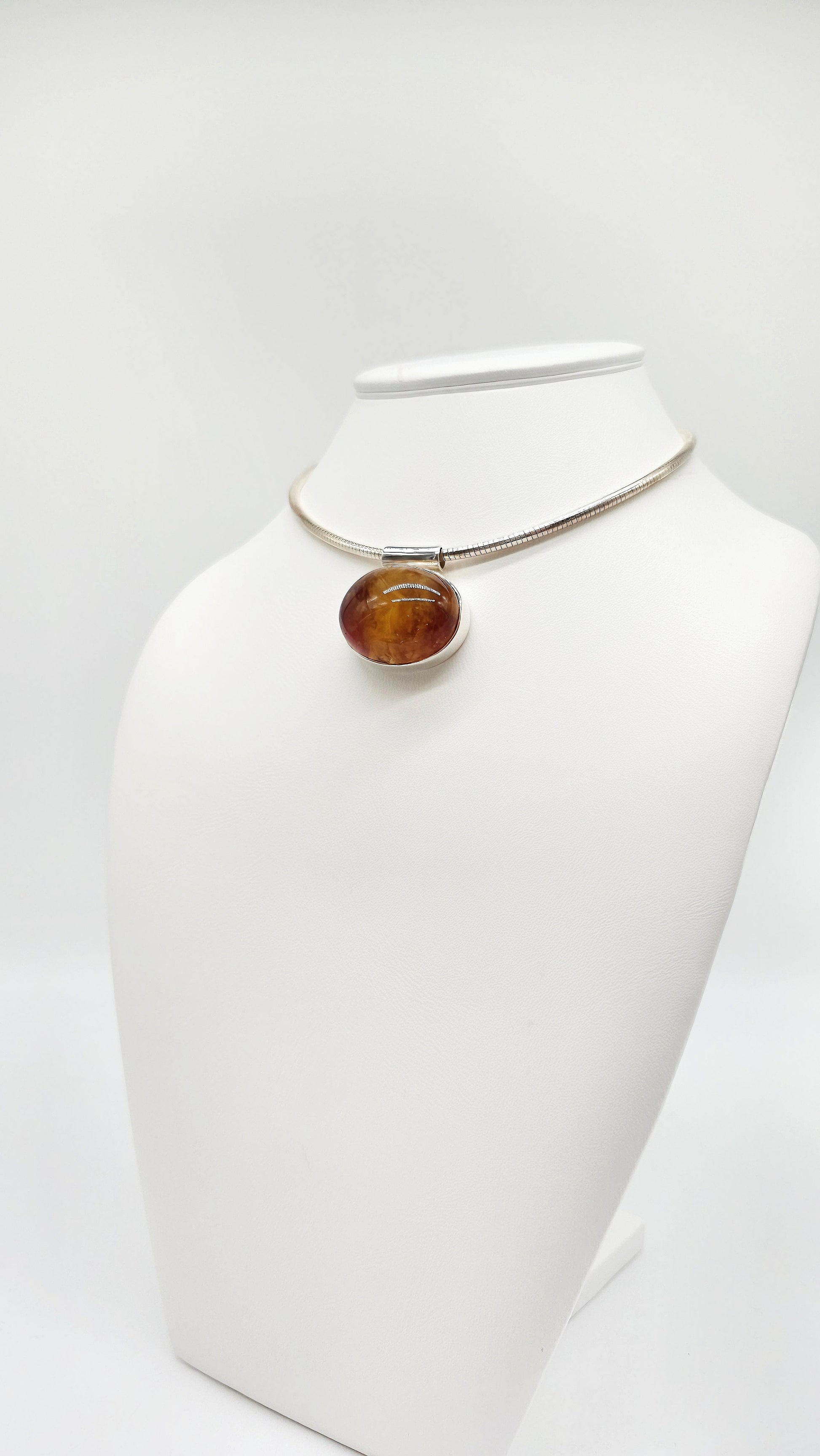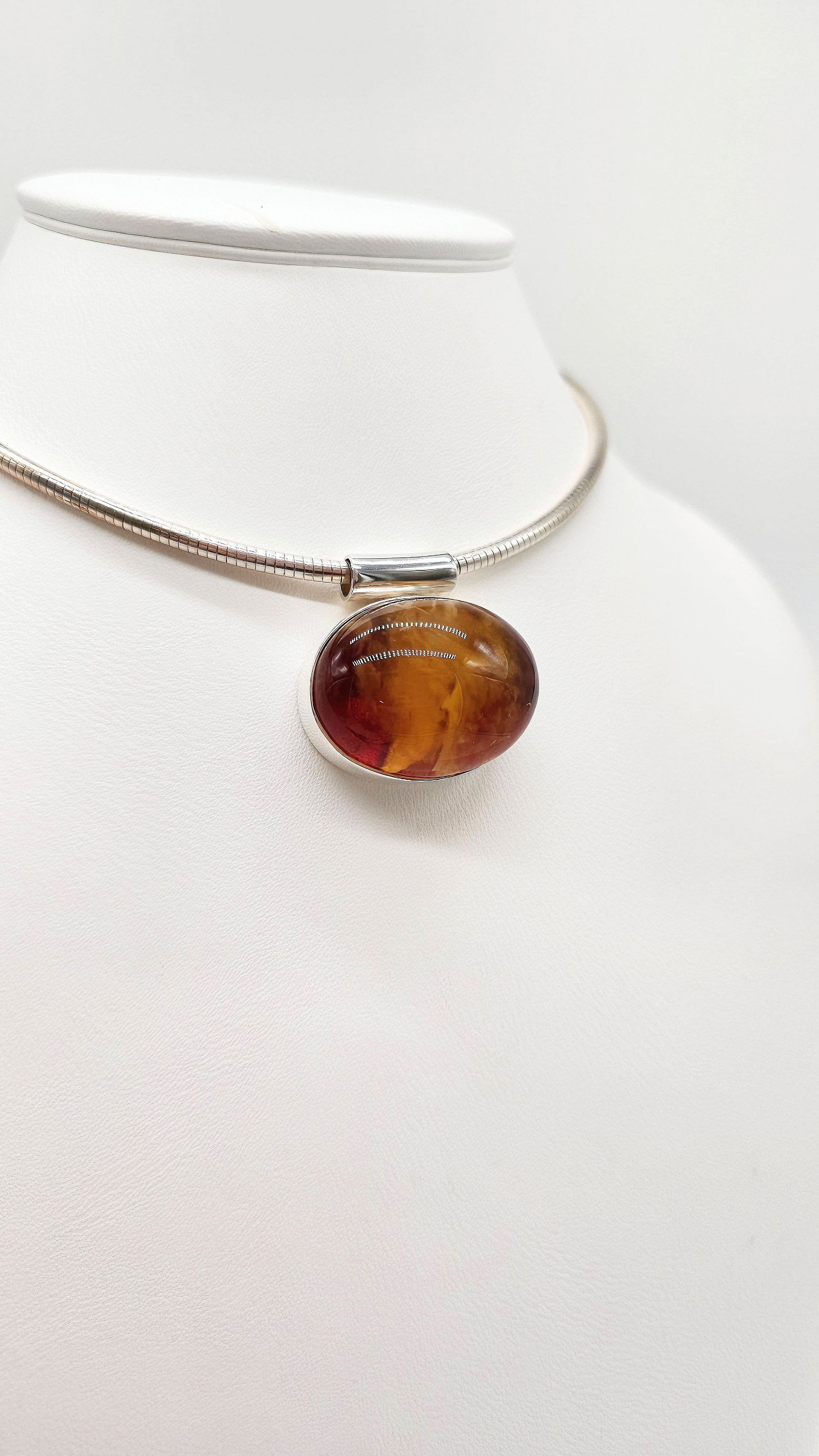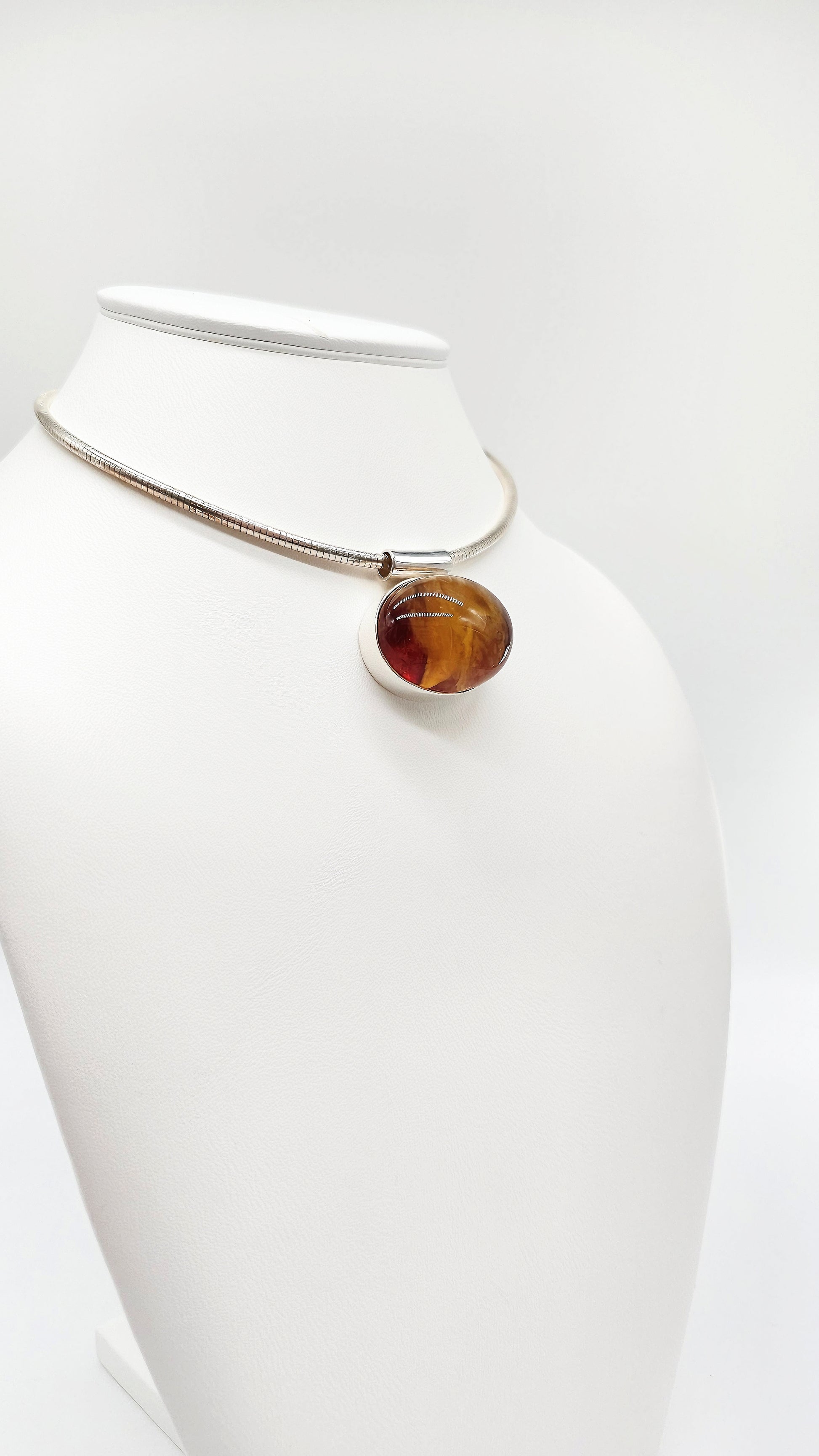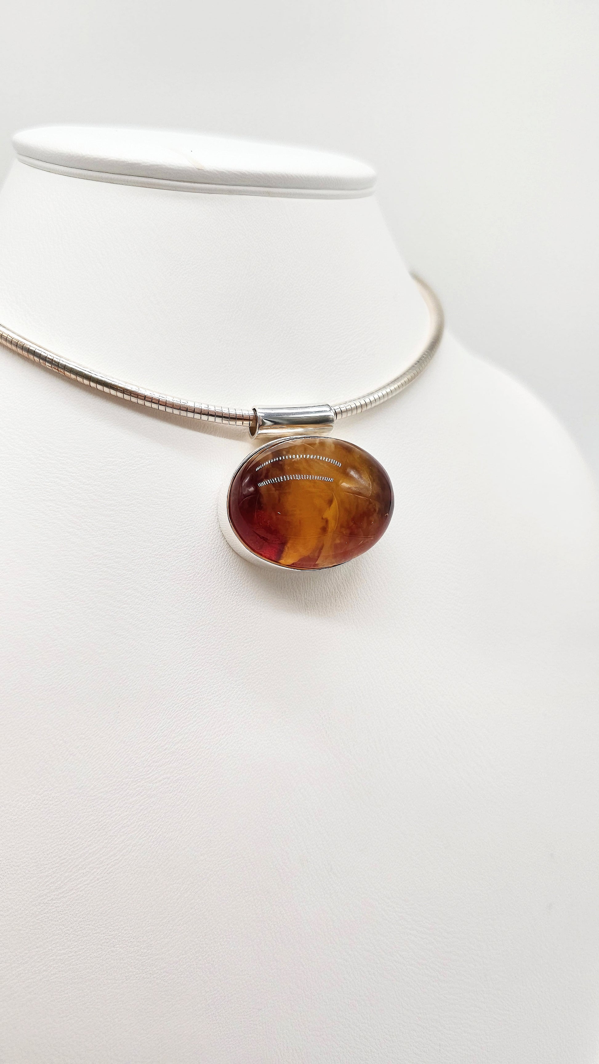 This handcrafted amber pendant is a truly unique piece—a true piece of nature at its most beautiful. The large, oval amber charms with its warm color palette, from cognac to honey to ruby red . Set in exquisite 925 silver, it gently nestles against the skin, enhancing depth, naturalness, and style.