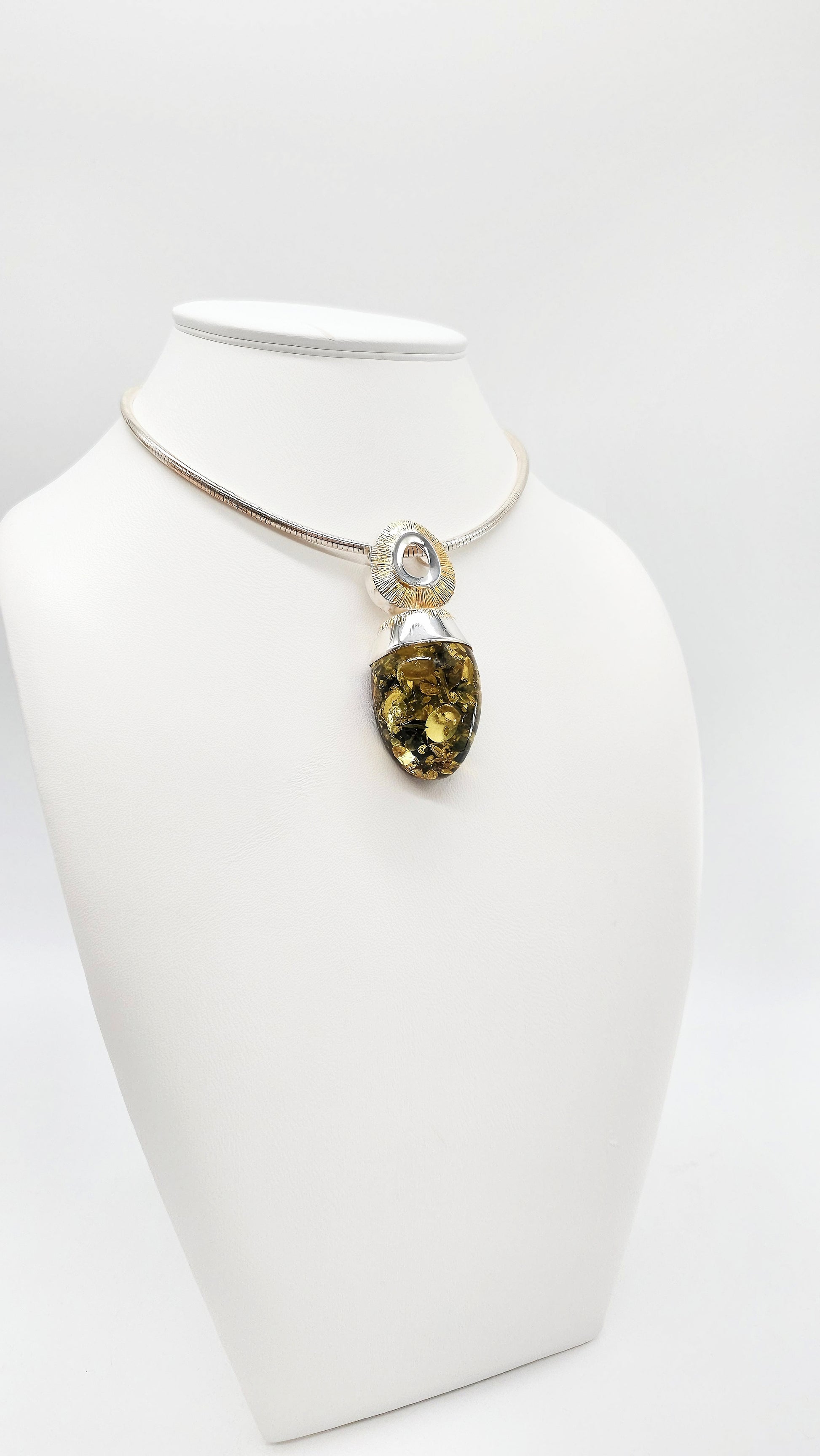 Unique, elegant, and powerful – this one-of-a-kind pendant made of genuine green natural amber is a true masterpiece of craftsmanship. Set in exquisite 925 sterling silver with gold-plated accents, it adds a stylish touch to any outfit.