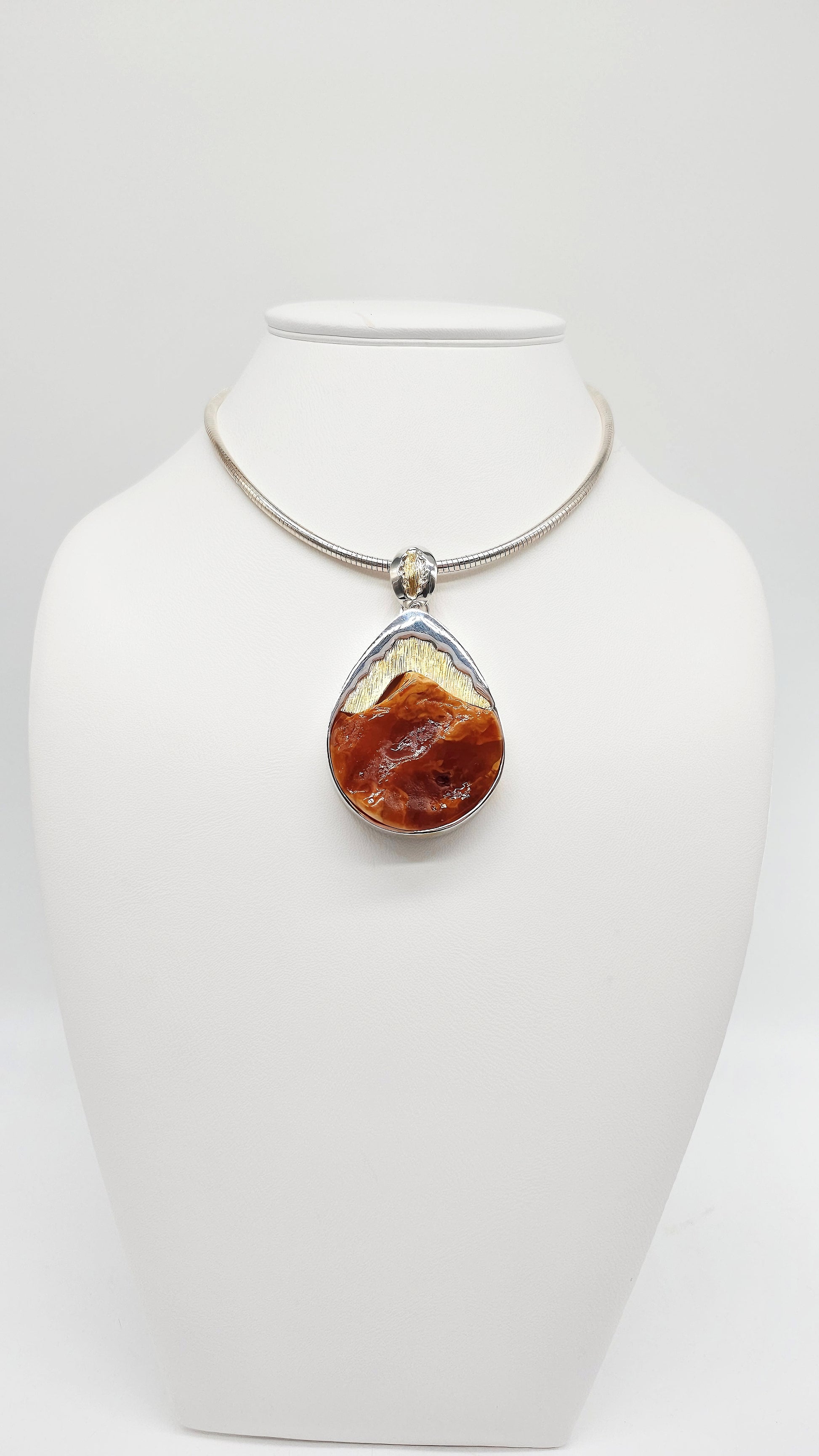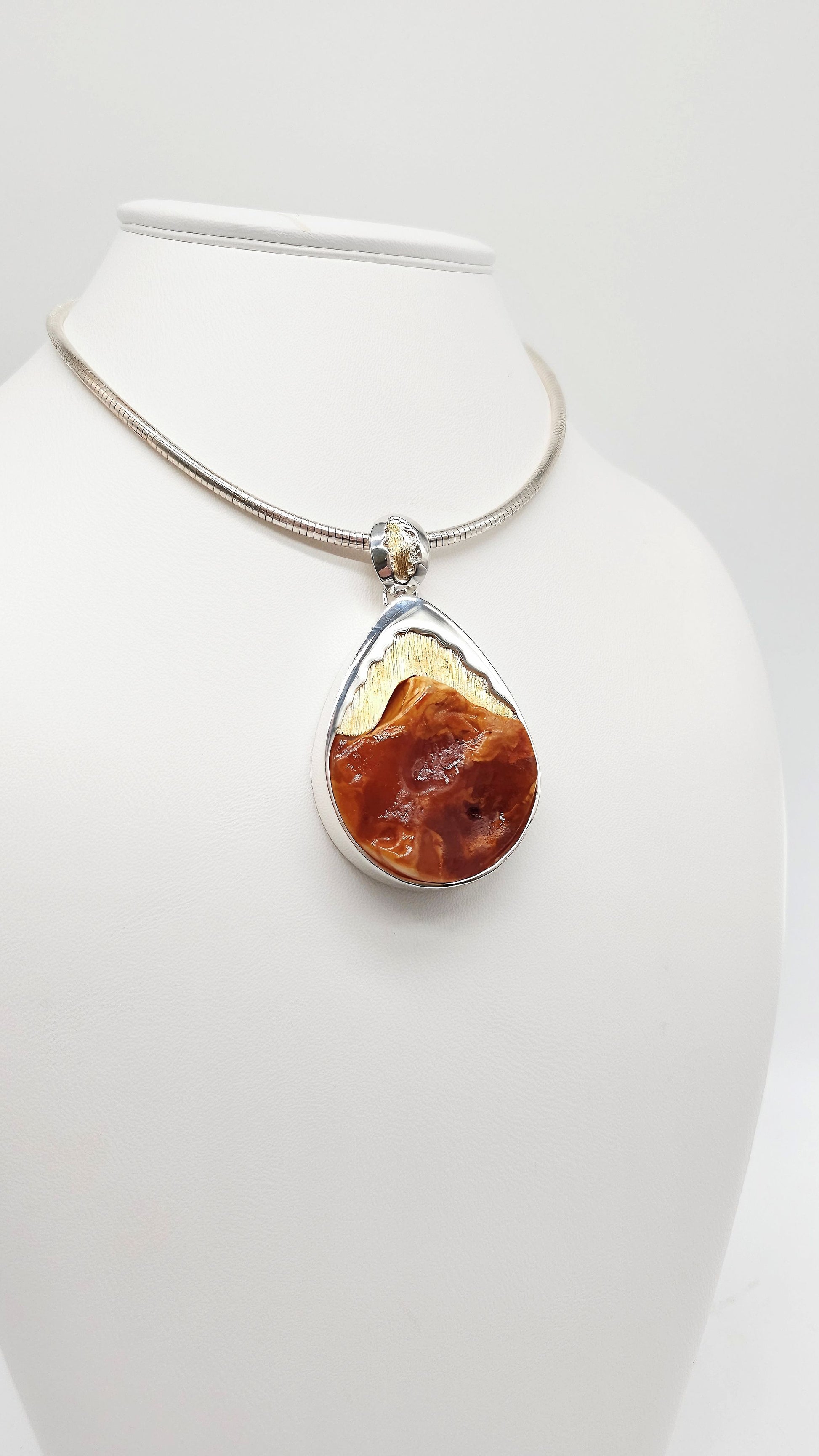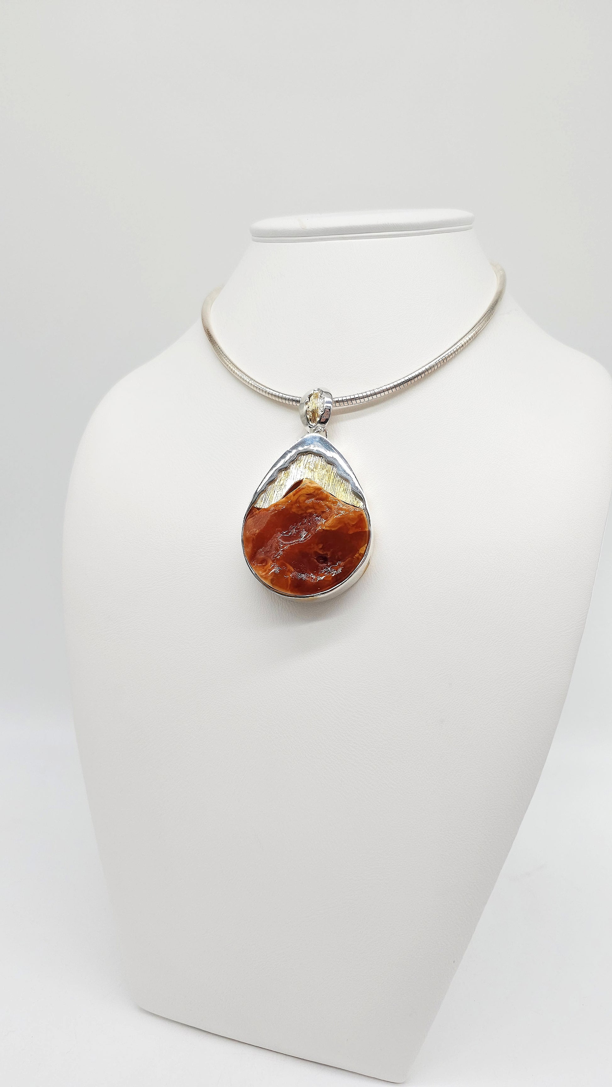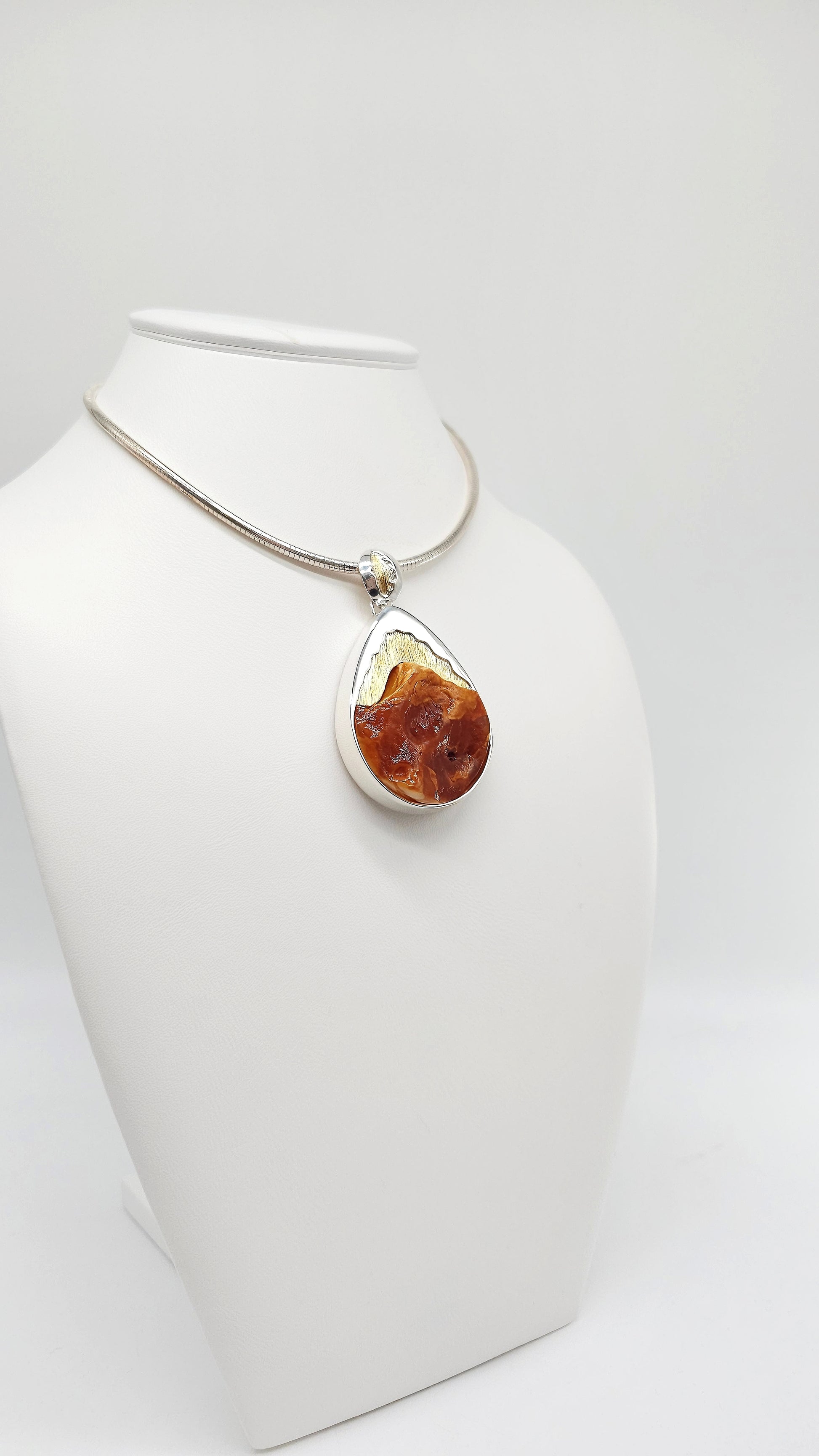 This unique, teardrop-shaped amber pendant is truly one of a kind – handcrafted and elegantly set in a high-quality silver setting with gold-colored accents. The rich, earthy amber tone with its natural grain appears like a tranquil work of art from nature. The teardrop shape symbolizes harmony, protection, and emotional depth – an expressive symbol of inner peace and strength. This pendant is ideal as a personalized gift for special occasions such as birthdays, anniversaries, or as a stylish token of appreciation. Whether worn everyday or for special occasions, this piece of jewelry adds a sophisticated and meaningful touch to any outfit. The combination of organic, natural material and sophisticated design makes this pendant a valuable companion for women with style and individuality.