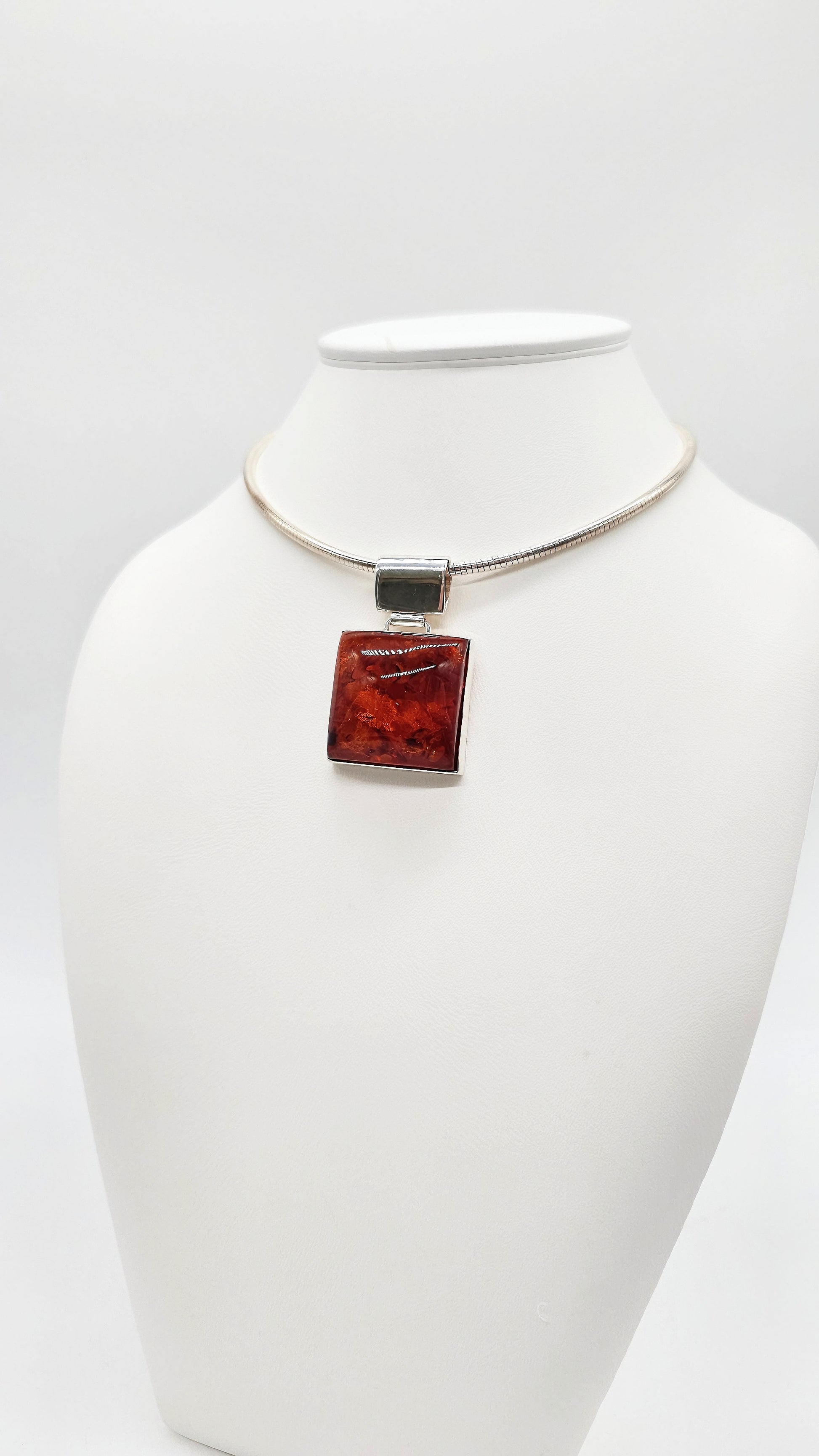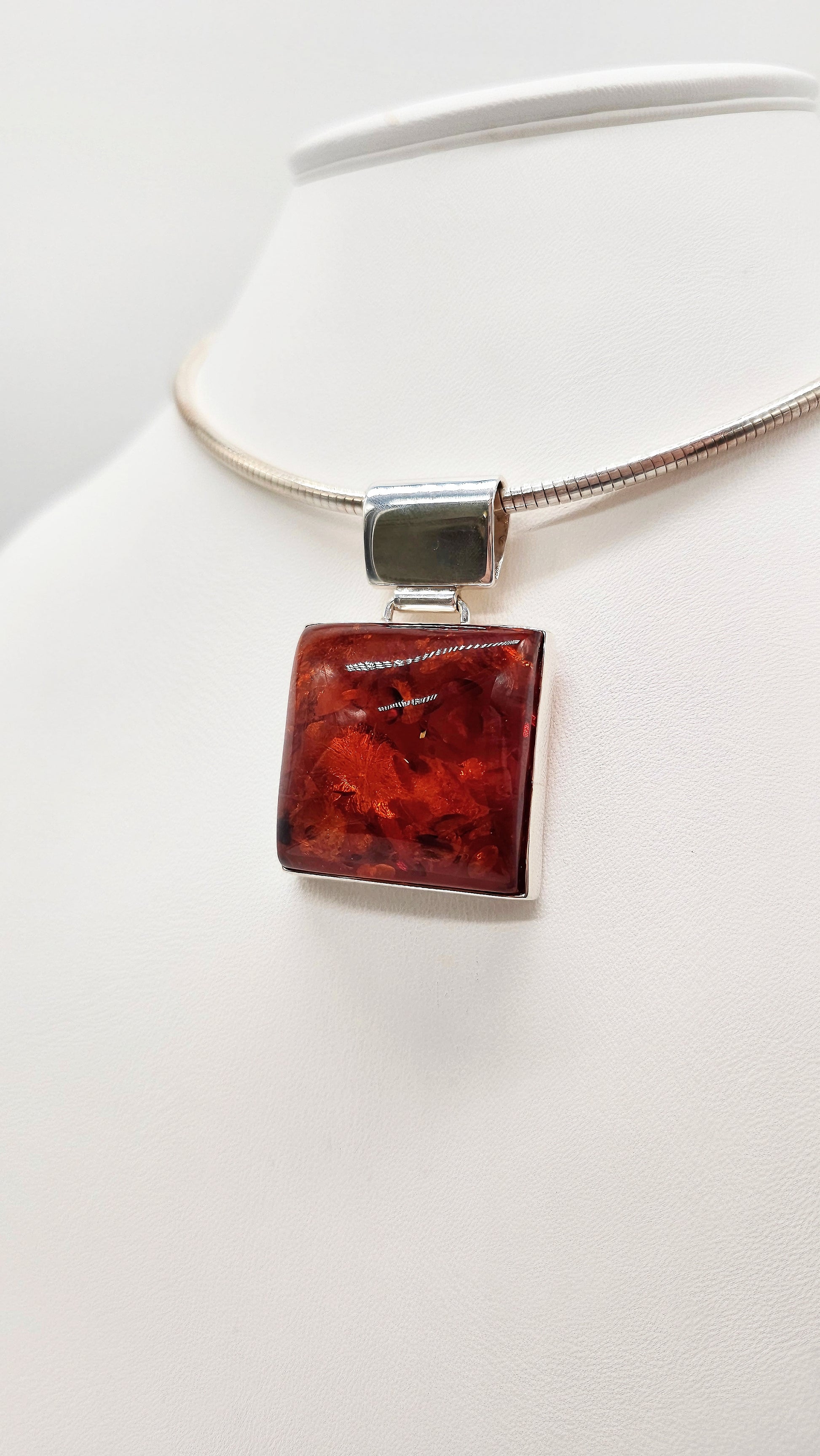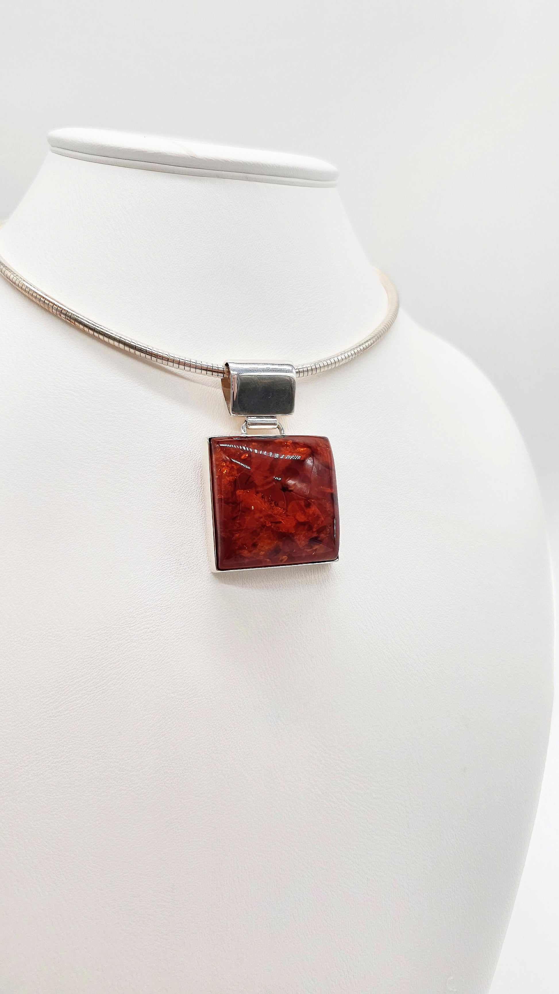 The handcrafted pendant is made of genuine natural amber in an intense, fiery orange hue that shimmers vibrantly depending on the light. Its oval shape is framed in an elegant 925 silver setting that perfectly accentuates the rich orange. Measuring approximately 5.5 cm long, 2.3 cm wide, and 1.5 cm deep, this pendant is both powerful and stylish.