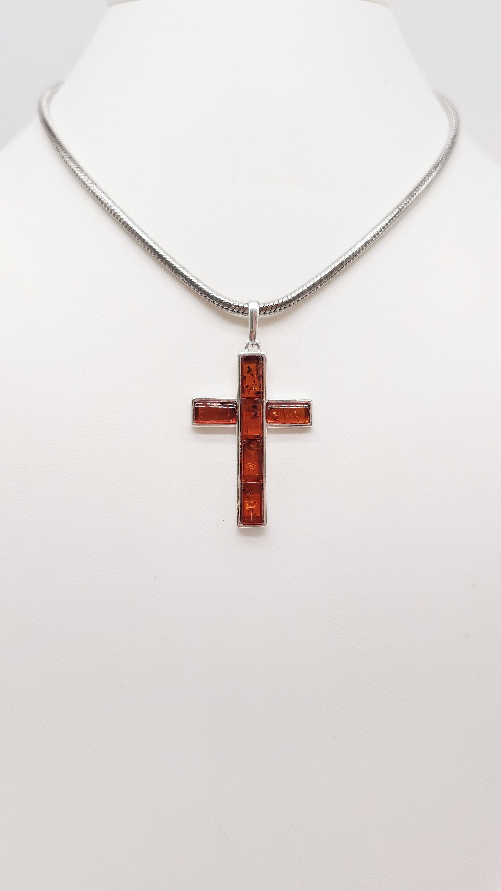 This striking cross pendant crafted from 925 sterling silver combines classic symbolism with a precious natural material. Rectangular segments of genuine, fiery-orange amber are set into the silver, lending the piece depth and radiance. The clean geometric design highlights the amber and lends the pendant a modern yet timeless appeal.