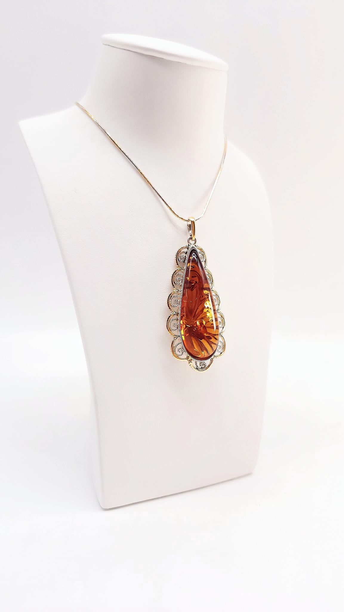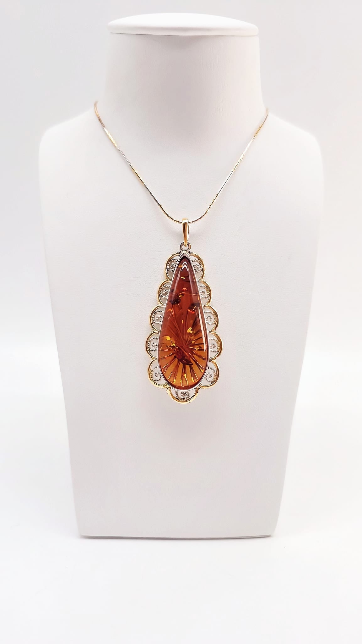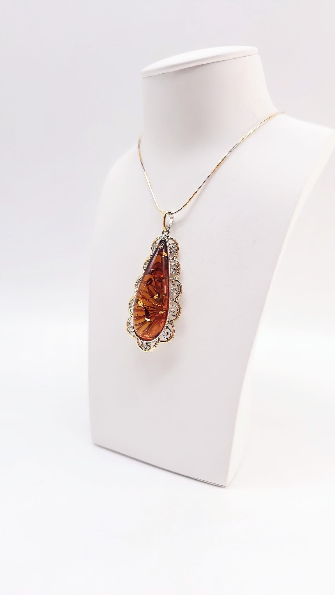 This exclusive pendant, crafted from genuine natural amber and solid 925 sterling silver, combines classic elegance with modern design accents. The polished surfaces and sleek, yet expressive design with gold accents give the piece a particularly refined appeal.
