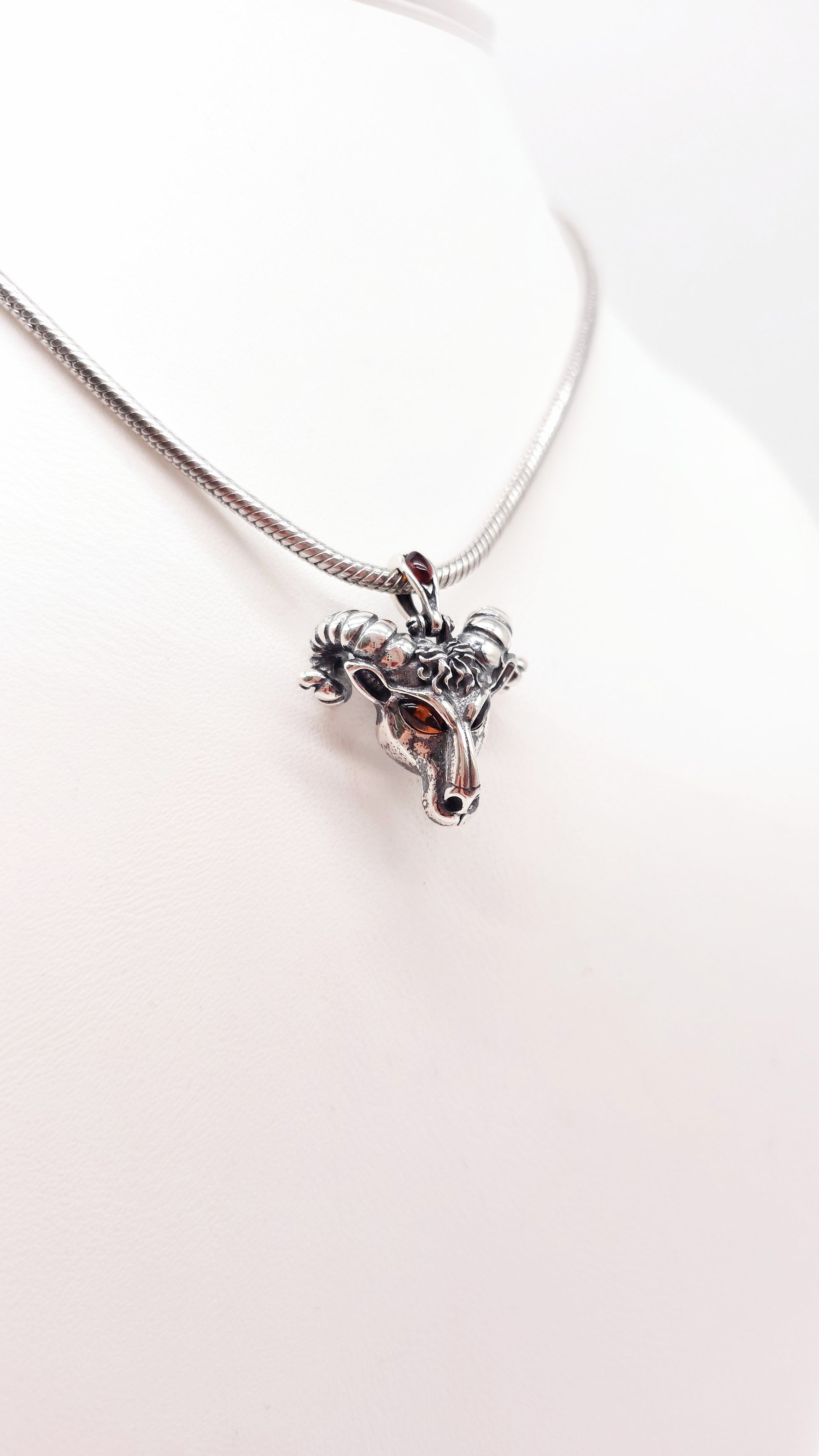 Aries represents courage, determination, and drive – precisely what is reflected in this powerful piece of jewelry. The dark patina of the silver beautifully highlights the warm hue of the amber, making this pendant an expressive companion for both men and women .