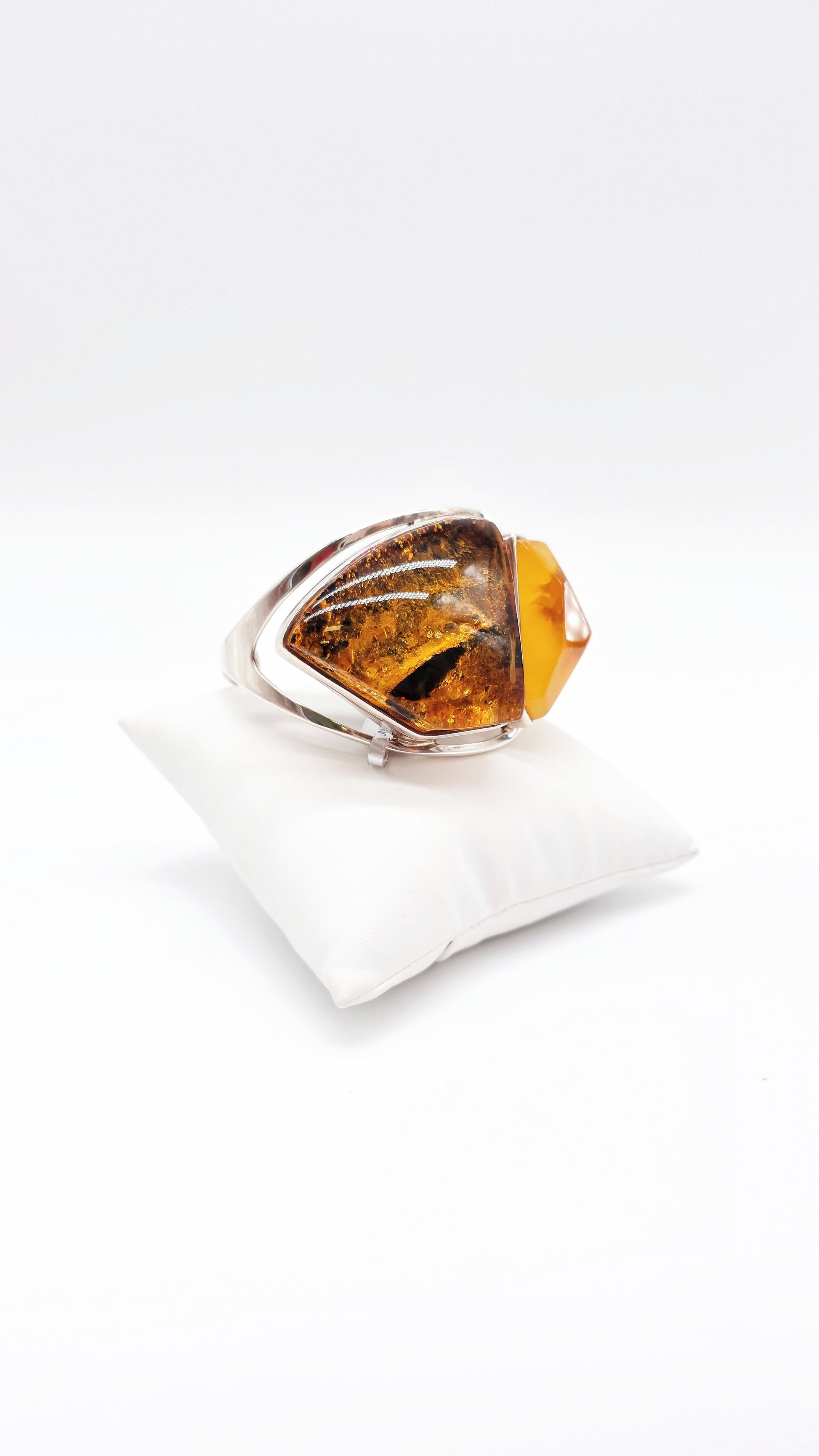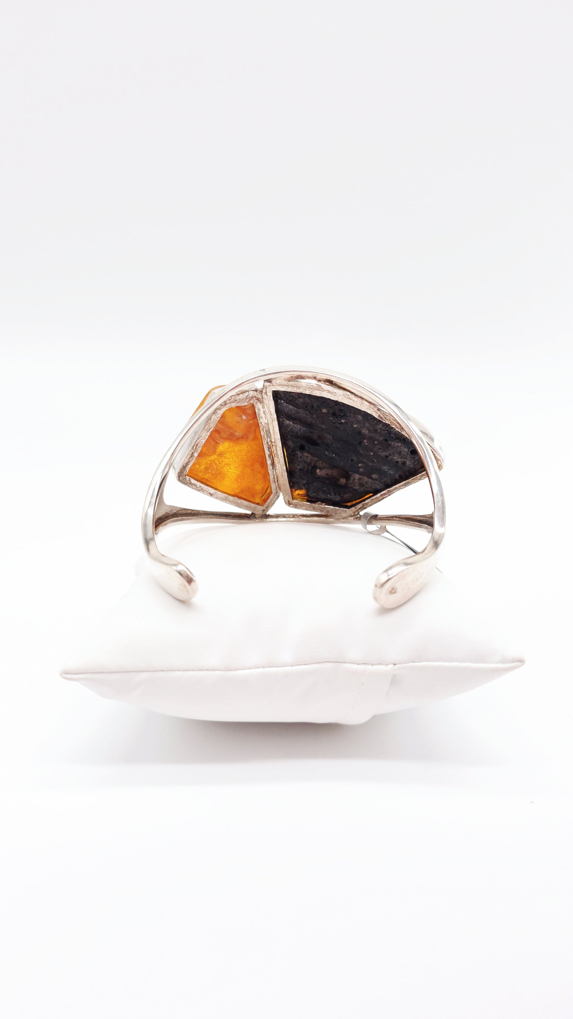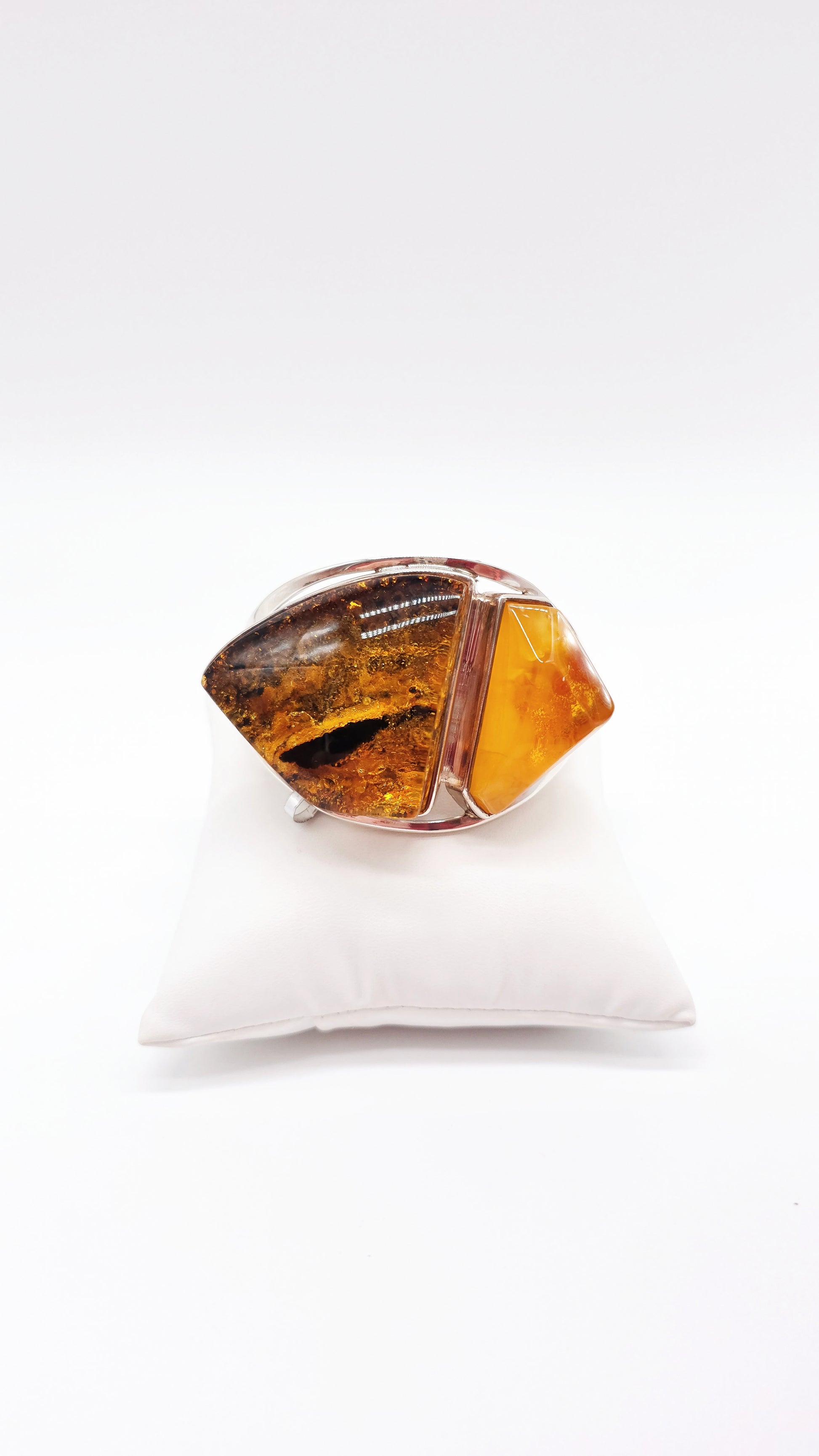 This extraordinary silver bracelet for women impresses with its unique design and the powerful radiance of genuine natural amber . The handcrafted bangle made of high-quality 925 sterling silver combines two large, fascinatingly textured amber stones in warm honey and cognac tones.