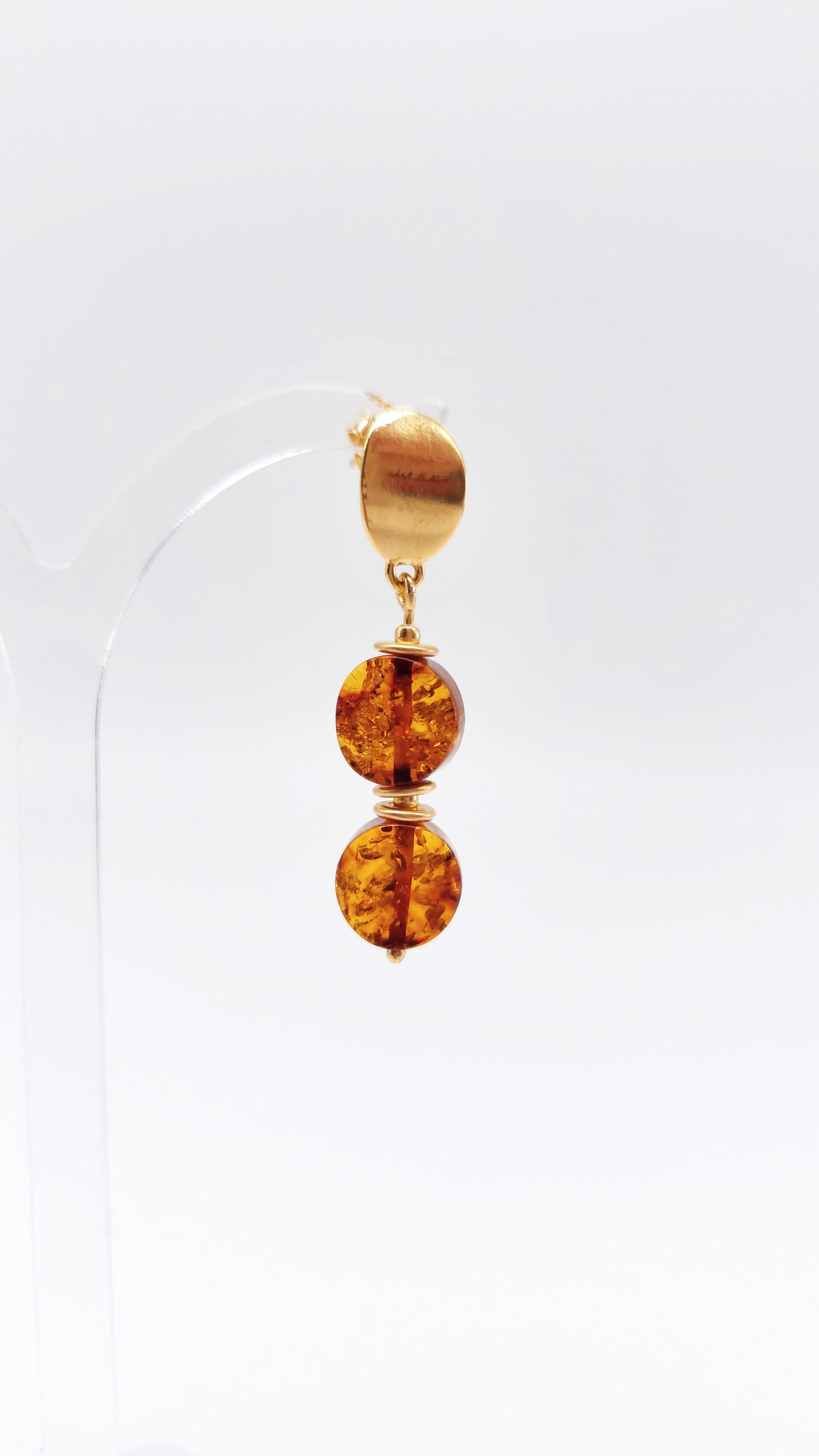 These elegant earrings with two round, clear-faceted amber elements captivate with their warm radiance and understated elegance. The golden sheen of the gold-plated 925 sterling silver lends the earrings a refined finish, while the genuine natural amber shines with its characteristic honey-colored luster.