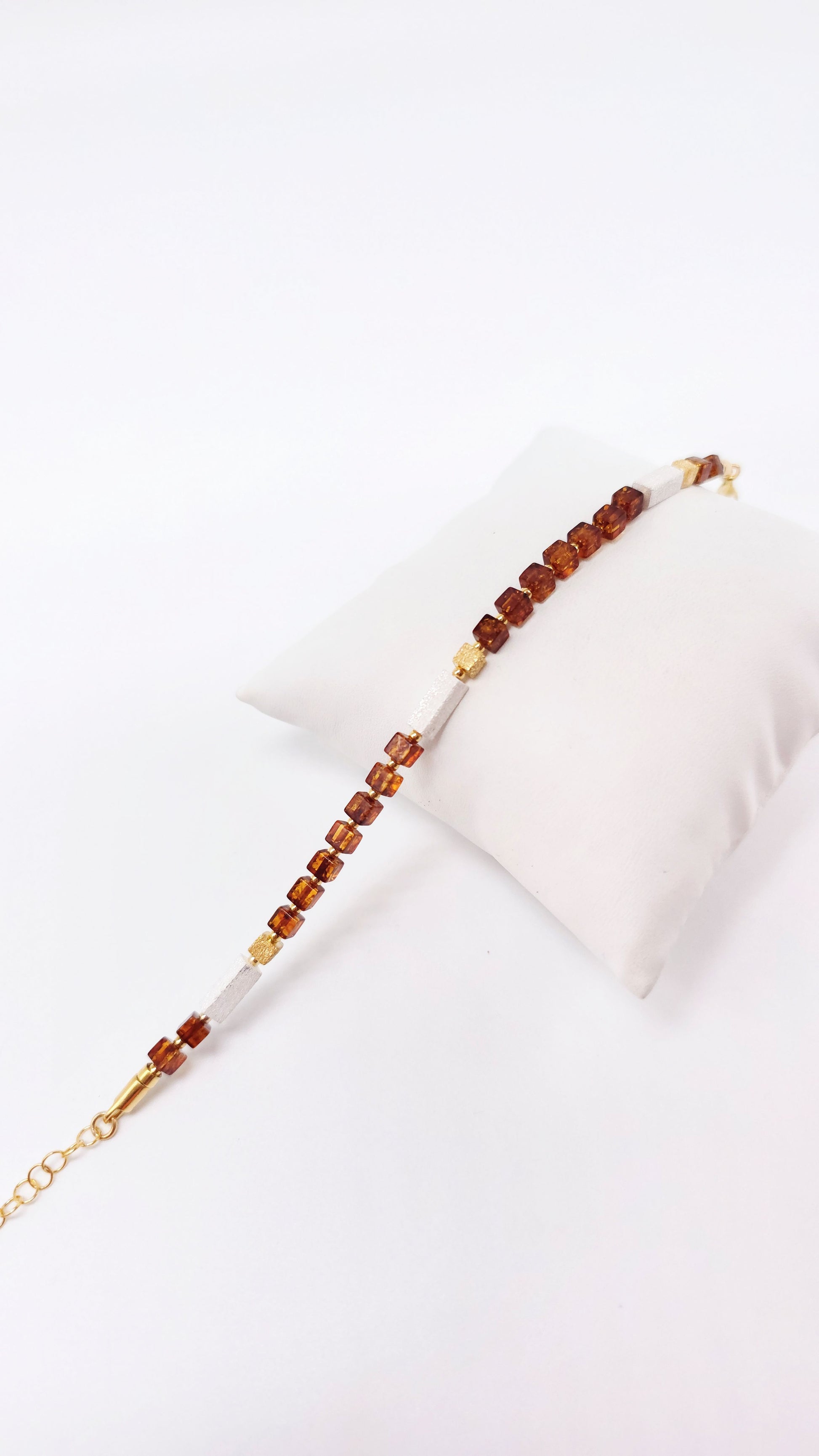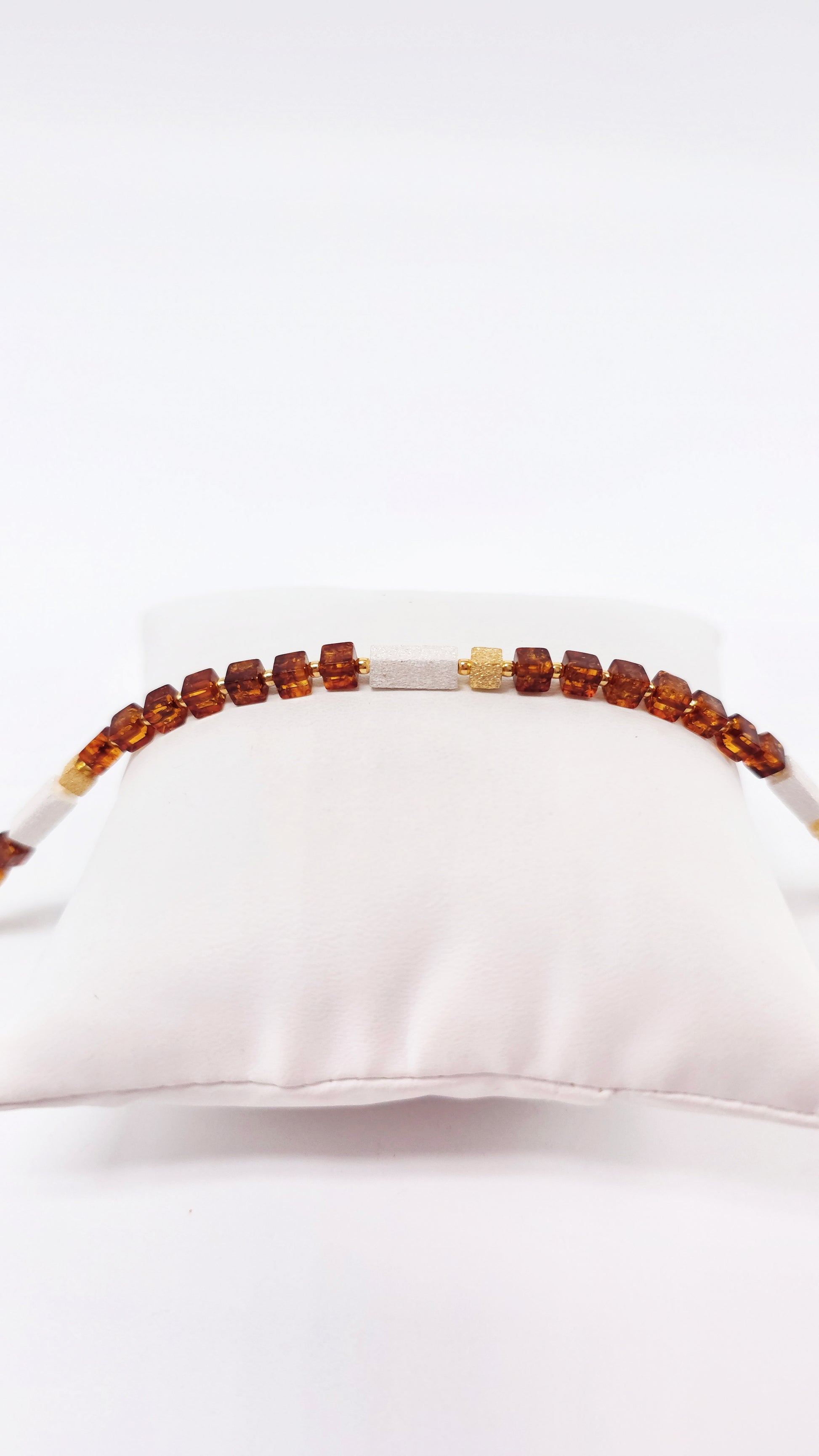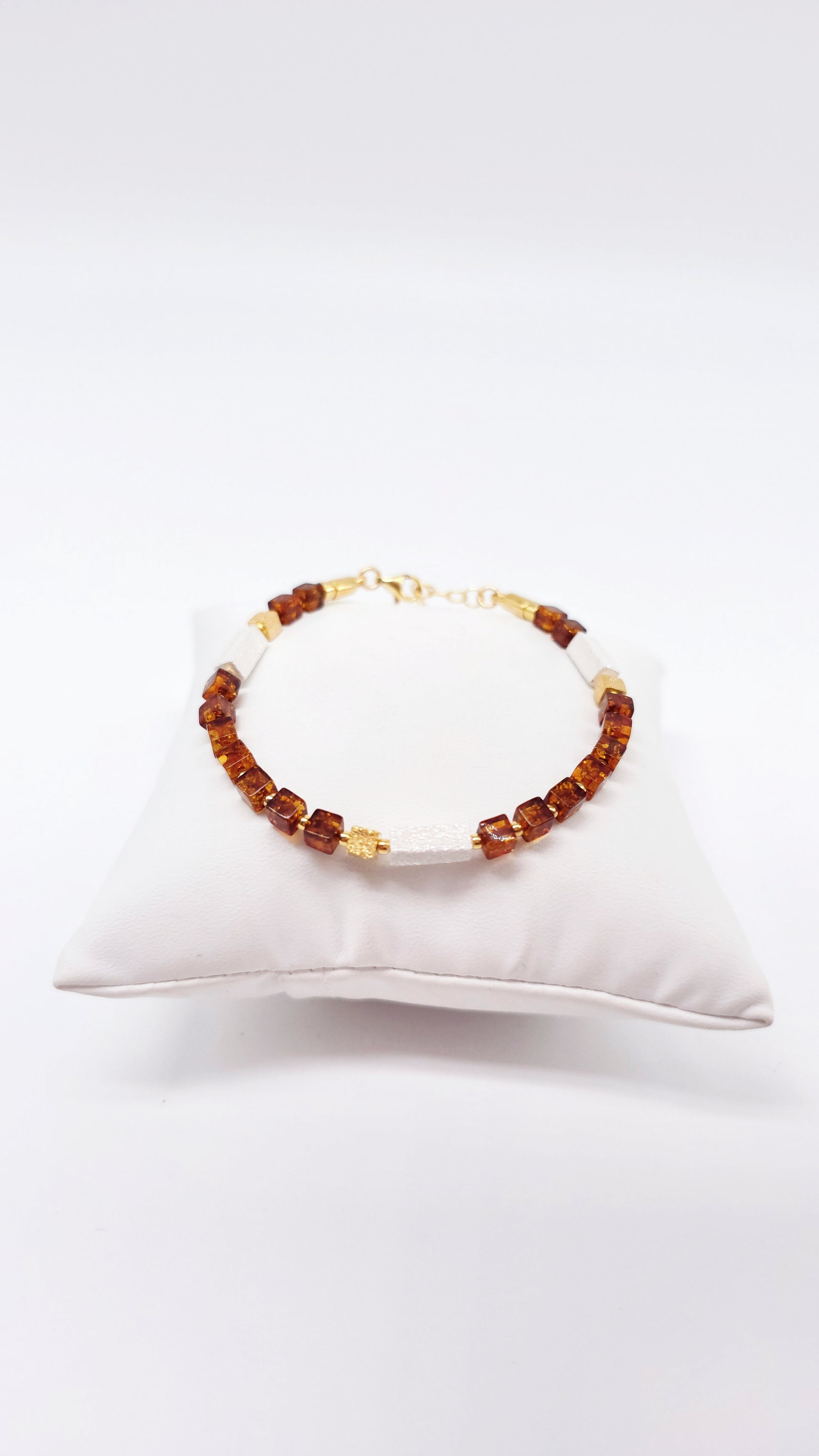 This elegant amber bracelet combines natural beauty with high-quality craftsmanship. The finely cut, cubic amber stones in a warm cognac hue are stylishly complemented by gold-tone accents and light, elongated stones.