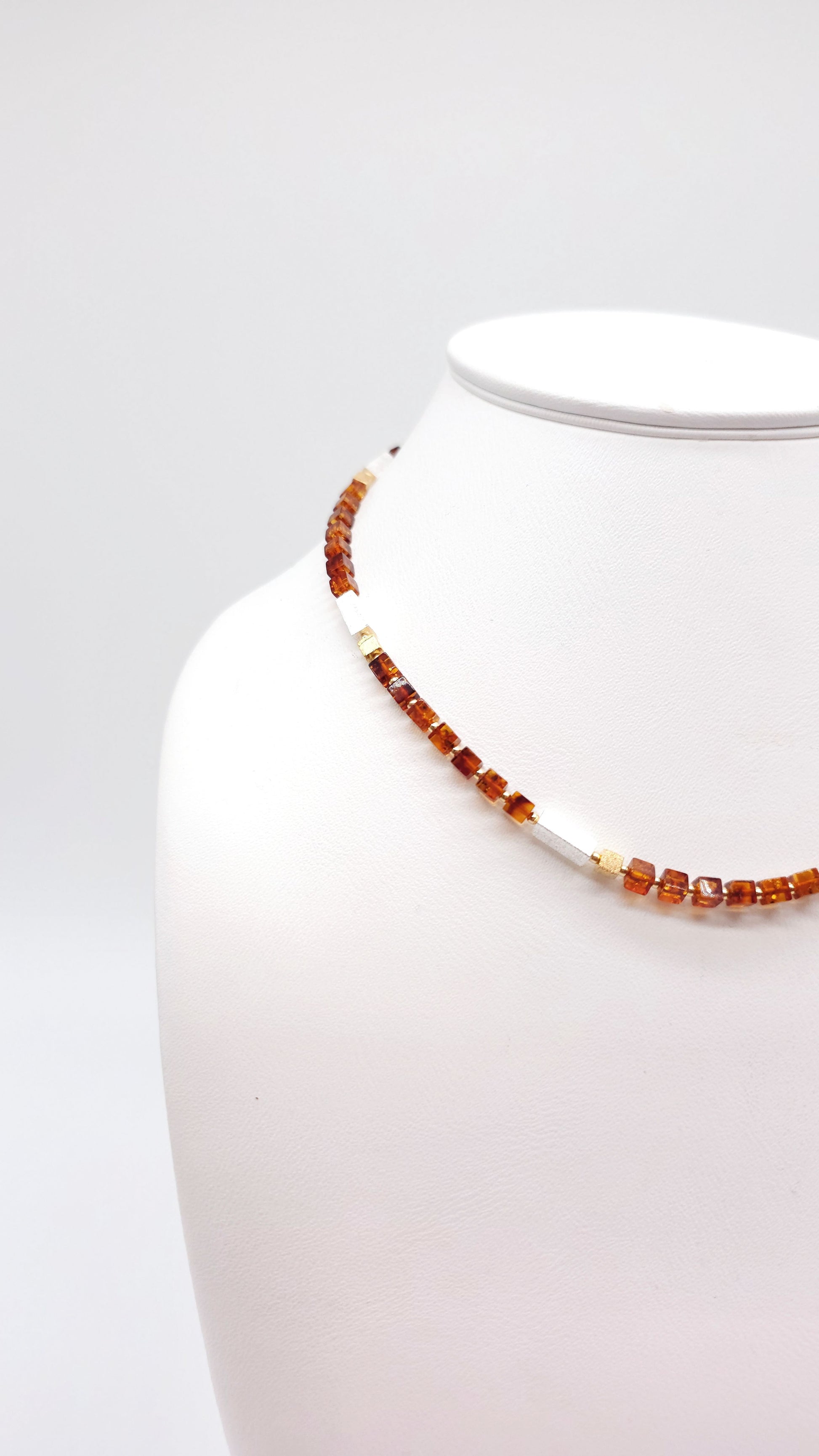 This delicate necklace captivates with stylish elegance and delicate craftsmanship. The small, carefully cut amber cubes in a warm cognac tone are rhythmically combined with gold-plated and silver spacers made of 925 sterling silver. The interplay of natural tones and elegant metal accents gives the piece a modern lightness. With a length of 45 cm plus a 4 cm extension, the necklace can be individually adjusted. The practical lobster clasp ensures a secure fit. A timeless accessory for special occasions or as a stylish gift.