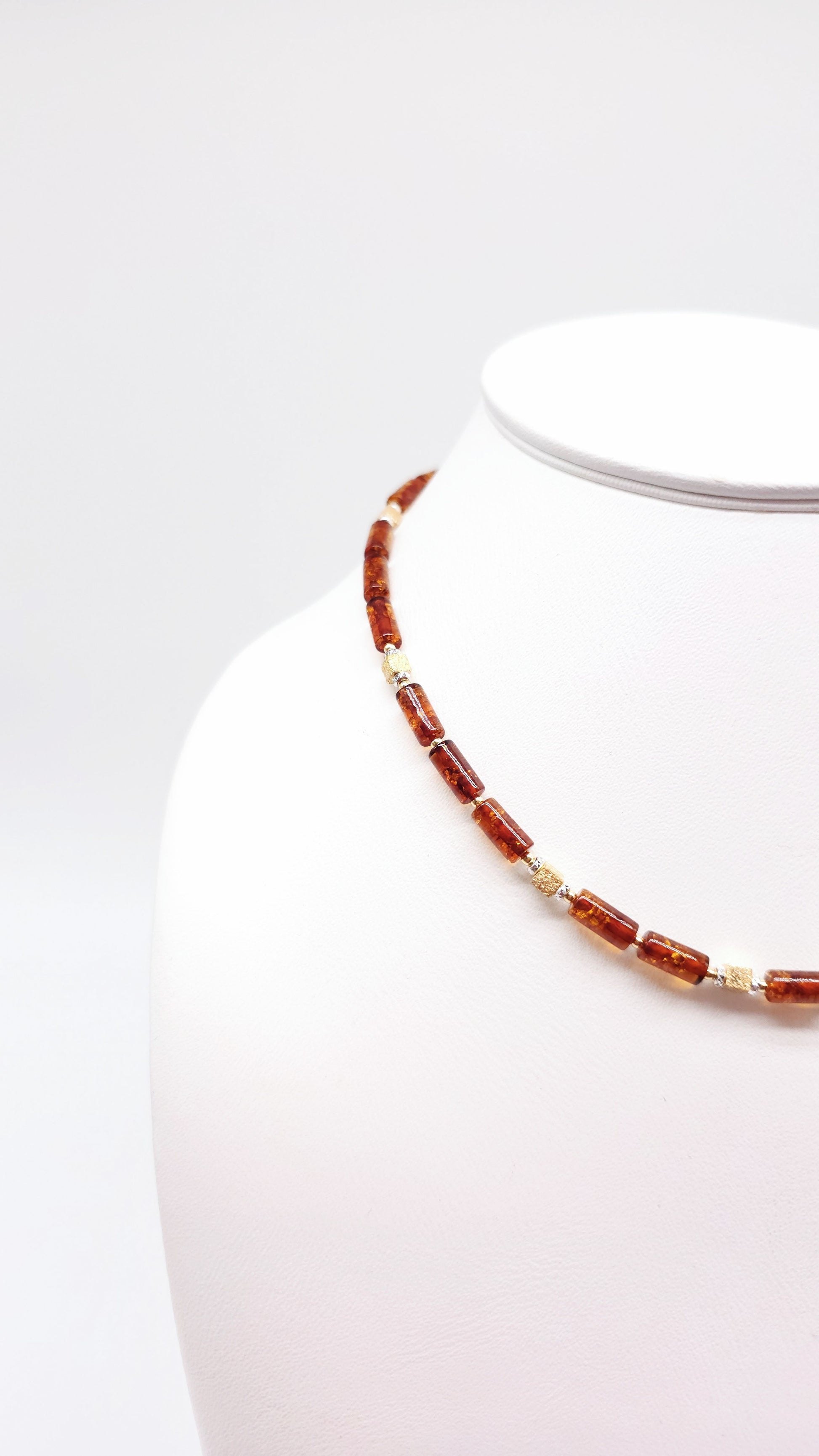 This exquisite, handcrafted amber necklace is a unique piece that combines timeless elegance with high-quality design. The cylindrical amber elements in a warm cognac tone are stylishly combined with gold-plated 925 silver spacers, creating a harmonious overall look. With a length of approximately 42 cm plus a 4 cm extension, the necklace can be adjusted to fit your individual needs and fastens with a secure lobster clasp.