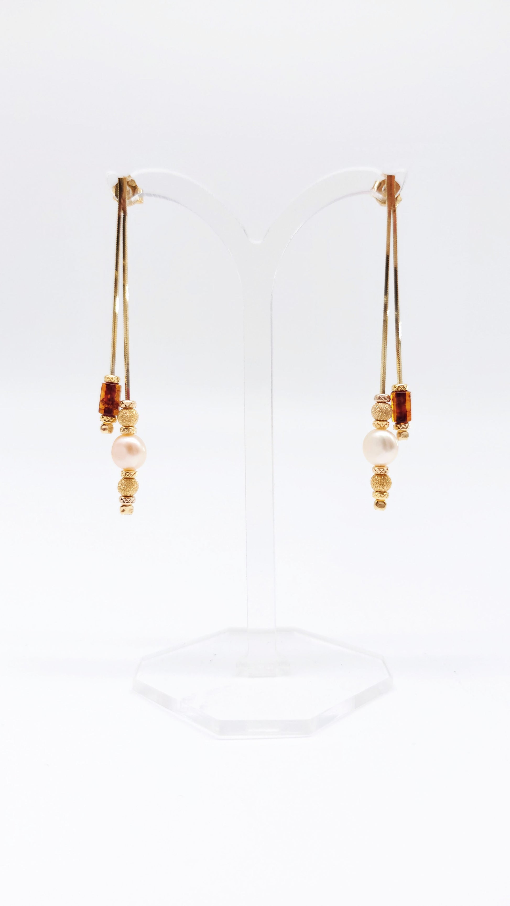 These long, delicate earrings combine the warm radiance of genuine amber with the classic elegance of genuine sea pearls. The 24-carat gold-plated elements provide a luxurious finish, while the minimalist design adds a touch of sophistication. Whether worn with a chic evening dress or as a stylish everyday accent, this pair will skillfully showcase any wearer. Ideal as a gift for women who love natural stone jewelry or for special occasions such as birthdays, Christmas, or Mother's Day.