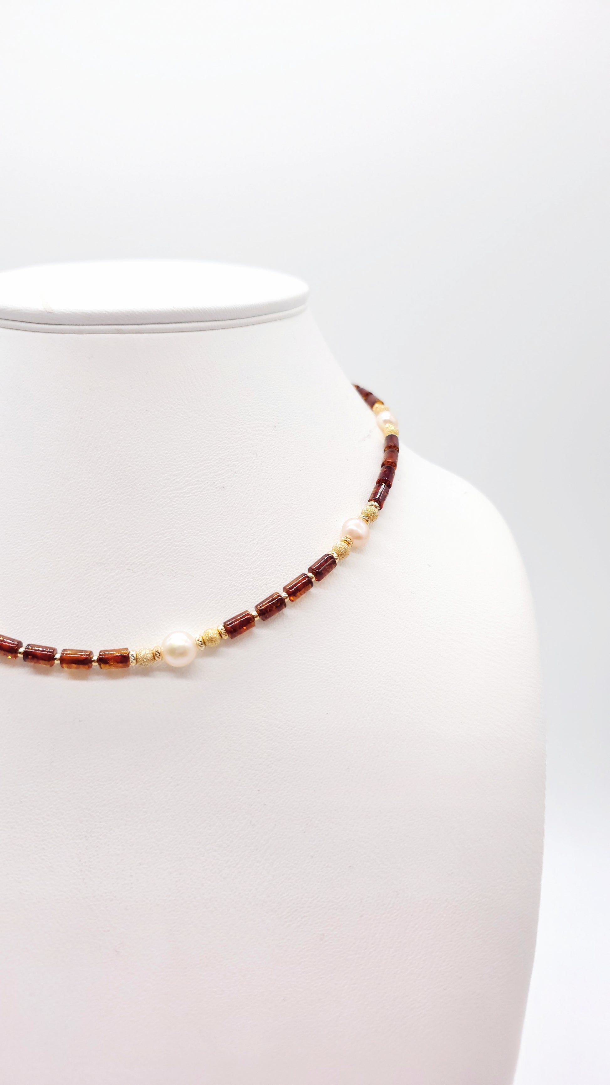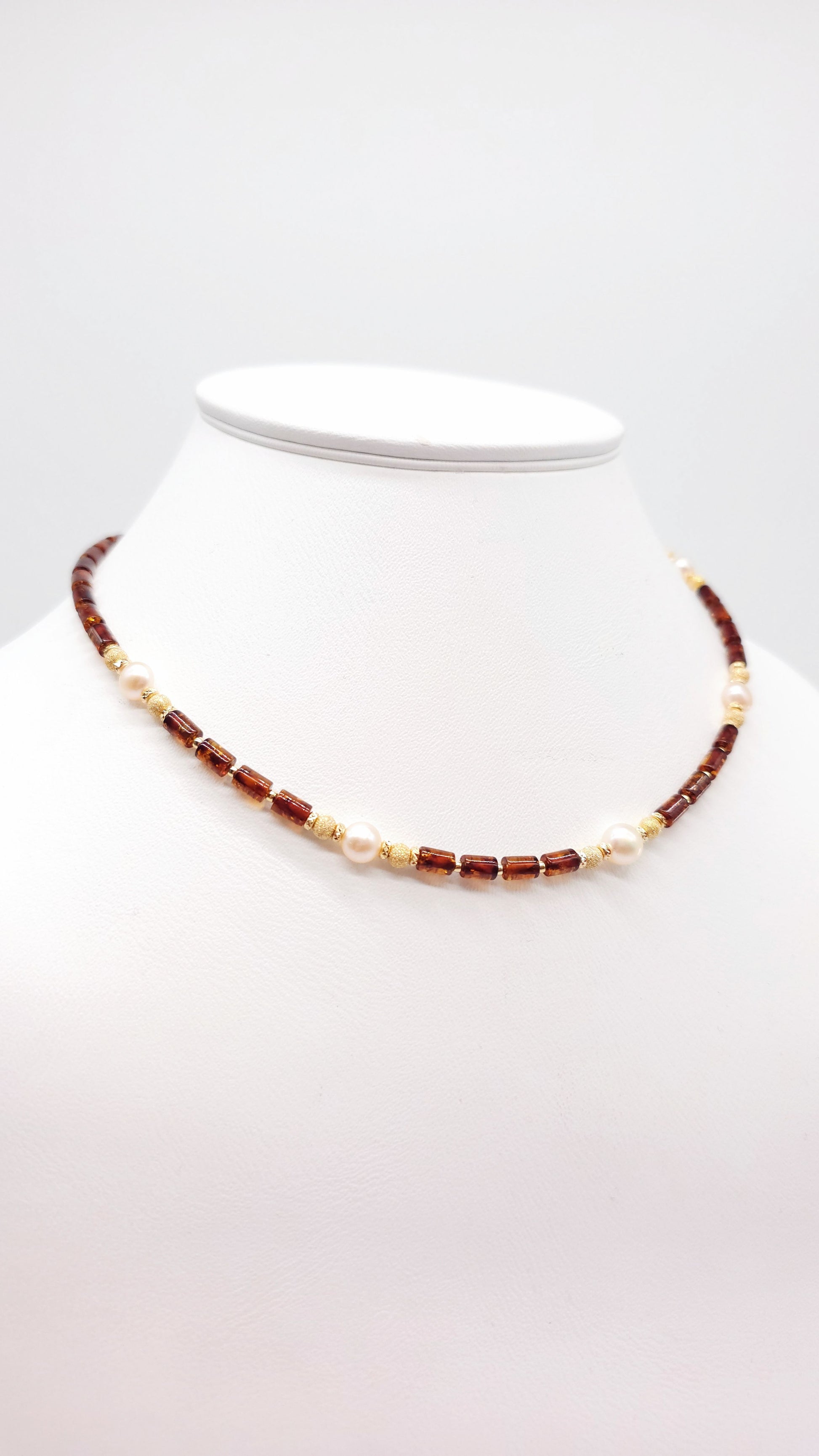 Natural amber, freshwater pearls, gold-plated 925 sterling silver