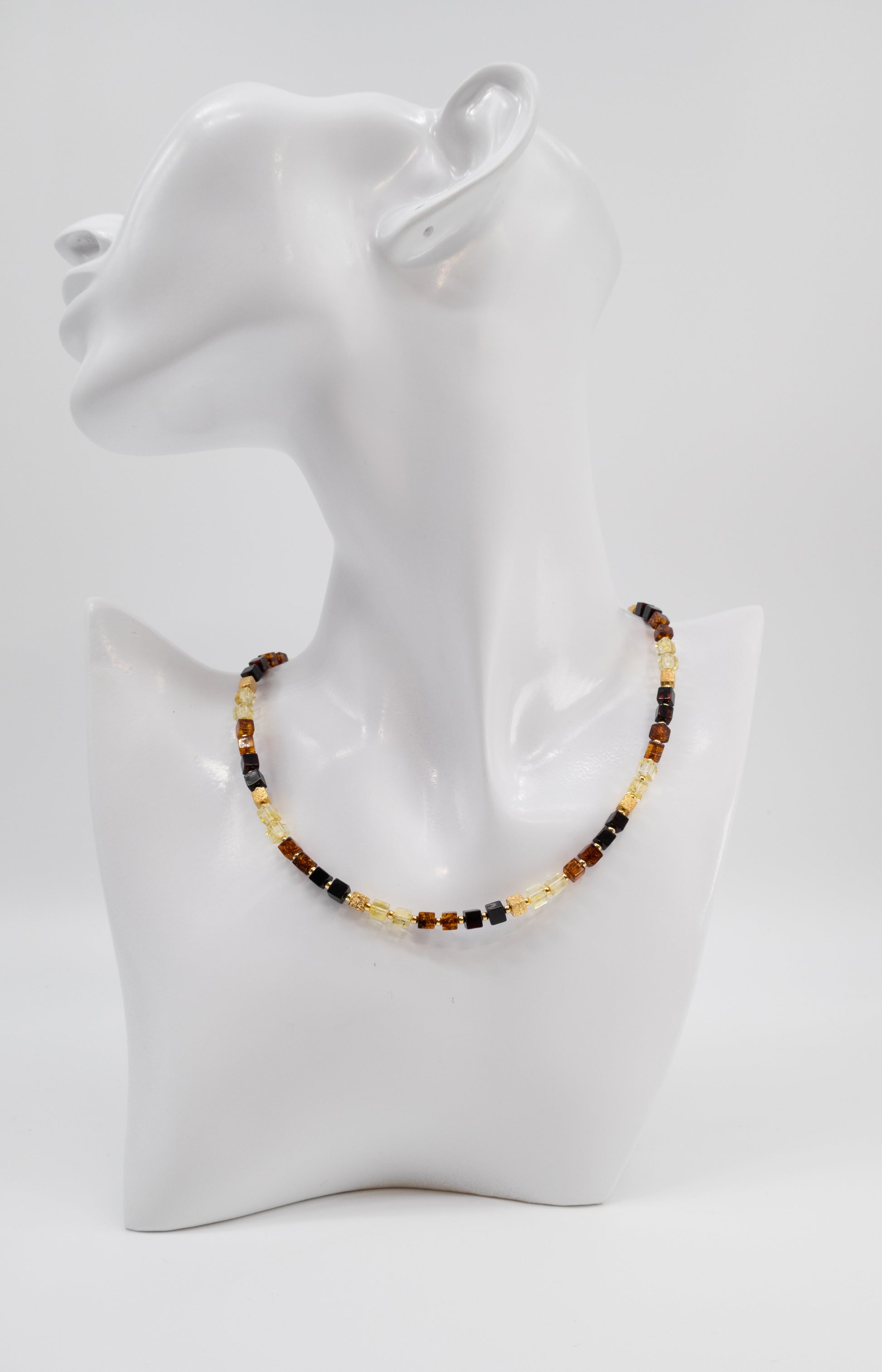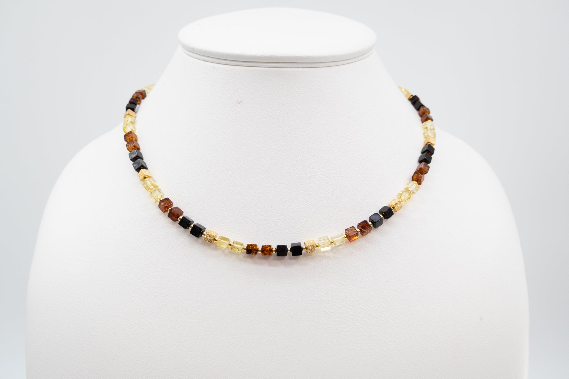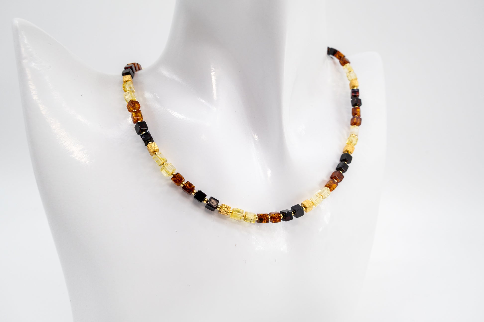 This elegant gold-plated necklace with genuine amber impresses with its harmonious color variety and high-quality craftsmanship. The finely faceted amber cubes in various shades combined with gold-plated silver give the necklace a modern yet sophisticated look. With a length of 40 cm plus a 4 cm extension, it sits perfectly around the neck and enhances any style—whether for everyday wear or special occasions. A unique gift for a wife, sister, or girlfriend that will leave a lasting impression.