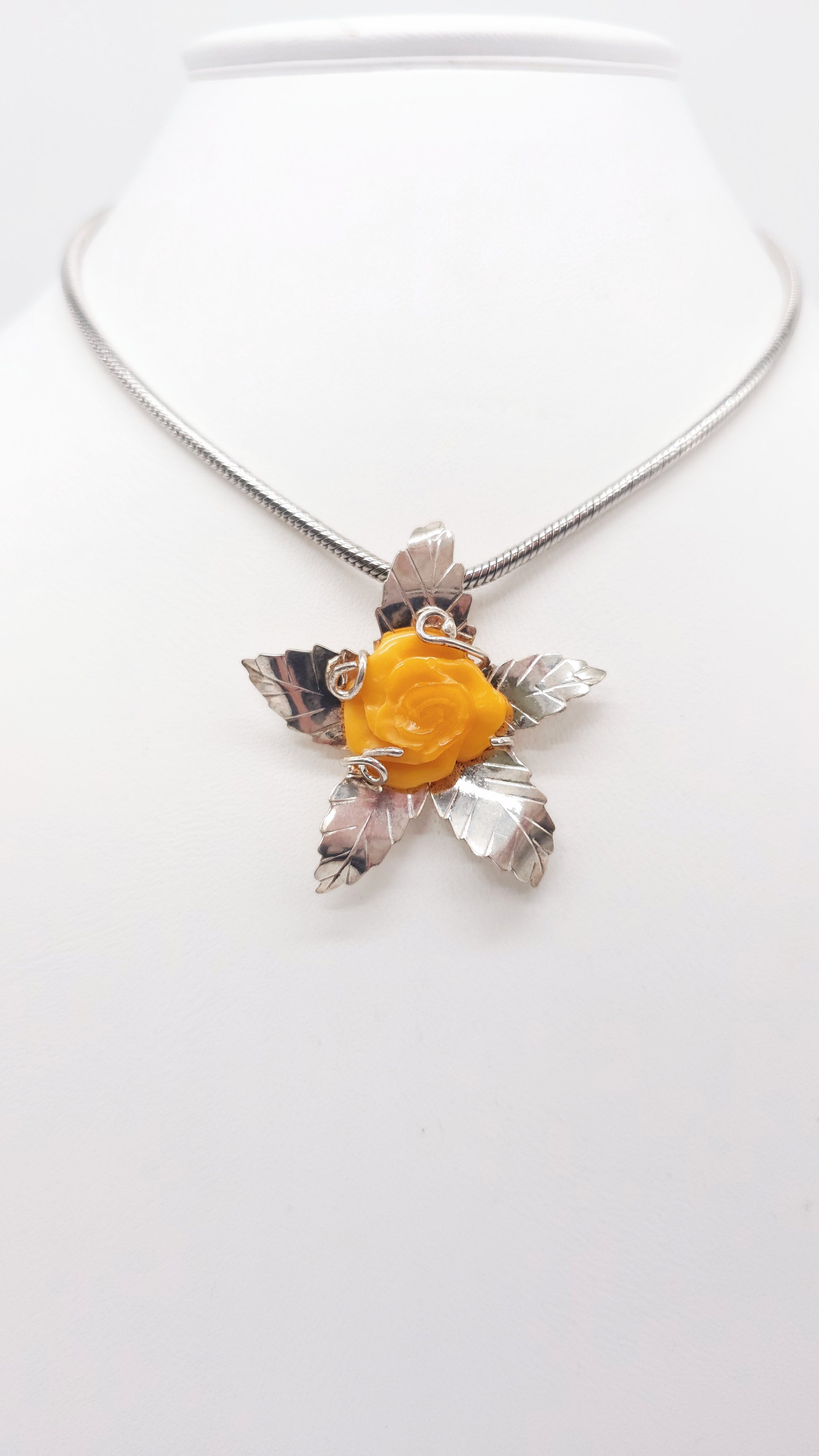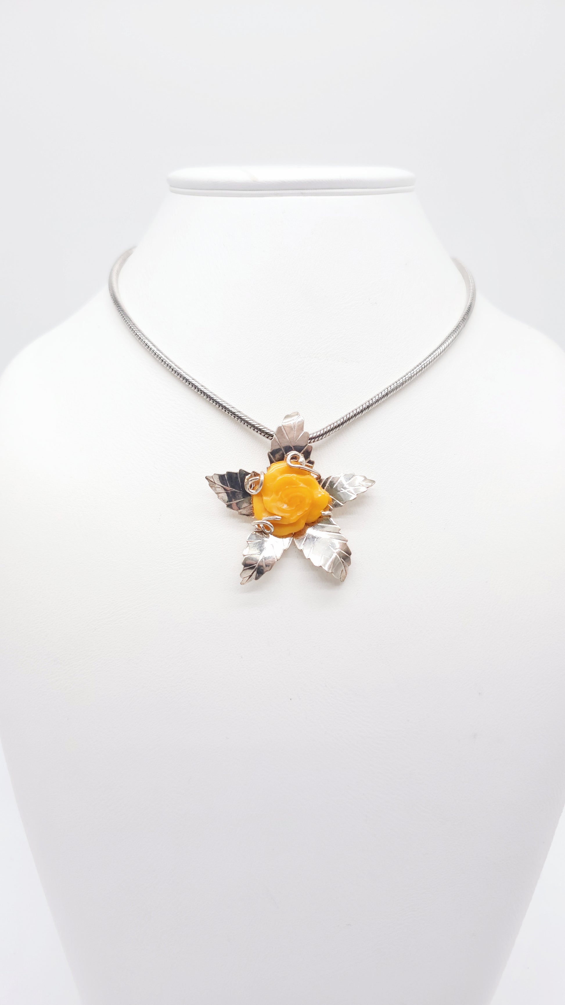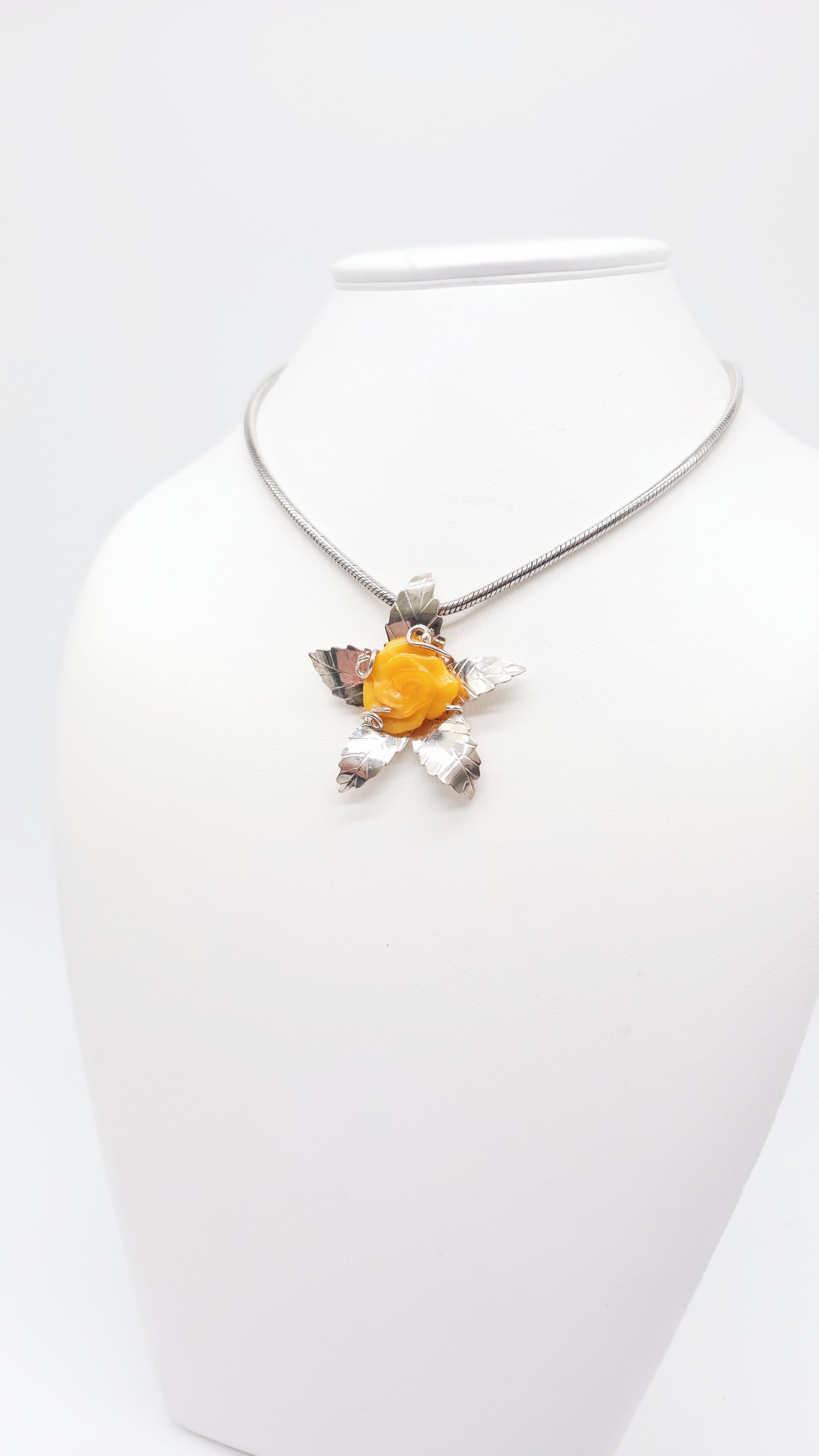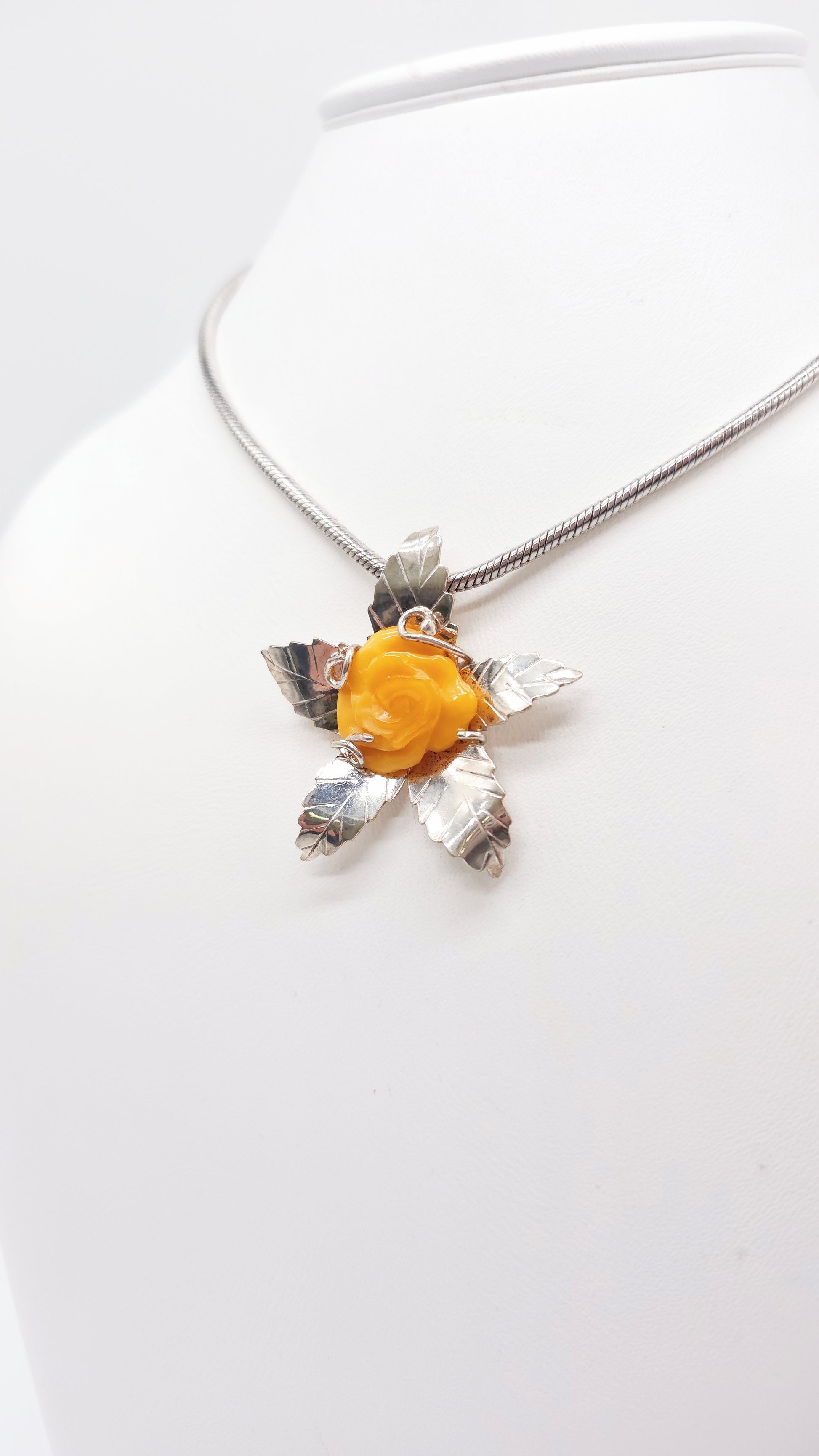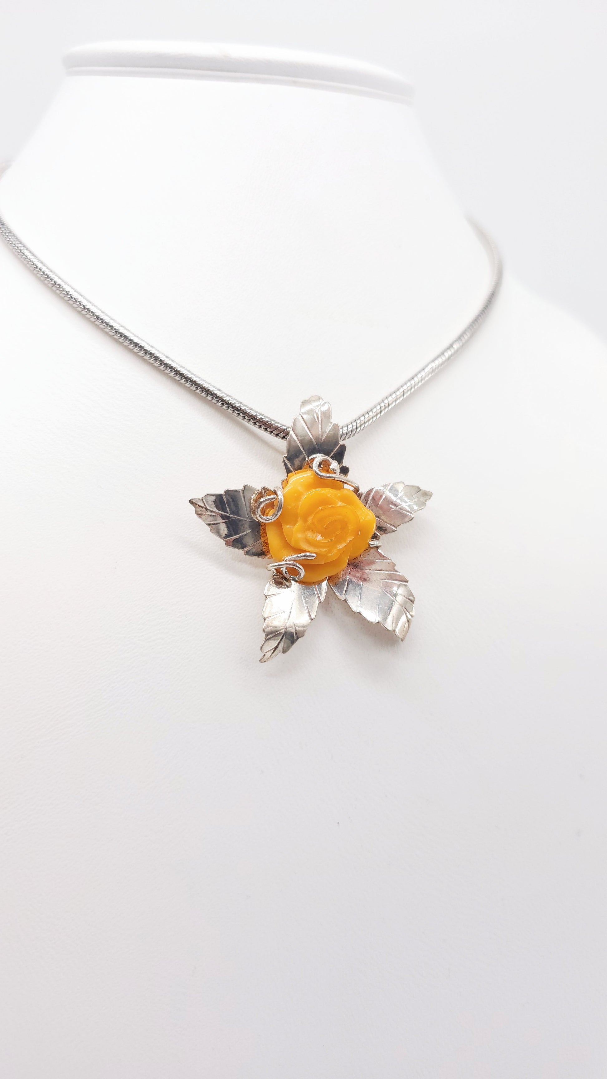 This extraordinary pendant combines nature and craftsmanship at the highest level. The meticulously hand-carved flower is made from a solid piece of precious natural amber—each line of petals is intricately crafted and unique. The flower is framed by artfully designed silver leaves, giving the piece depth and expression. Measuring 5 × 5 cm, this pendant is a true statement piece. An ideal gift for a special someone—be it for a birthday, anniversary, Mother's Day, or simply as a loving token of appreciation.