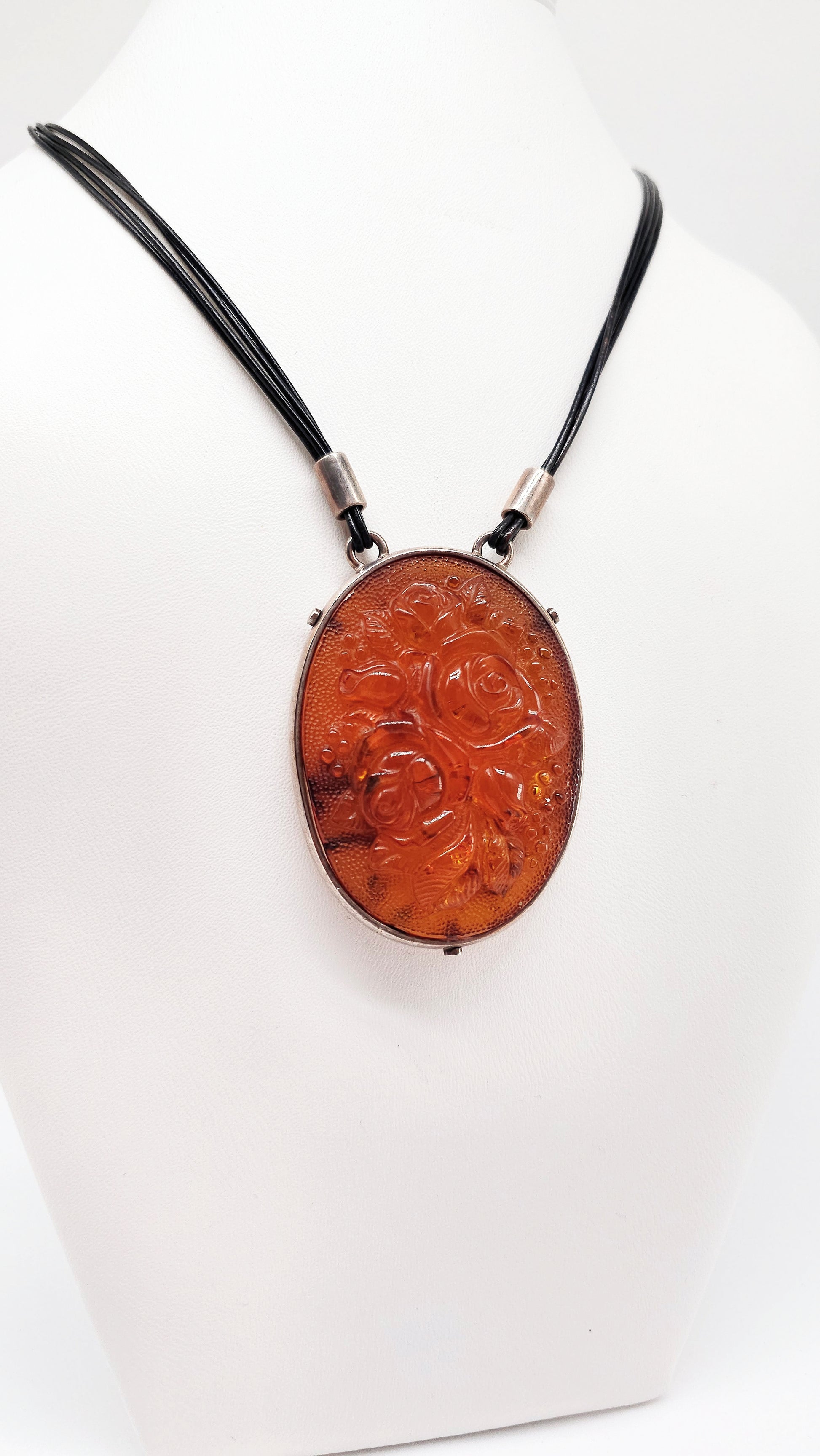A true masterpiece of nature and craftsmanship: This extraordinary amber pendant impresses with a delicate 3D rose motif engraved directly into the amber. Every glance reveals new details of the artistic floral composition, making this piece of jewelry truly unique.
