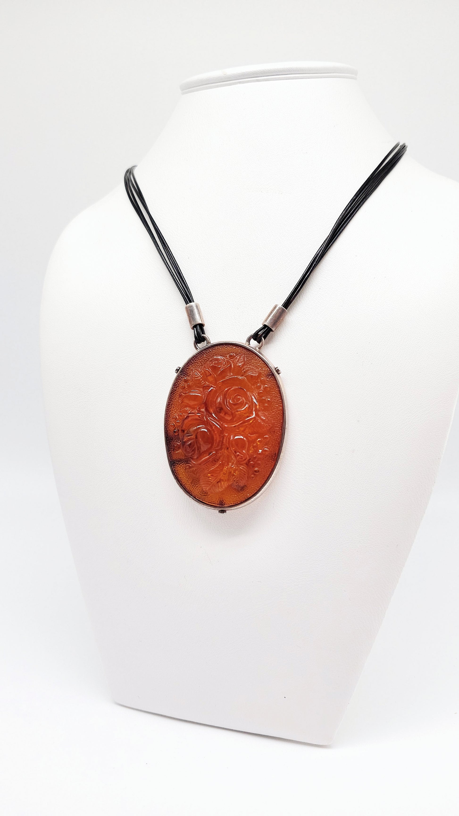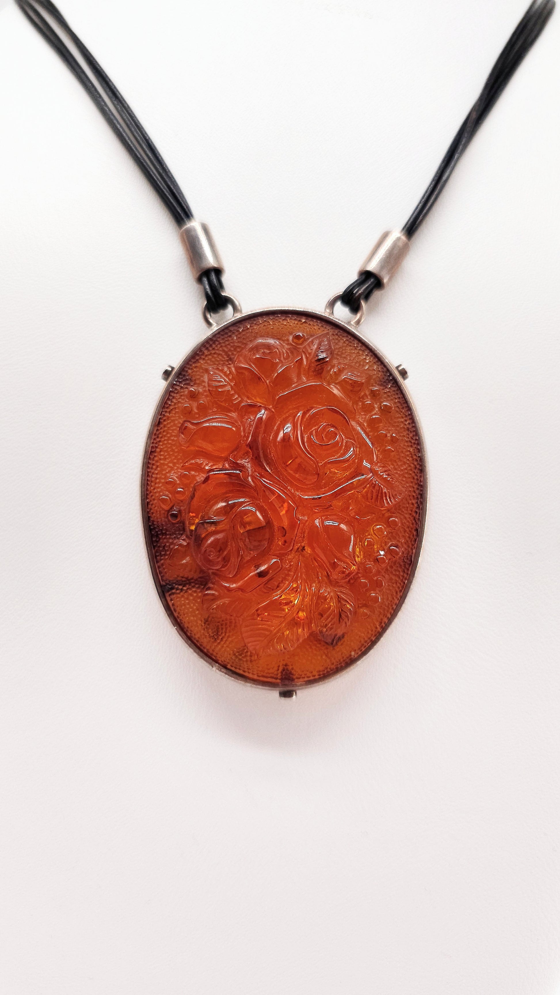 3D roses in amber – pendant with leather chain