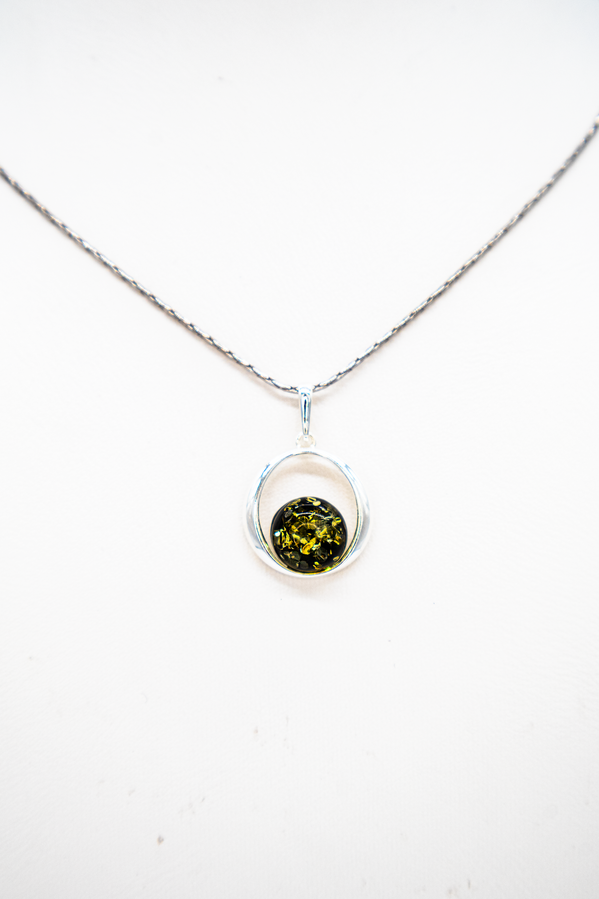 Handcrafted pendant with round amber in an open silver setting – a stylish companion with timeless elegance.