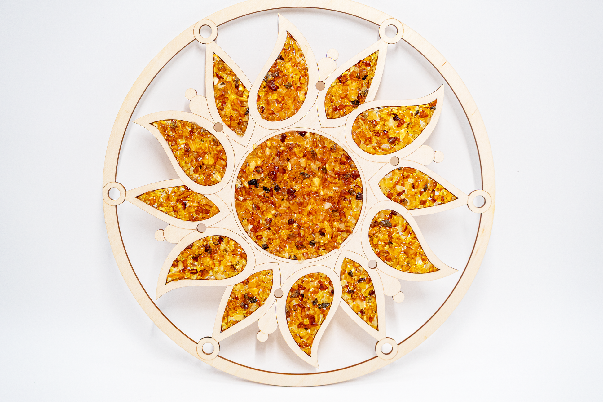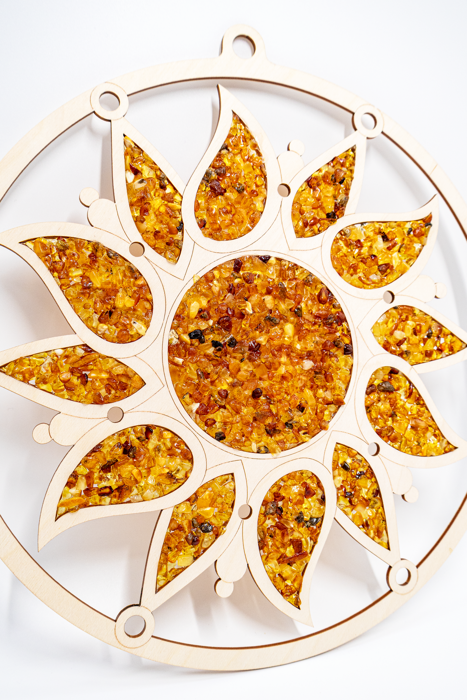 This handcrafted wooden sun picture with genuine amber chips is a radiant eye-catcher for any wall. The unique combination of teardrop or blossom shapes and luminous amber creates a warm, harmonious atmosphere. With a diameter of 30 cm, this natural artwork is ideal for the living room, entryway, or bedroom. It can be easily hung from a hook or string. Each piece is lovingly crafted and unique, making it a perfect gift for a birthday, moving, or special occasion.